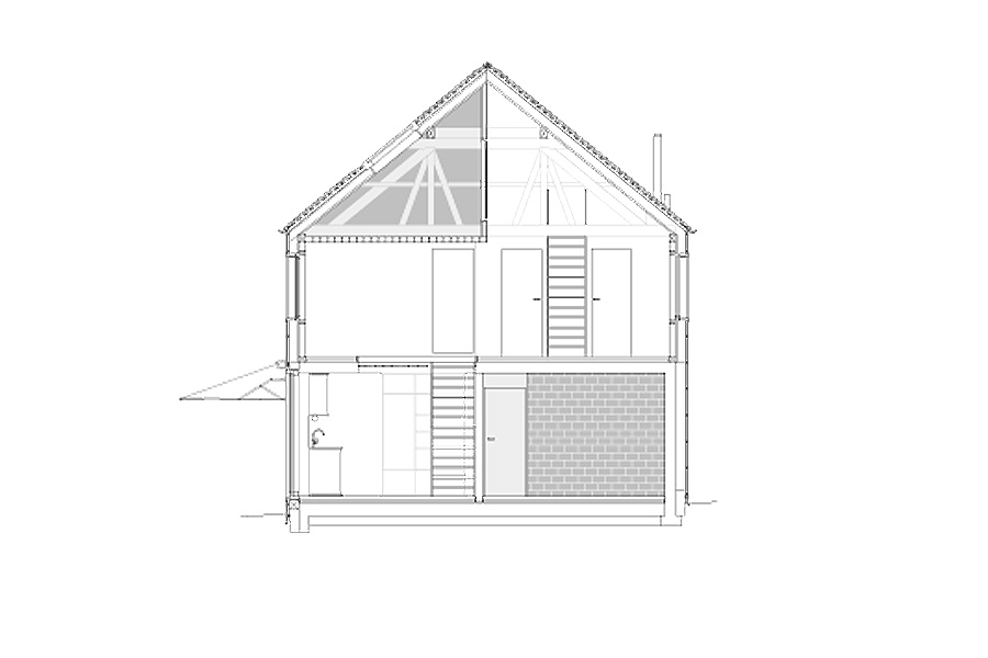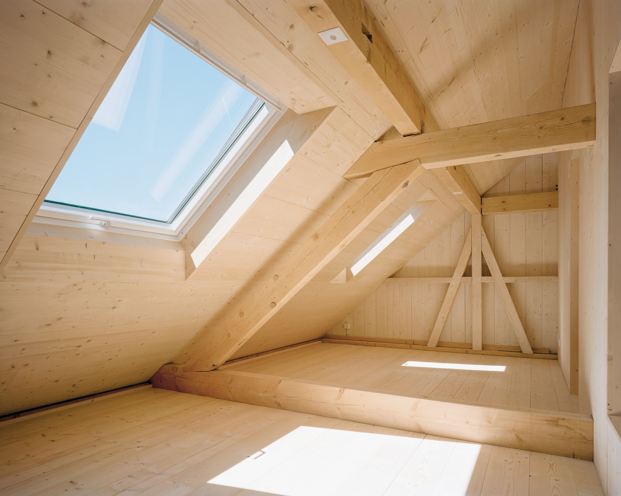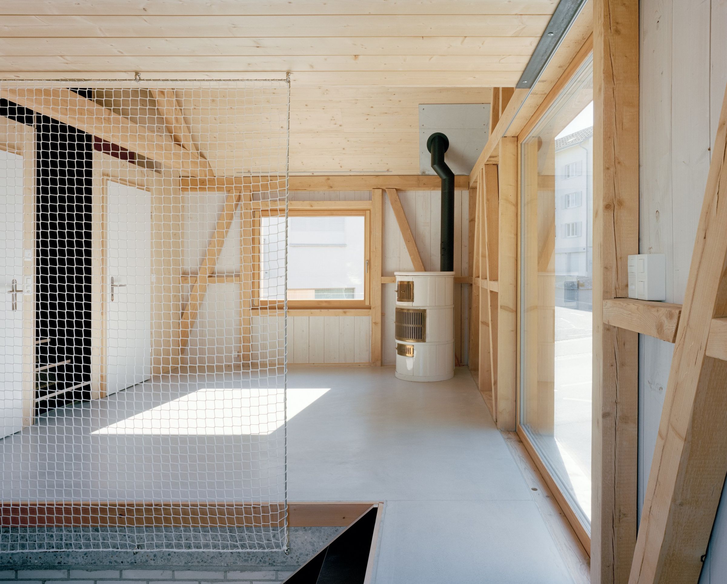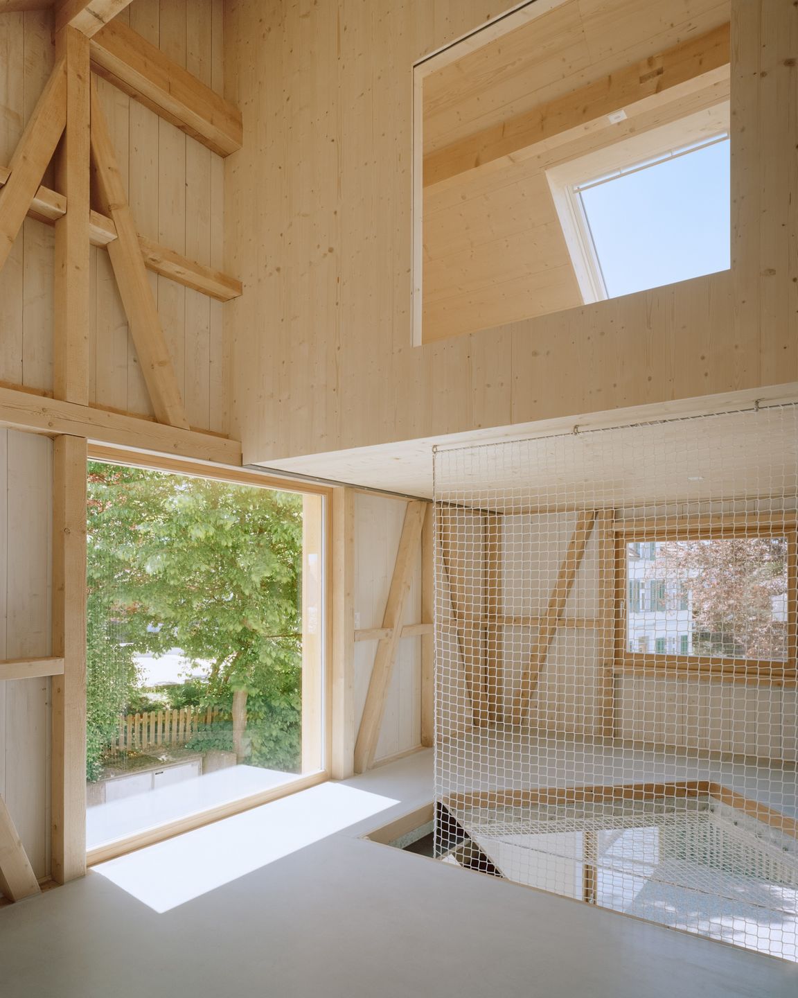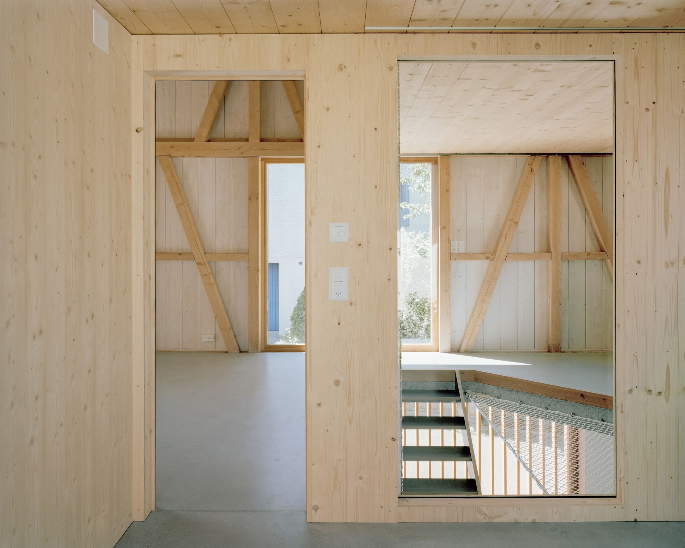 W dawną konstrukcję wozowni wpisano trzy kondygnacje mieszkalne – jedna nad drugą, z pokojami i strefami mokrymi, które tworzą pionową przestrzeń życiową o spiralnym układzie. Duże, drewniane okna otwierają dom na otoczenie i pozwalają na przenikanie naturalnego światła. Brak korytarzy i sekwencyjny układ wnętrz, inspirowany japońską architekturą, tworzy harmonijną przestrzeń bez zbędnych podziałów. Kleines Haus wykonany jest z naturalnych materiałów – drewna, włókna drzewnego i wełny owczej. Te ekologiczne komponenty gwarantują zdrowy mikroklimat oraz bardzo dobrą izolację termiczną. Dom nie jest podpiwniczony z uwagi na wysoki poziom wód gruntowych. Niewielka objętość budynku oznacza nie tylko niskie zapotrzebowanie na energię, ale również niskie koszty ogrzewania. Ciepło zapewnia piec opalany drewnem, wspomagany przez ogrzewanie podłogowe na łatwym do utrzymania podłożu.