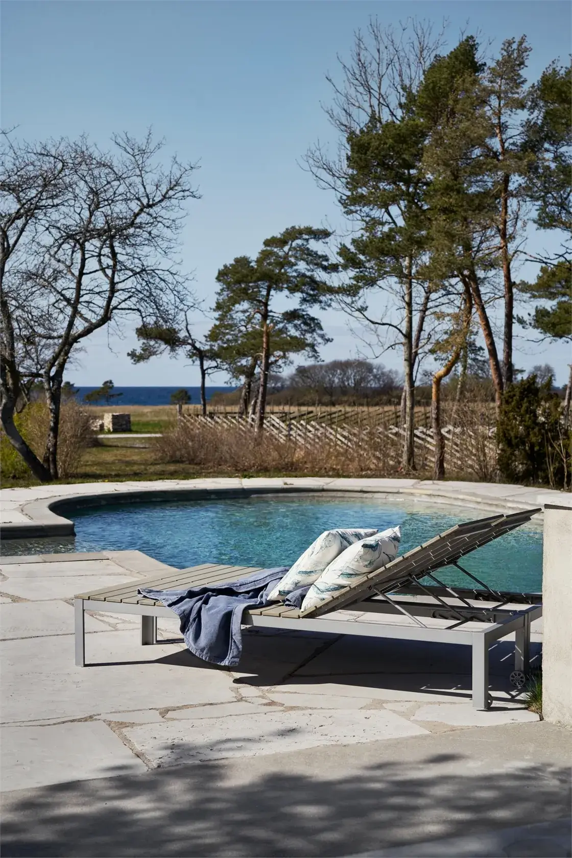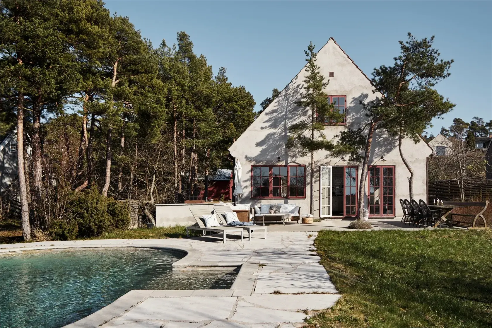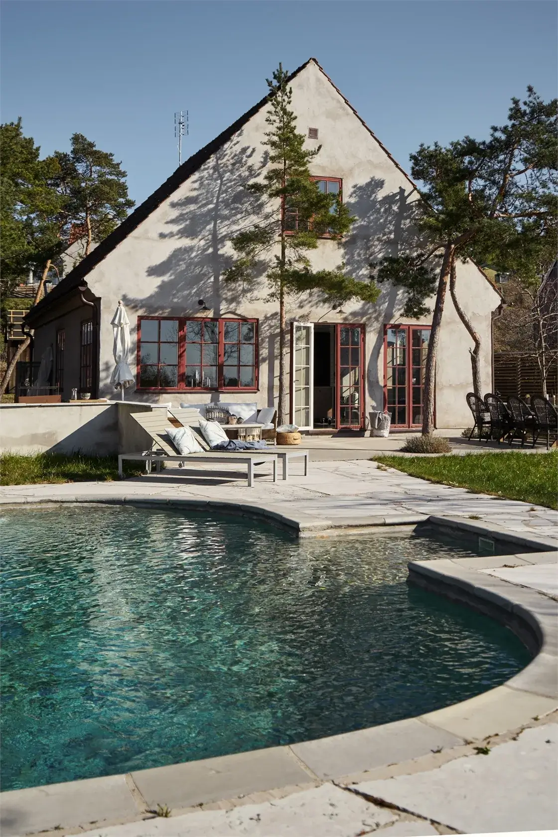 Nowoczesna willa ma piękną otynkowaną fasadę z czerwonymi ramami okiennymi. Zaledwie kilka kroków od brukowanego tarasu woda błyszczy w prywatnym basenie. Stąd roztacza się niezakłócony widok na morze. Wewnątrz domu, nowoczesne materiały i wnętrze w stylu skandynawskim sprawiają wrażenie stylowego i przestronnego, wraz z planem piętra socjalnego na dwóch piętrach. Stylowa kuchnia znajduje się pośrodku i staje się sercem domu. Oprócz sypialni w willi, obok głównego budynku znajduje się również domek gościnny z dwiema dodatkowymi sypialniami.