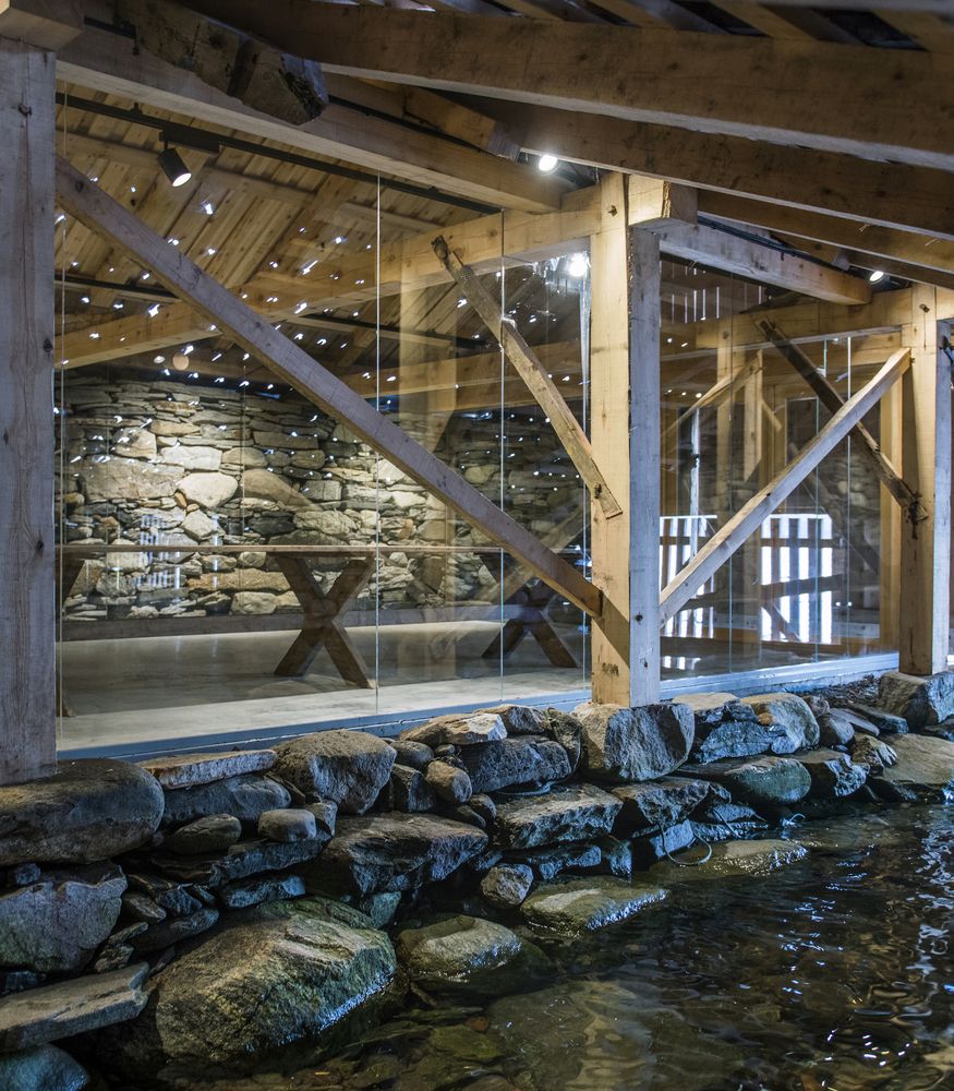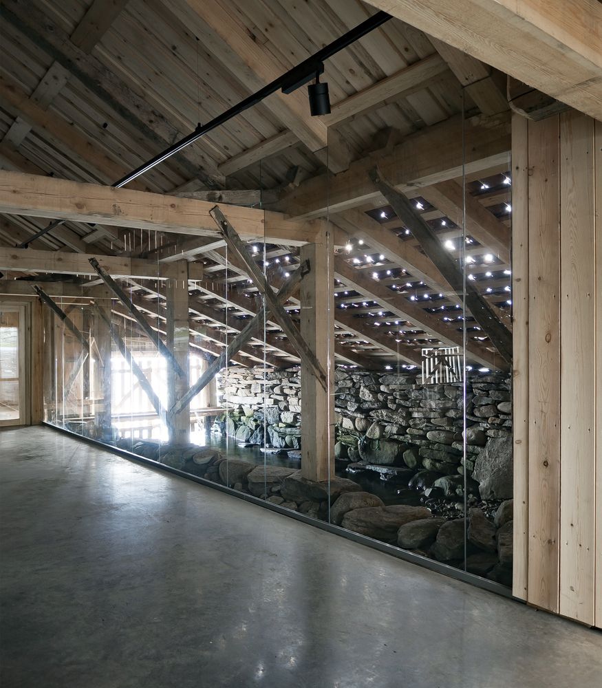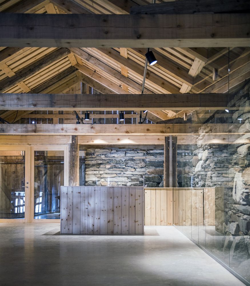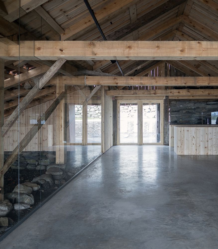 Największym wyzwaniem projektu było wprowadzenie współczesnych udogodnień, takich jak nowoczesne ogrzewanie, przy jednoczesnym zachowaniu oryginalnego charakteru wnętrz i wyglądu zewnętrznego. Architekci zastosowali surowe, trwałe materiały odporne na okresowe podwyższenie poziomu wody, typowe dla tej lokalizacji po zimowych roztopach. Autentyczną atmosferę wnętrza podkreślają laminowane przeszklenia eksponujące stary kamienny mur oraz dach ocieplony w sposób niewidoczny, zachowujący dawną estetykę konstrukcji. Nowe elementy konstrukcyjne uzupełniono zachowanym historycznym drewnem, a podłoga z polerowanego betonu skrywa instalację grzewczą. Ta subtelna adaptacja zabytku, miejscami przywołująca skojarzenia z estetyką taką jak nowoczesna stodoła, stanowi przykład harmonijnego dialogu między przeszłością a współczesną architekturą.