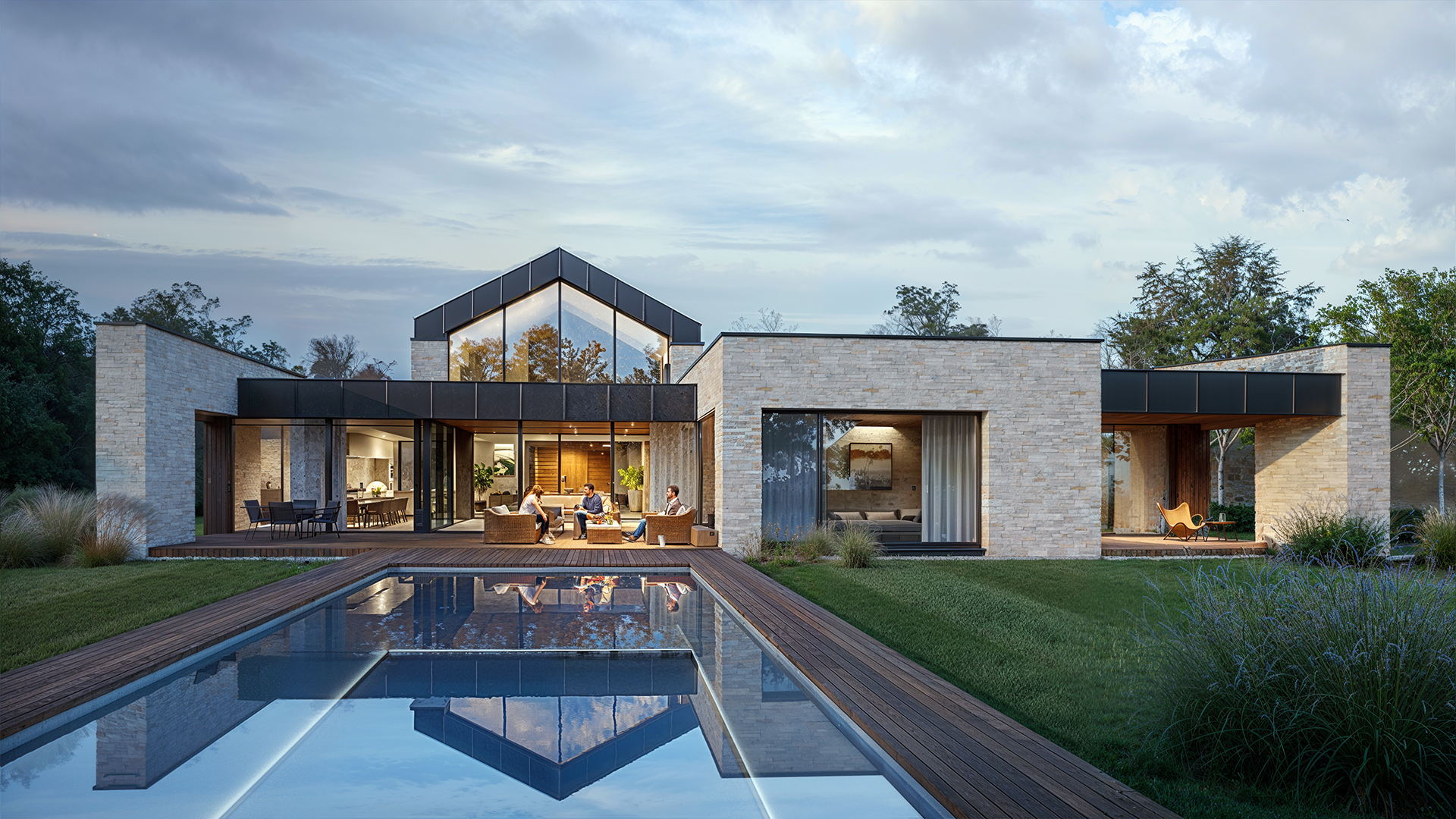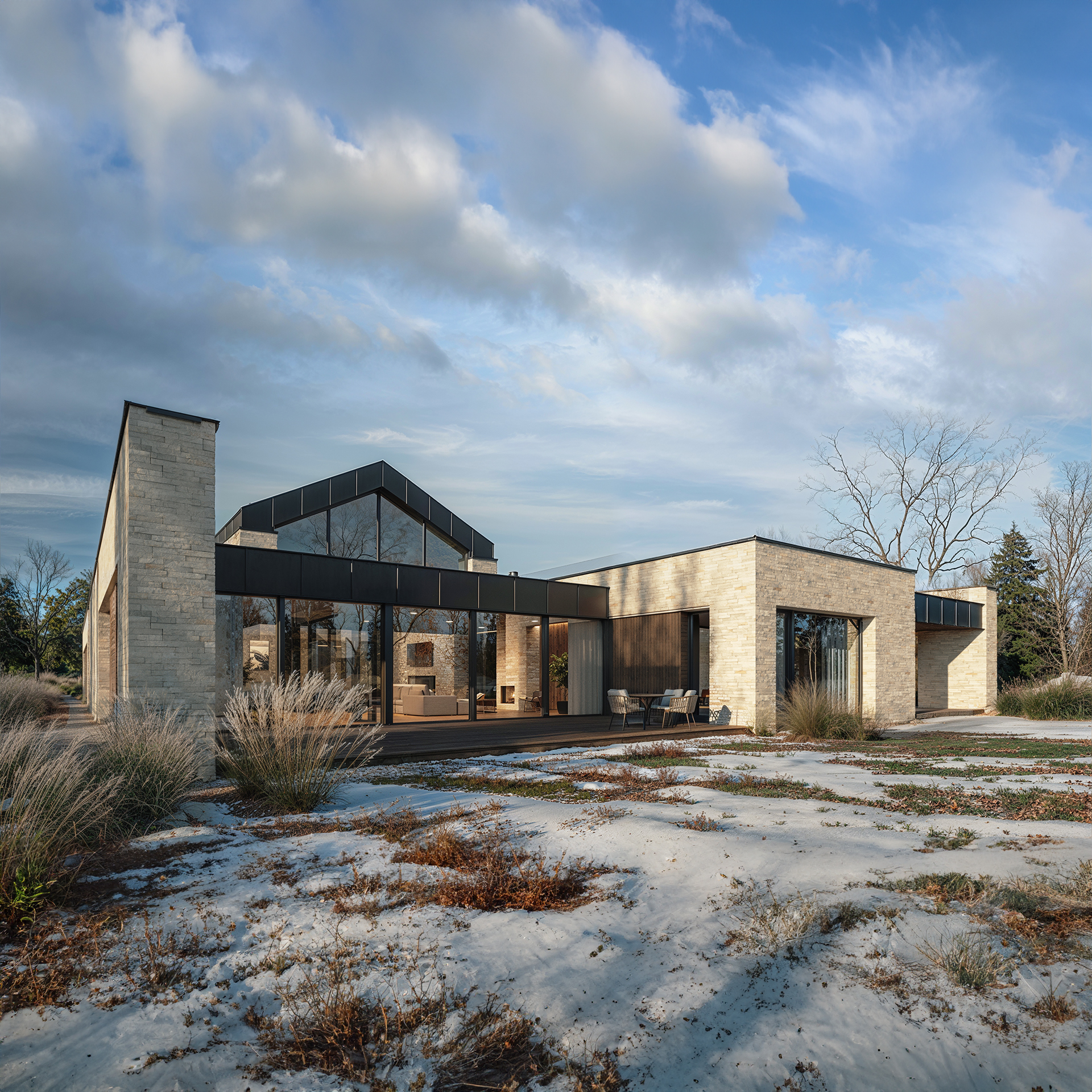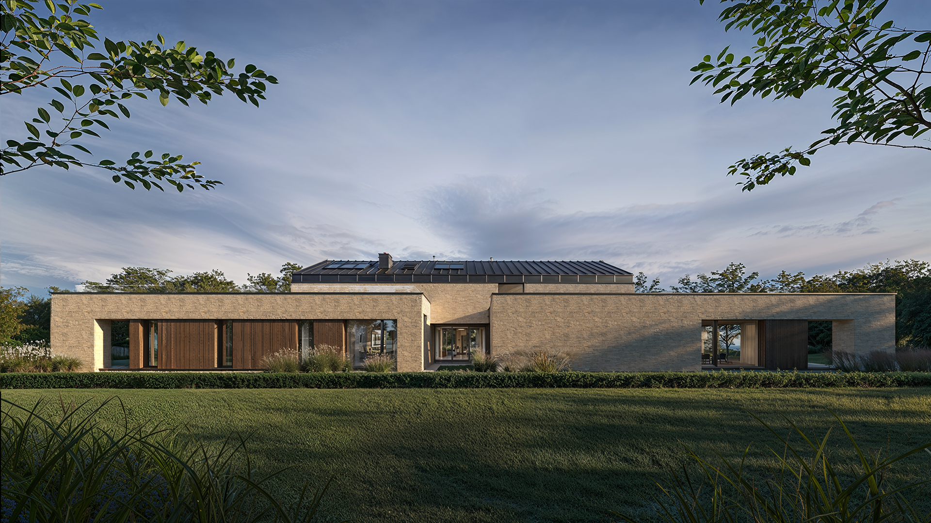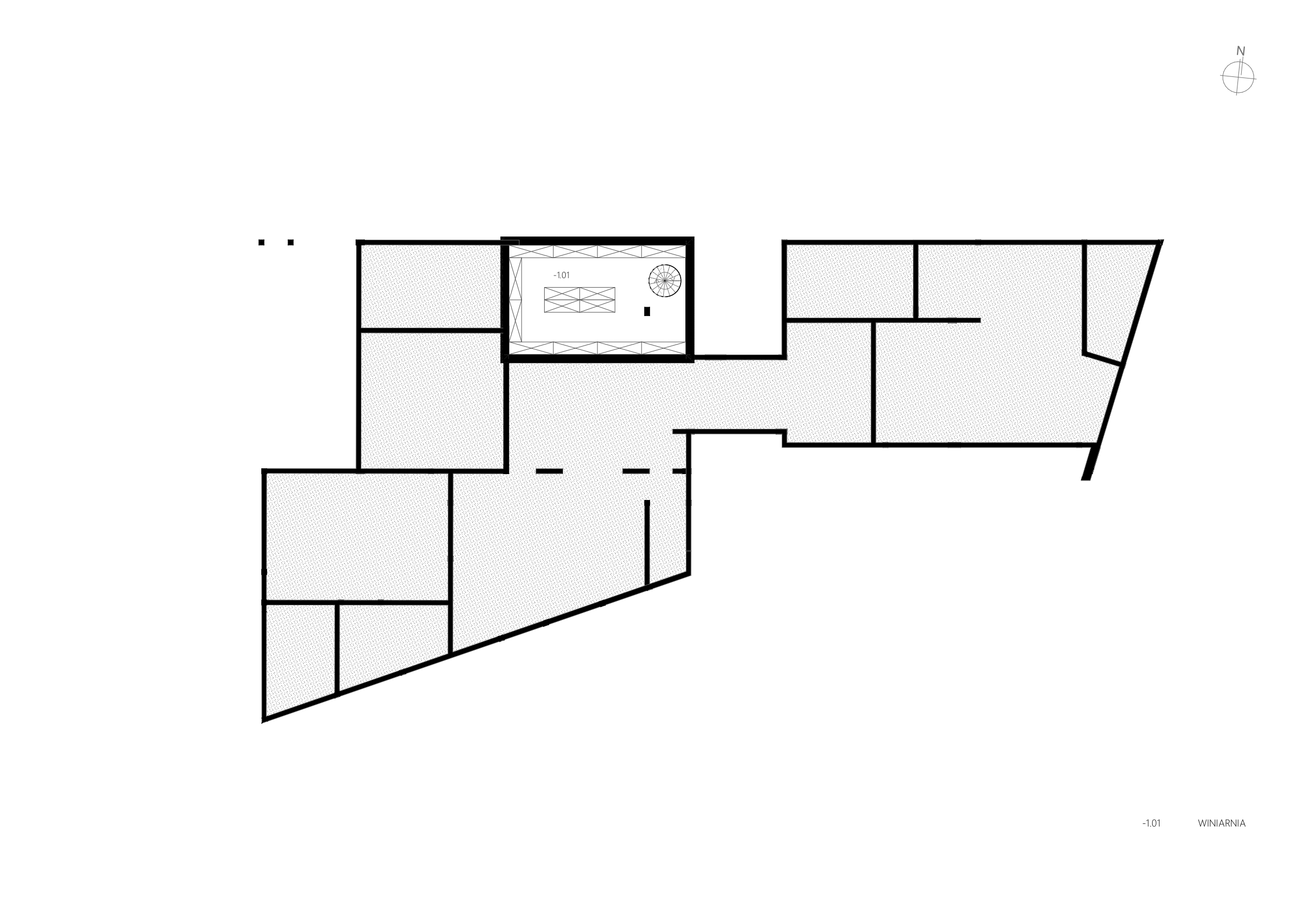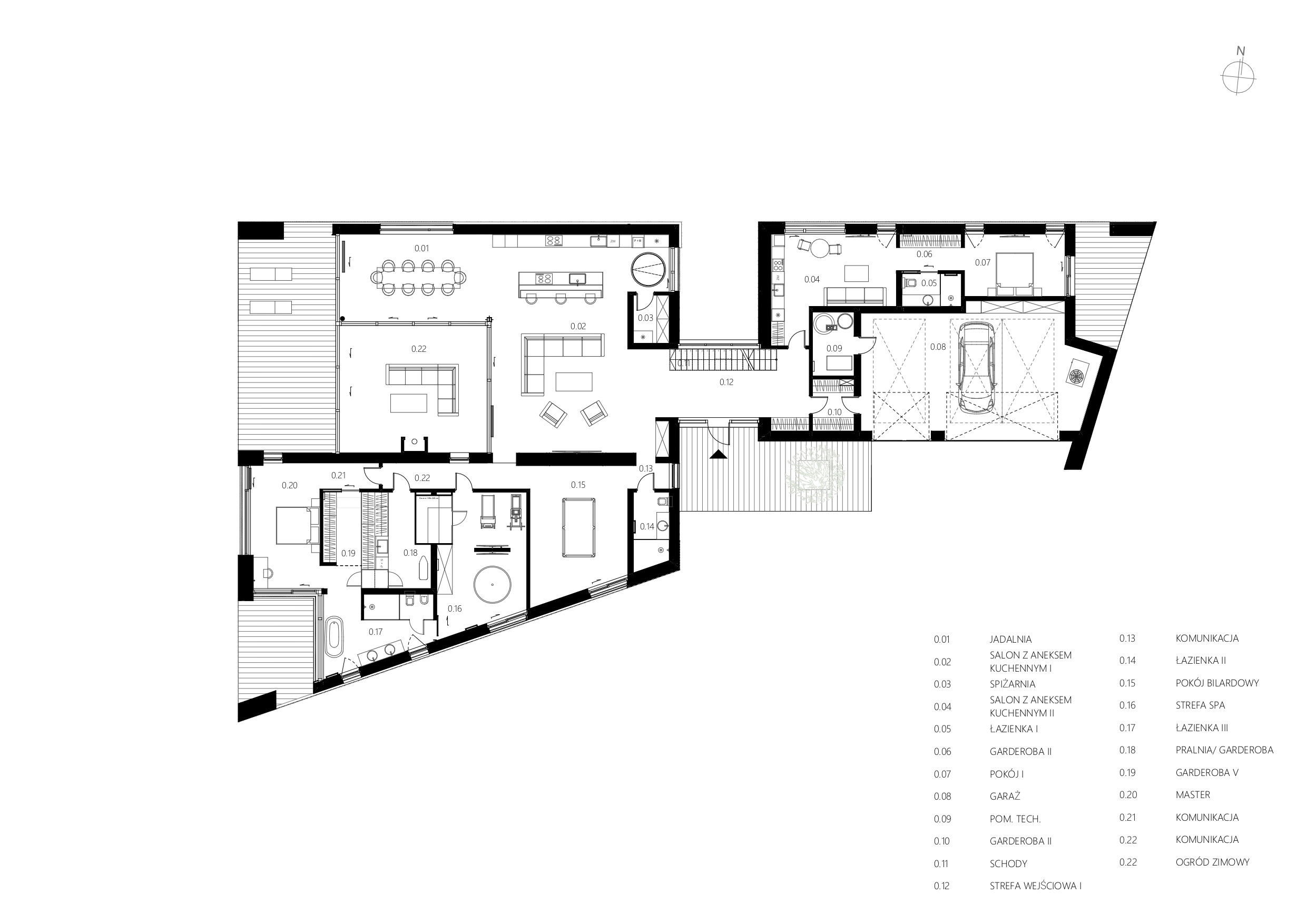 Zadaniem projektowym było stworzenie minimalistycznej, a zarazem wygodnej przestrzeni dla rodziny trzyosobowej. Parter został zaadresowany dla rodziców natomiast całe piętro stanowi przestrzeń dla dziecka. Parter został podzielony na 3 strefy: prywatną rodziców, wspólną wypoczynkową i gościnno-techniczną. Dodatkowym atrybutem w projektowaniu domu była miłość domowników do rodzinnego gotowania. Stąd piwniczka w kuchni oraz dwa miejsca w których można realizować się kuchennie. Kuchnia tradycyjna oraz kuchnia tarasowa.