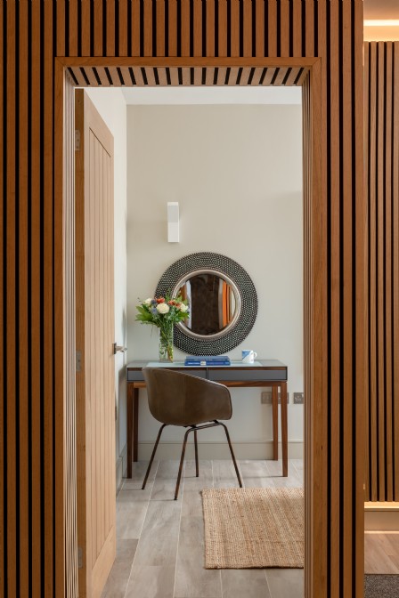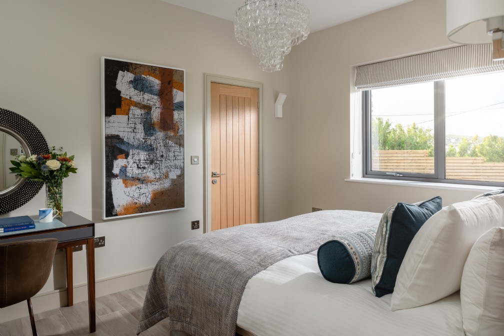 Stratum oferuje pięć przestronnych sypialni – każda z indywidualnym sterowaniem ogrzewania i dostępem do ogrzewania podłogowego. Jedna z sypialni posiada łóżko typu super king-size, prywatny taras oraz wolnostojącą kamienną wannę z widokiem na naturę. W pełni wyposażona kuchnia z dwoma piekarnikami, chłodziarką na wino i podwójną zmywarką sprzyja samodzielnemu gotowaniu podczas urlopu. Na zamkniętym podjeździe mieści się wygodny parking. Nowoczesna stodoła Stratum to połączenie spektakularnej formy, wyrafinowanego wnętrza i absolutnej wygody – idealna na wakacje w Kornwalii z klasą.