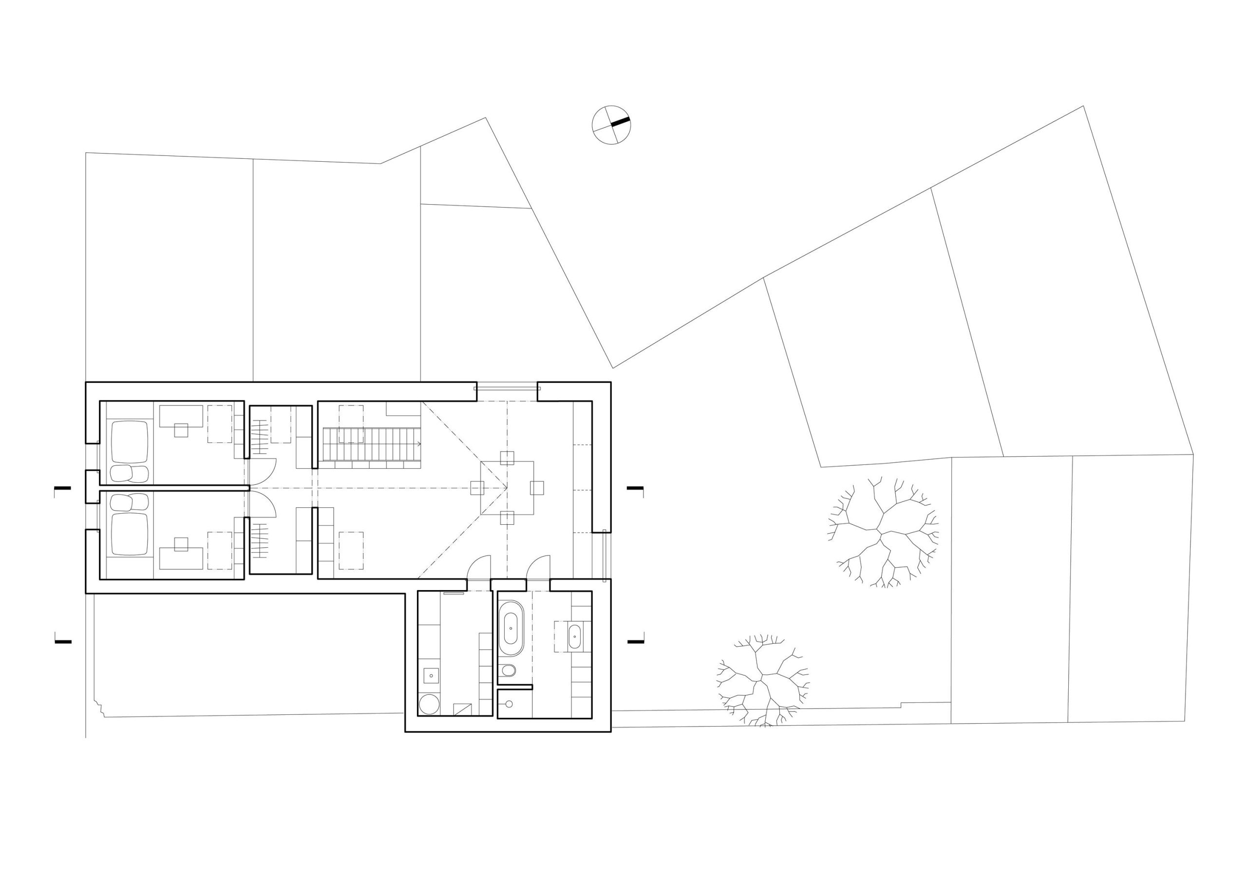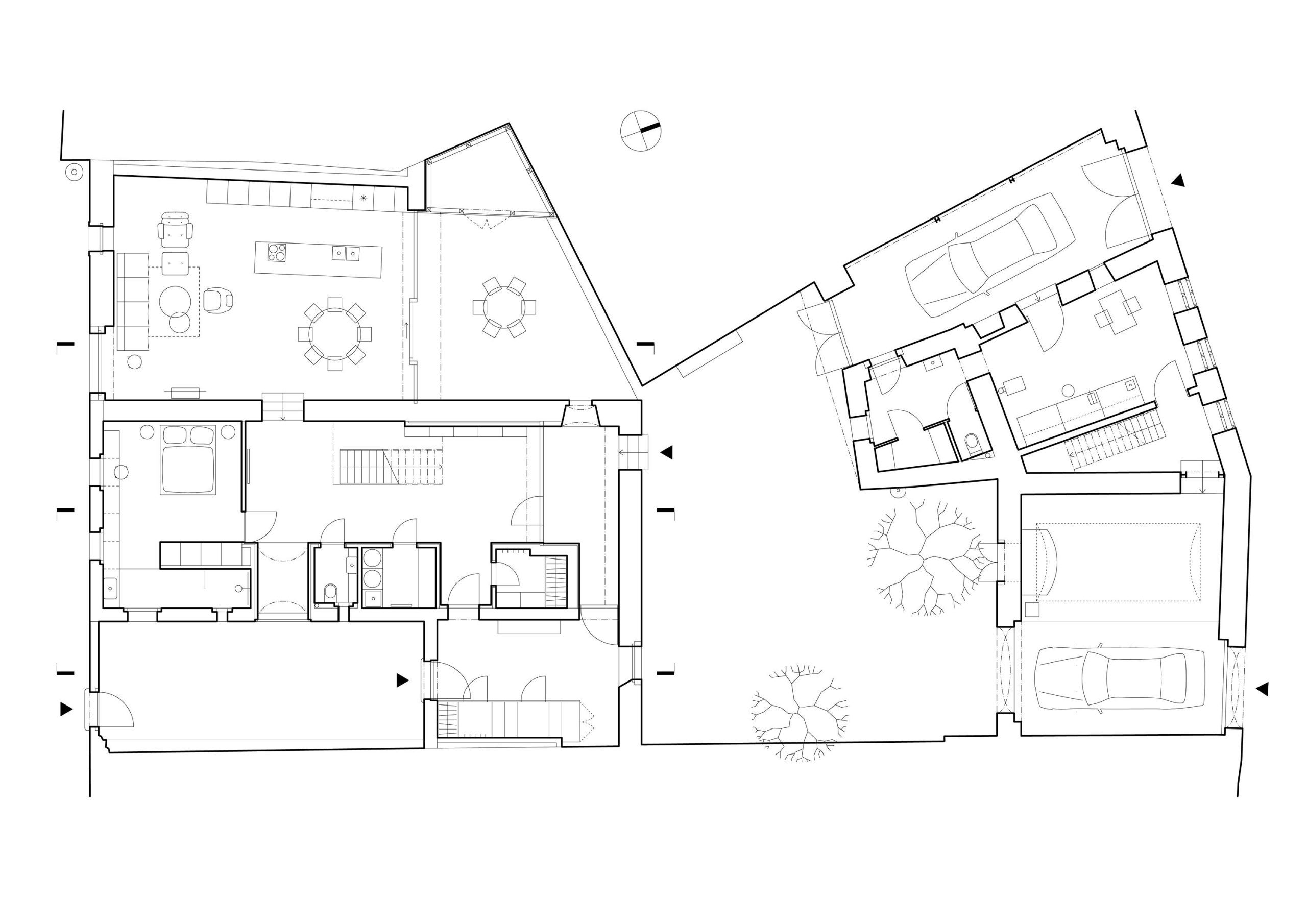Dom powstał z połączenia dwóch sąsiadujących budynków – jeden w ruinie, drugi po nieudanej modernizacji. Architekci usunęli zbędne elementy, odsłaniając oryginalne kamienne mury, cegły i detale historyczne. Projekt zakładał poszanowanie skali, kształtu i materiałów oryginalnej zabudowy. Na ograniczonej powierzchni udało się stworzyć funkcjonalną przestrzeń mieszkalną: duży salon z tarasem, poddasze dla dzieci, sypialnię z łazienką, garaż na dwa auta, warsztat z windą samochodową oraz ogród z drzewami owocowymi.