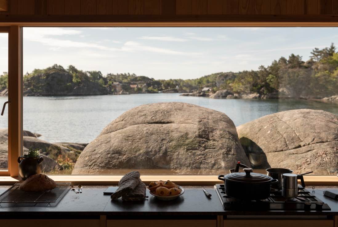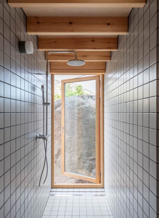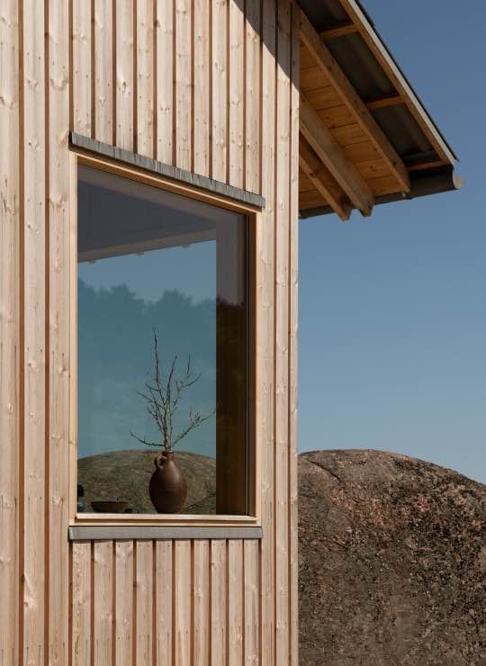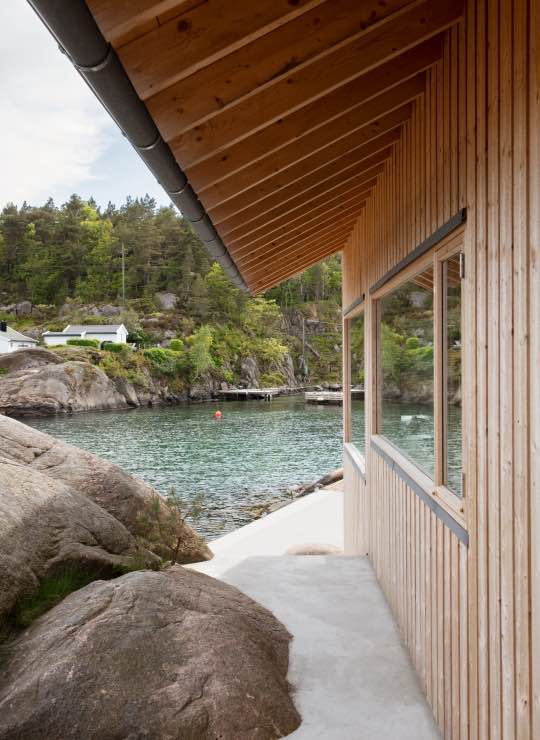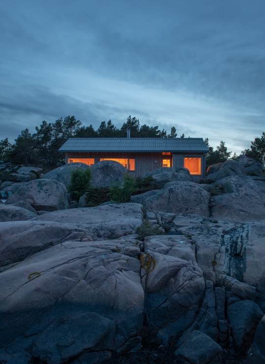 Wspólna praca architekta i inwestora polegała na ostrożnym poszukiwaniu lokalizacji i formy, która pozwoliłaby nowej hyttcie wtopić się w ukształtowanie terenu. Bryłę ustawiono wśród naturalnych załamań skał tak, aby nadal to svabergi grały pierwsze skrzypce. Hytta współtworzy z nimi zaciszne miejsca, chroniące przed wiatrem, deszczem i ostrym norweskim słońcem. Od strony bryggen budynek przypomina tradycyjną sjøbu – skromną, funkcjonalną zabudowę związaną z życiem nad wodą. W zestawieniu z pobliską skałą tworzy mały, intymny zakątek idealny do wypoczynku.