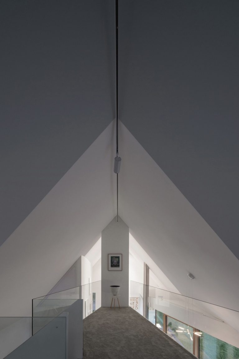 W kontraście do ciemniejącego, modrzewiowego exterioru, wnętrza zachowano w absolutnej bieli – od ścian po podłogi. Mają one pełnić rolę tła, „płótna” na sztukę i na myśli właścicieli. Ta czystość pozwala wybrzmieć osobowości mieszkańców, ich energii i wrażliwości. Przestrzeń sprzyja kontemplacji, pobudza wyobraźnię i pozwala mentalnie odpocząć w cieniu lasu.