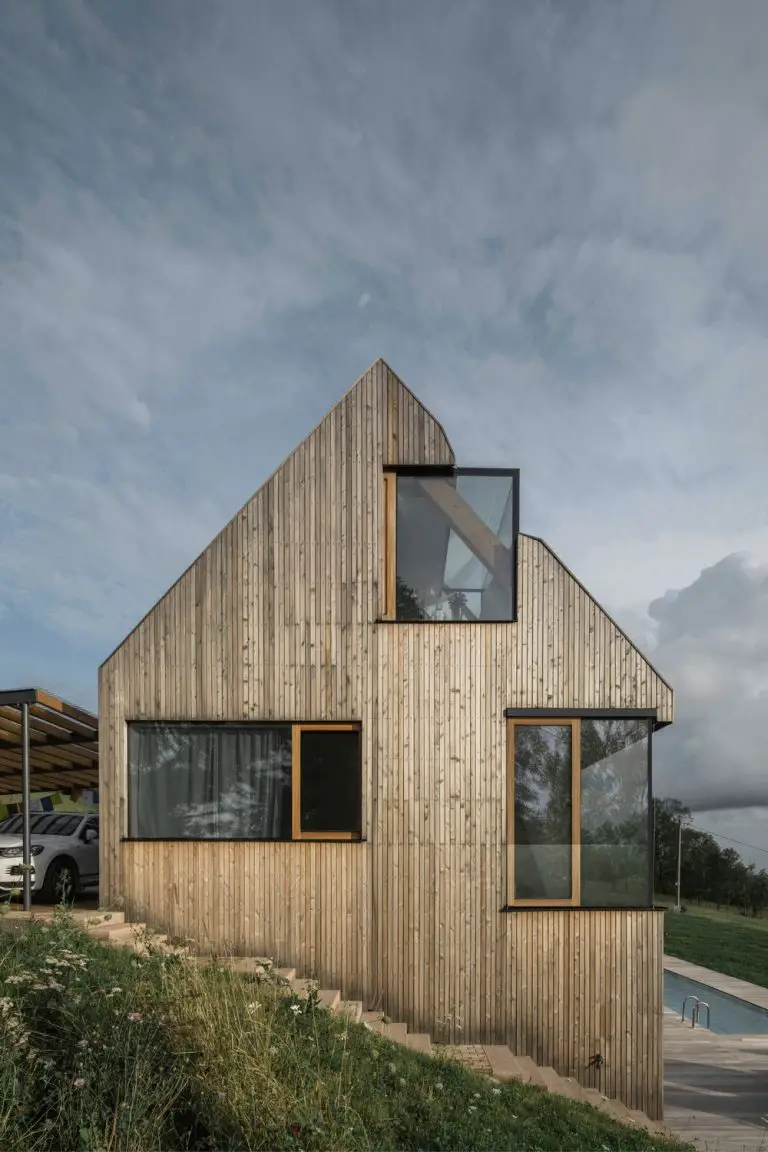 Więźbę dachową tworzą cztery klejone ramy, uzupełnione trzema parami wypukłych, zakrzywionych „poduszek”, które poprawiają proporcje wnętrza, akustykę i sposób prowadzenia światła. Cała zewnętrzna powłoka – ściany i dach – została wykończona pionowymi listwami modrzewiowymi, które z czasem patynują i jeszcze silniej łączą dom z otaczającą zielenią. To architektura lekka wizualnie, ale konstrukcyjnie dopracowana do perfekcji.