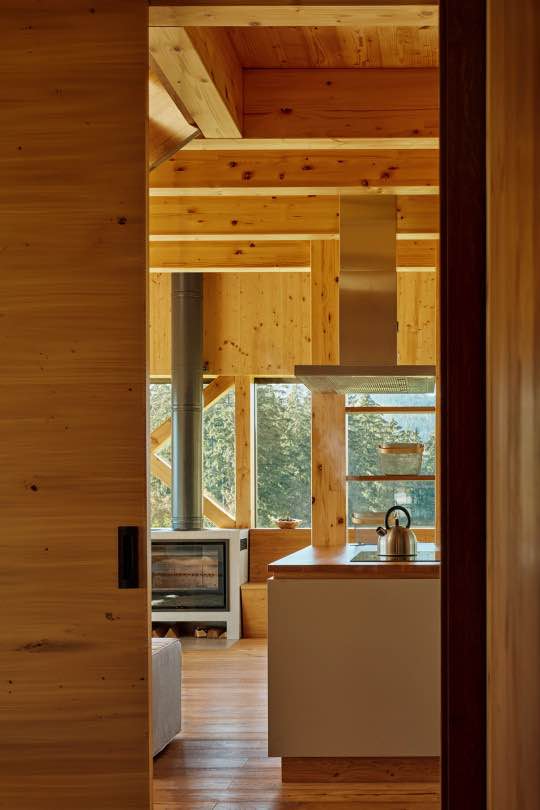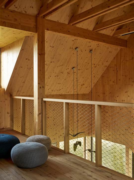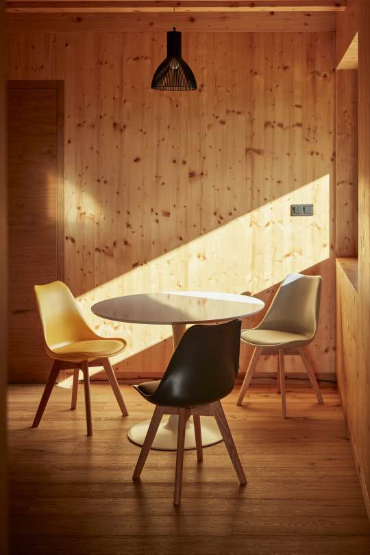 Bryła budynku nawiązuje do archetypu górskiej chaty – prosty, dwuspadowy dach, zwarta forma i tradycyjna geometria, ale wykończenie i detal są już w pełni współczesne. Architekci zastosowali lokalne materiały i nowoczesne technologie, tworząc przestrzeń przyjazną, energooszczędną i komfortową o każdej porze roku. Wnętrza są jasne, naturalne, z naciskiem na funkcjonalność i kontakt z otoczeniem.