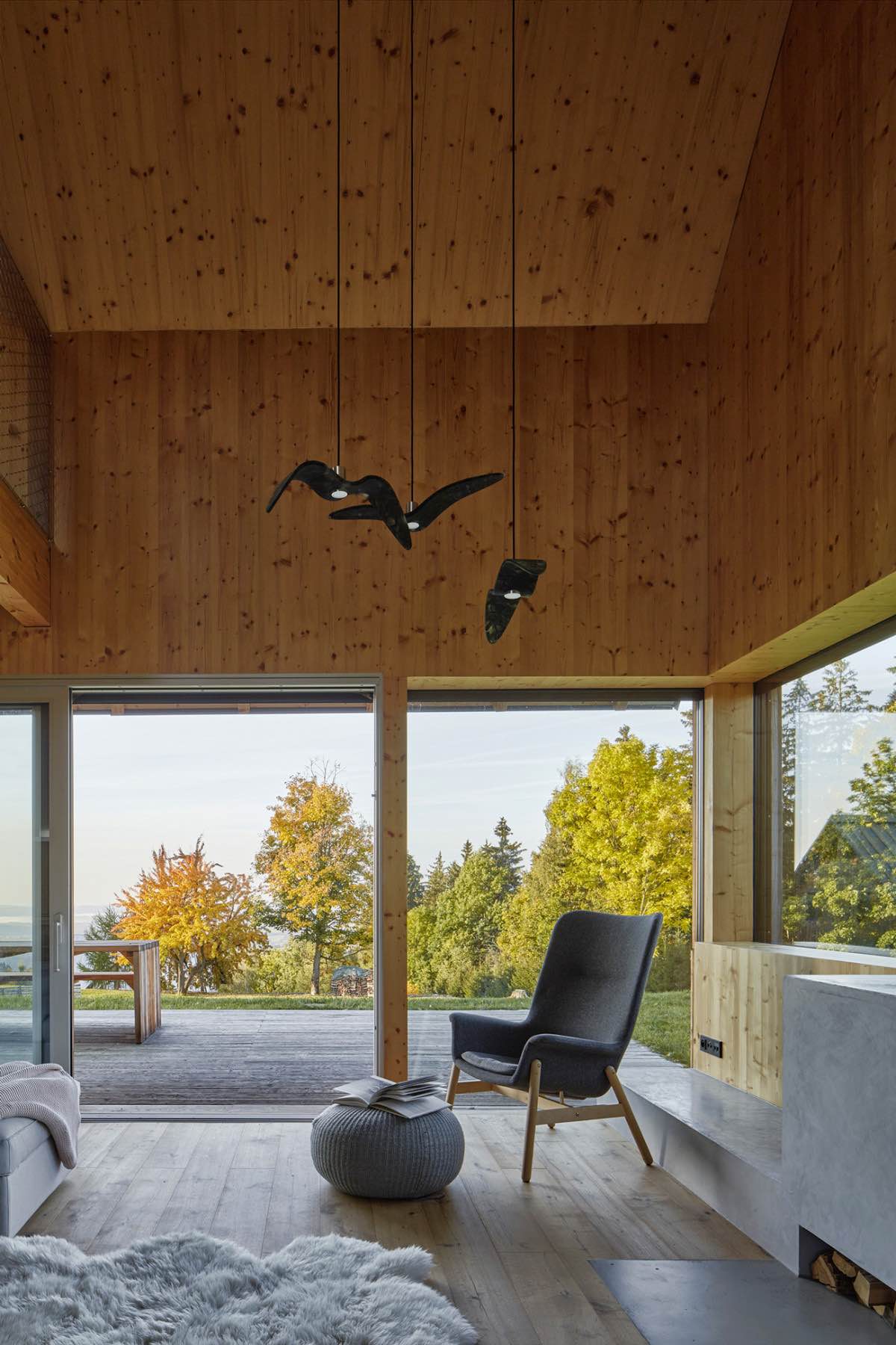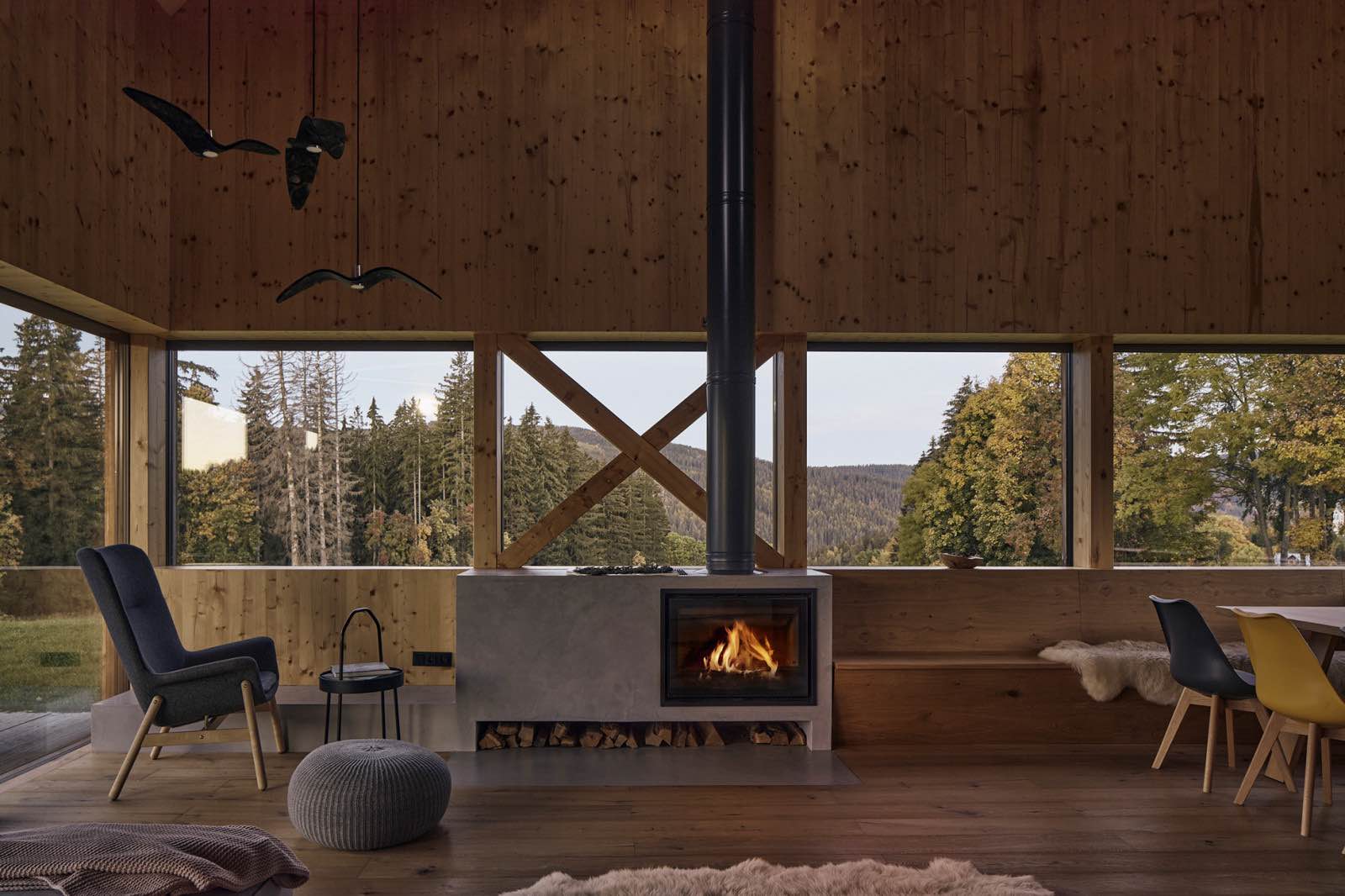 Największym atutem działki, na której stanęła nowa chalupa, jest spektakularny widok – z jednej strony na górską łąkę, z drugiej na las świerkowy, a w oddali na kościół ewangelicki oraz malowniczo rozsiane gospodarstwa. Z domu roztacza się też panorama na pasmo Żalský hřbet oraz szczyty Kotel, Łysa Góra i Plešivec. Projekt w pełni wykorzystuje ten potencjał widokowy – przemyślane otwarcia, orientacja pomieszczeń i duże przeszklenia pozwalają mieszkańcom na codzienne obcowanie z górskim pejzażem.
