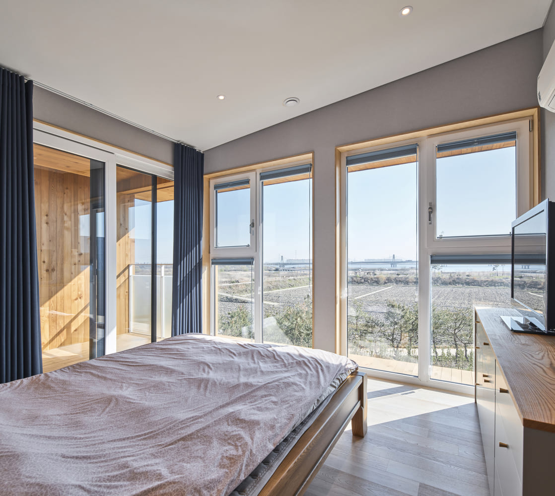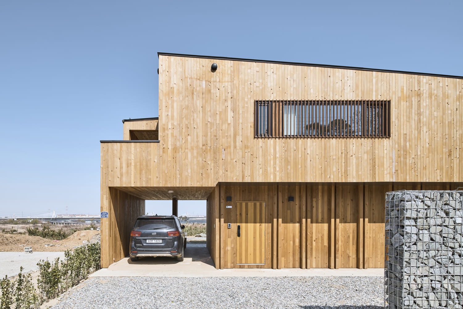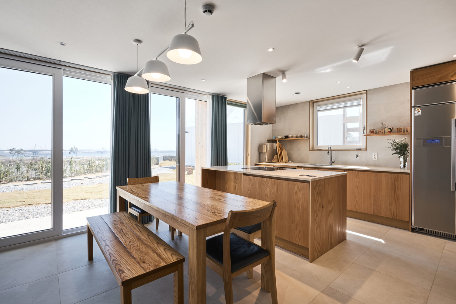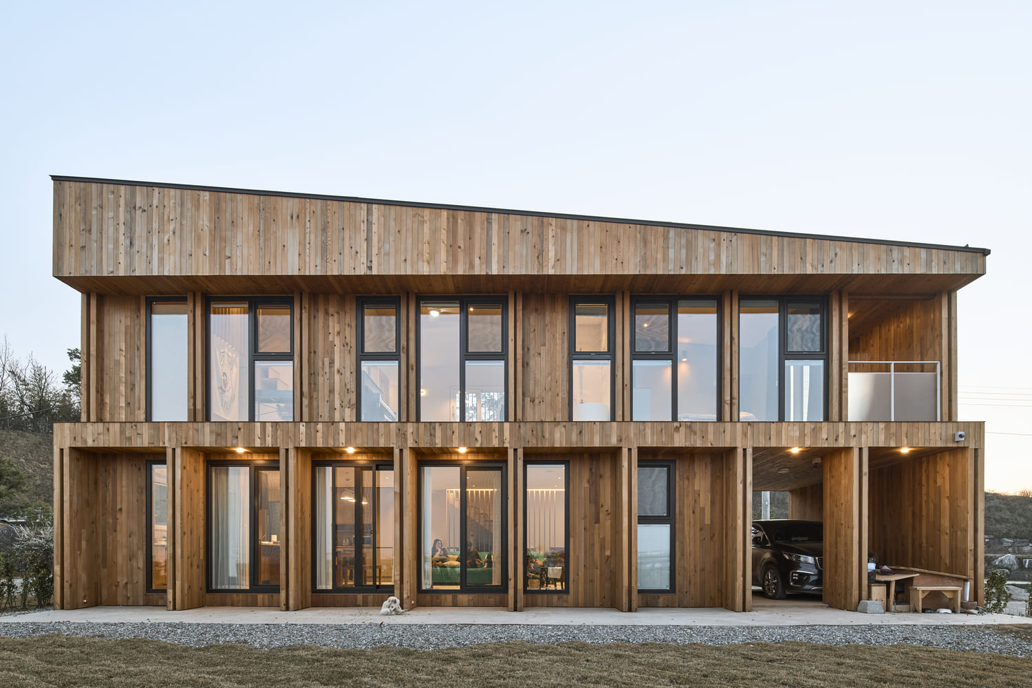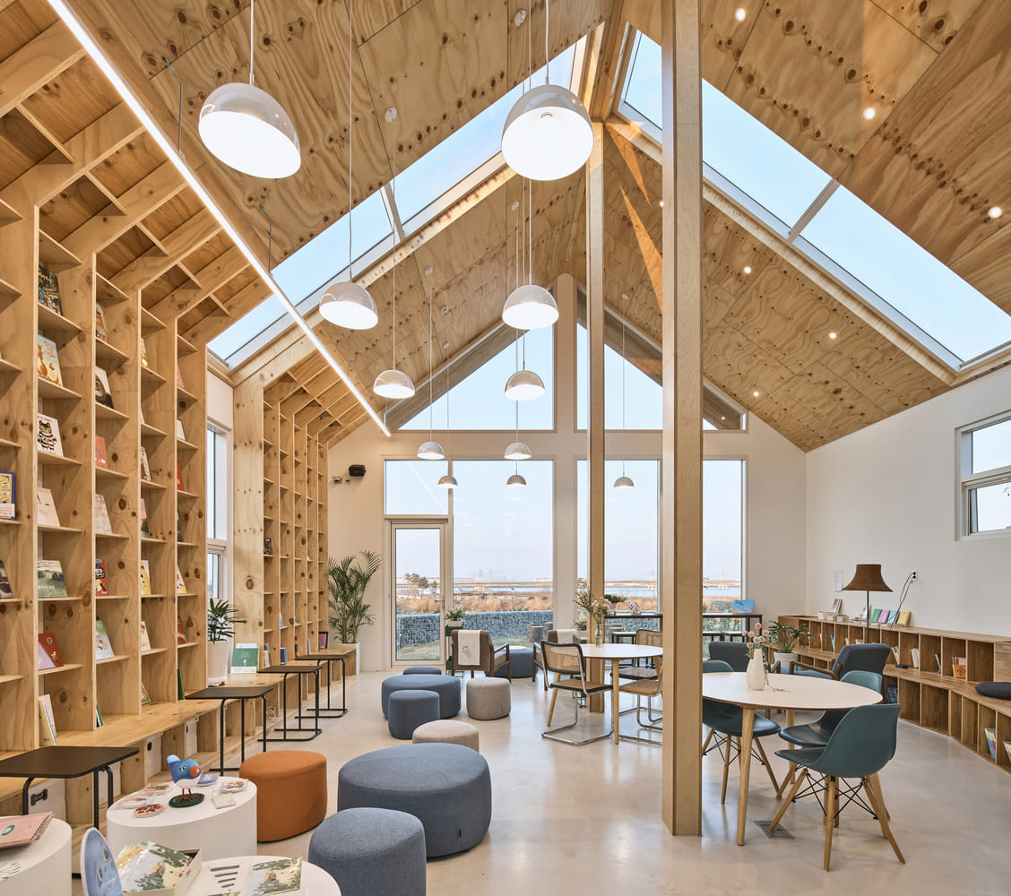 Wnętrza zaprojektowano z myślą o wygodzie i bliskości natury – duże przeszklenia otwierają dom na jezioro, a drewniane wykończenia i zróżnicowane poziomy podłóg zachęcają dzieci do swobodnego czytania i odkrywania książek. Choć projekt powstał w Korei, stylistycznie nawiązuje także do trendu nowoczesna stodola, łącząc prostą formę z funkcjonalnością i rodzinną atmosferą.