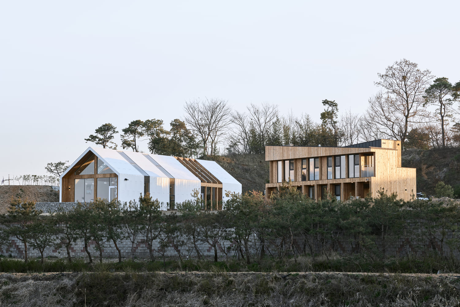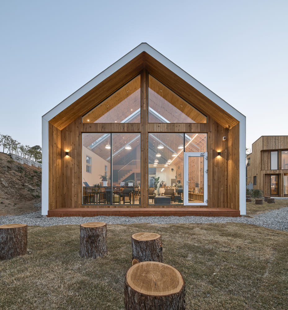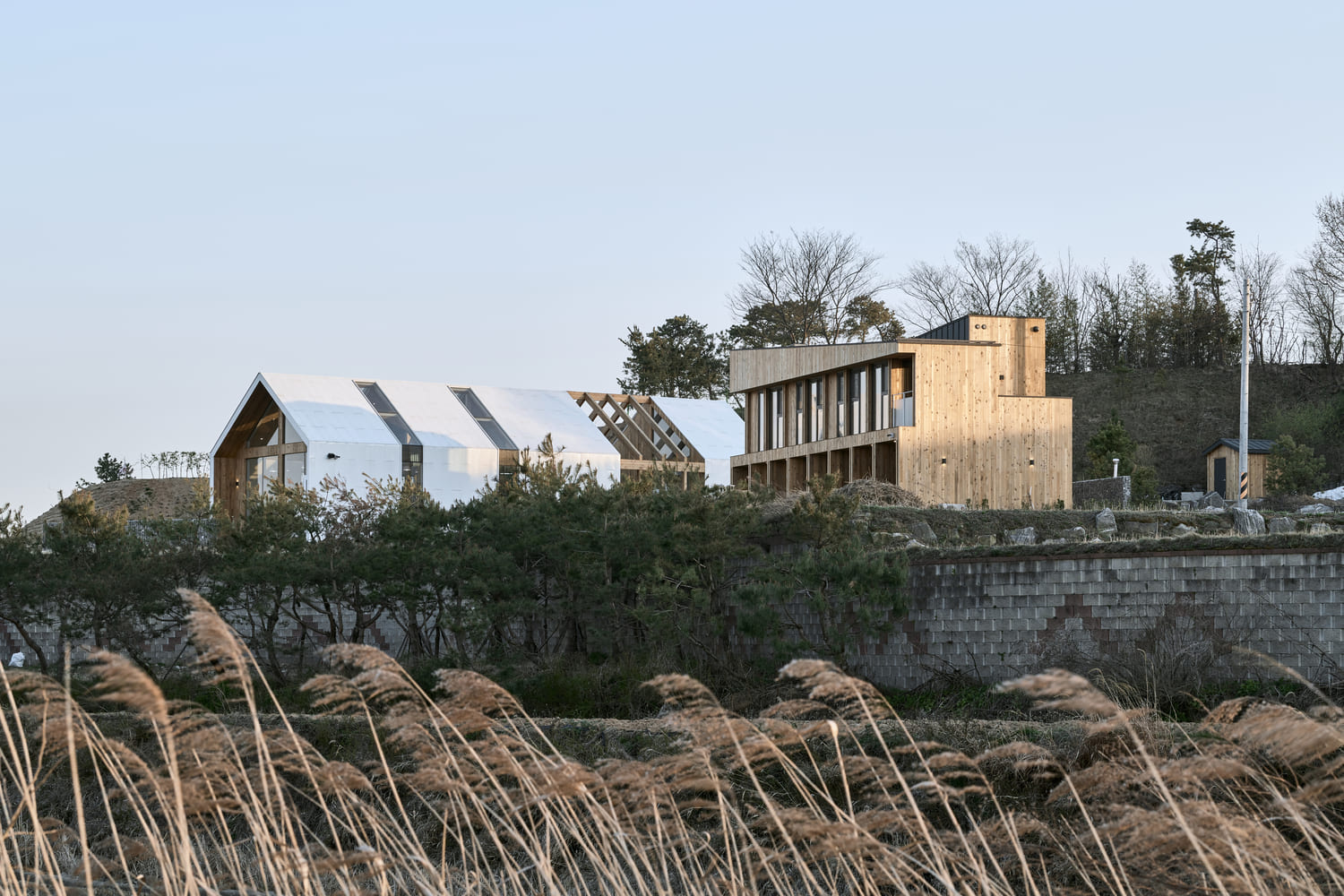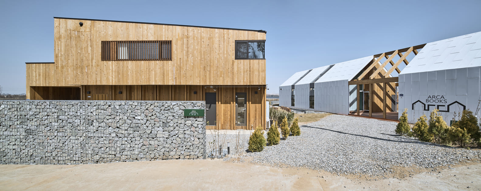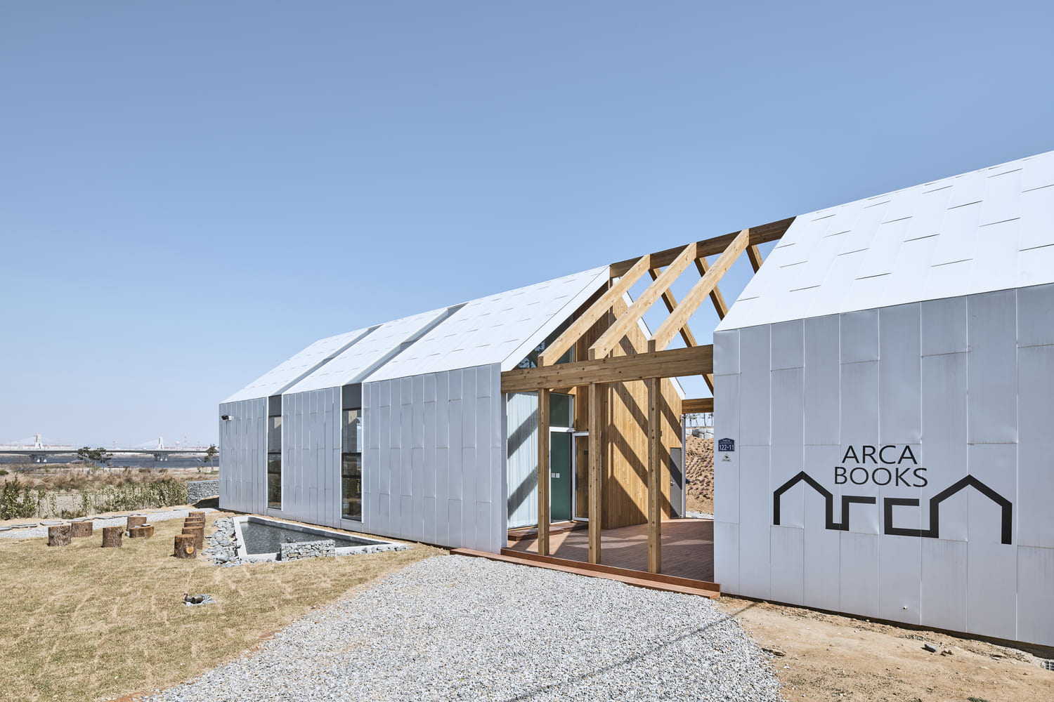 Całość składa się z dwóch budynków o kontrastowych formach – księgarni z dwuspadowym dachem i białą elewacją, przypominającą archetyp tradycyjnego domu, oraz części mieszkalnej wykończonej naturalnym drewnem, które nawiązuje do regałów pełnych książek. Dzięki temu przestrzeń wygląda jak mała wioska nad jeziorem, w której prywatność mieszkańców współgra z otwartością miejsca na odwiedzających.