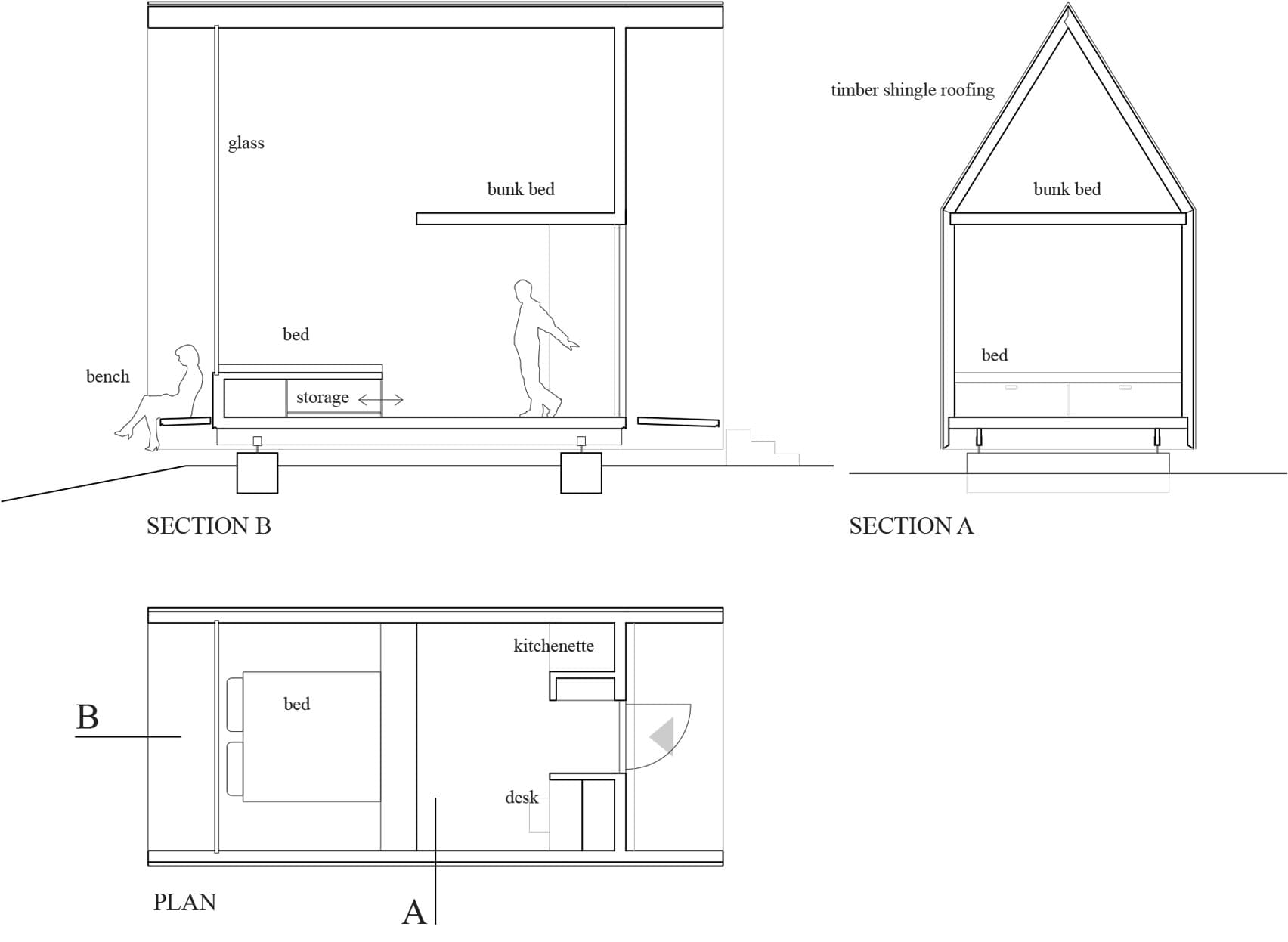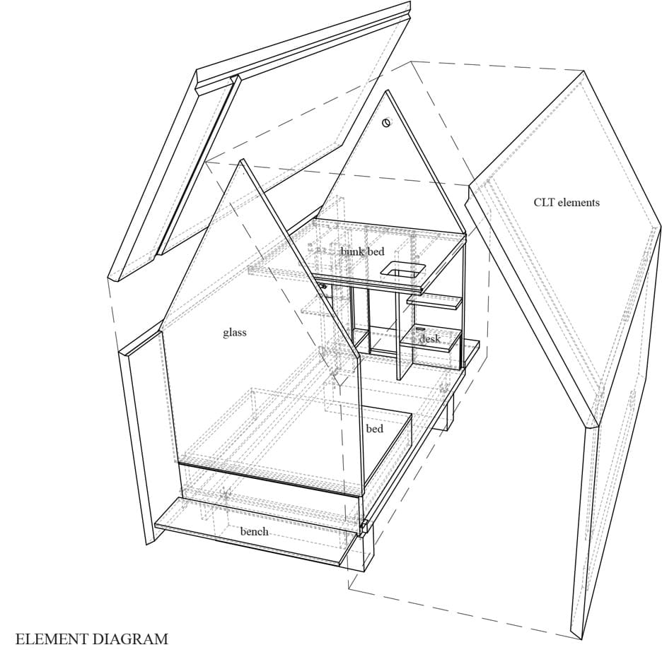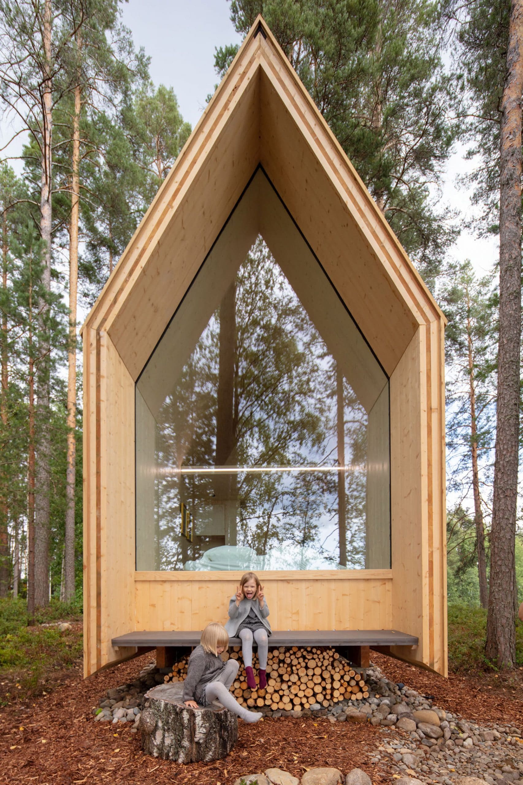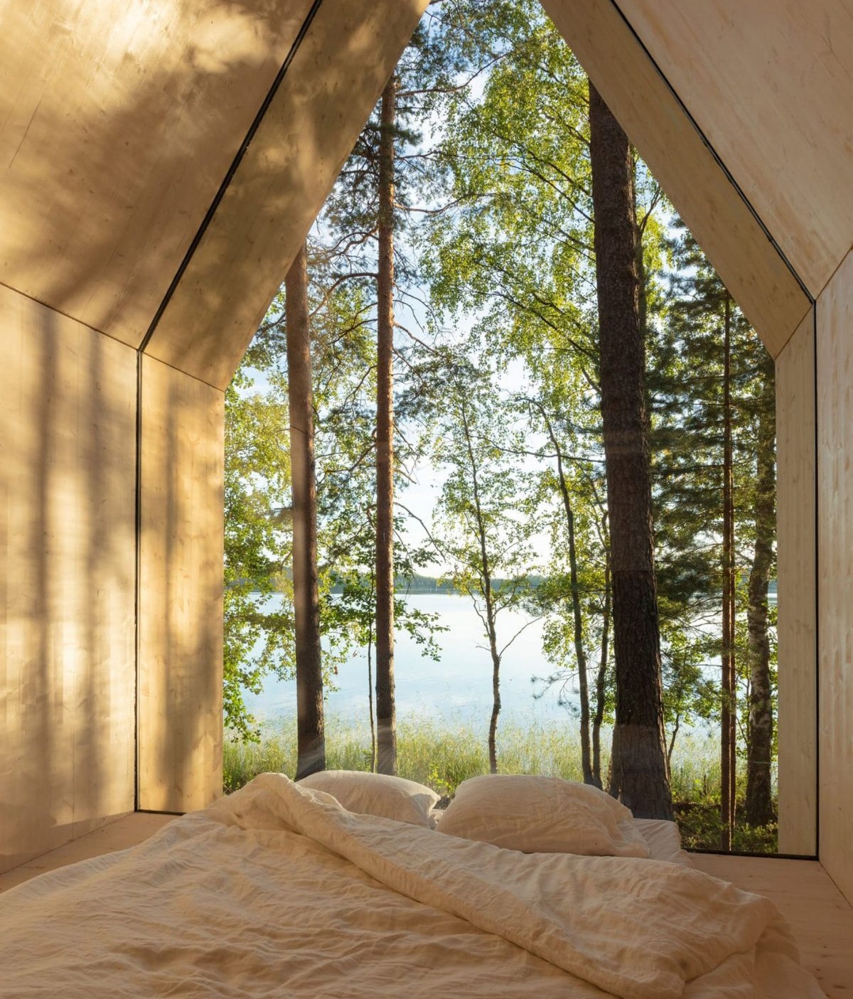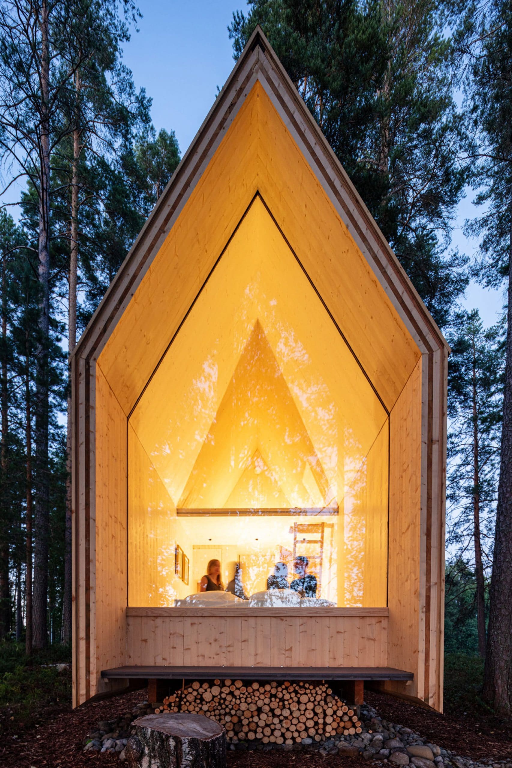 Na zaledwie 15 m² powierzchni architekci zmieścili wszystkie najważniejsze funkcje. Wnętrze w pełni wykorzystuje walory widokowe dzięki wielkiej tafli szkła, sięgającej od podłogi po sufit. Odsłonięte płyty CLT tworzą naturalne wykończenie ścian i jednocześnie pełnią funkcję wbudowanych mebli – w tym łóżka przy przeszkleniu oraz dodatkowego miejsca do spania na antresoli, dostępnego po drabinie. Obie ściany szczytowe osłaniają platformy, które tworzą taras, miejsce do siedzenia oraz praktyczną przestrzeń do przechowywania drewna.