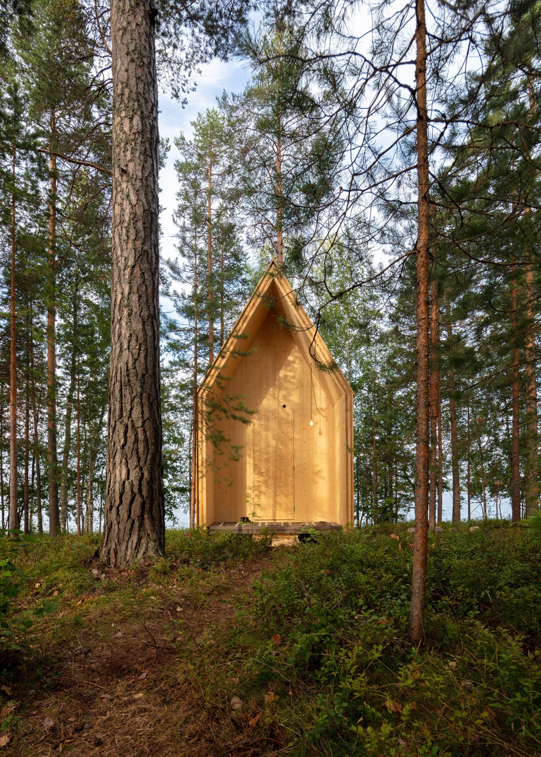 Projekt powstał w dziewiczym lesie, dlatego Ortraum Architects zadbali o minimalną ingerencję w środowisko. Wszystkie elementy z CLT zostały przygotowane wcześniej jako prefabrykaty i dostarczone na działkę ciężarówką, a następnie zmontowane z pomocą dźwigu. Dzięki temu budowa była szybka i przyjazna dla otoczenia. Nocą Kynttilä emituje ciepłe światło, zamieniając się w „świecę” odbijającą się w tafli jeziora. Domek pełni rolę domku gościnnego oraz przestrzeni medytacyjnej, uzupełniając istniejący letni dom i saunę.
