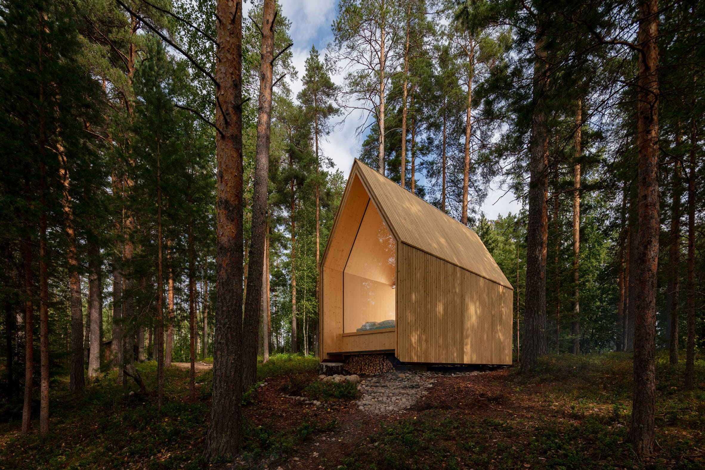 Architekci z Helsinek nazwali projekt „Kynttilä”, co w języku fińskim oznacza „świecę”. Domek został wykonany z ekologicznego materiału – CLT (cross-laminated timber), czyli drewna klejonego krzyżowo, a elewację obłożono deskami modrzewiowymi. Prosta forma i naturalne materiały sprawiają, że bryła doskonale wpisuje się w leśne otoczenie, przypominając małą nowoczesną stodołę nad jeziorem.