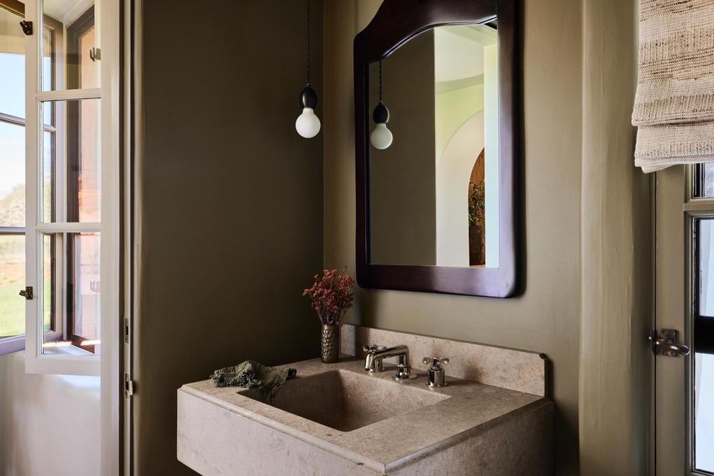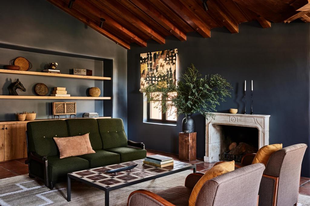 Za pomocą ziemistych odcieni takich jak oliwka, karmel, czekolada i granat, Mathern stworzyła przestrzeń, która doskonale harmonizuje z otaczającym krajobrazem. Wnętrza zostały wzbogacone o dębowe elementy konstrukcyjne, które zrównoważyły naturalne odcienie cedru i jodły w oryginalnych sufitach. Dodatkowo, projektantka skupiła się na wprowadzeniu teksturalnych tkanin i tapicerek, co nadało wnętrzom nowoczesny i neutralny charakter, ale zachowało przy tym rodzinny klimat.