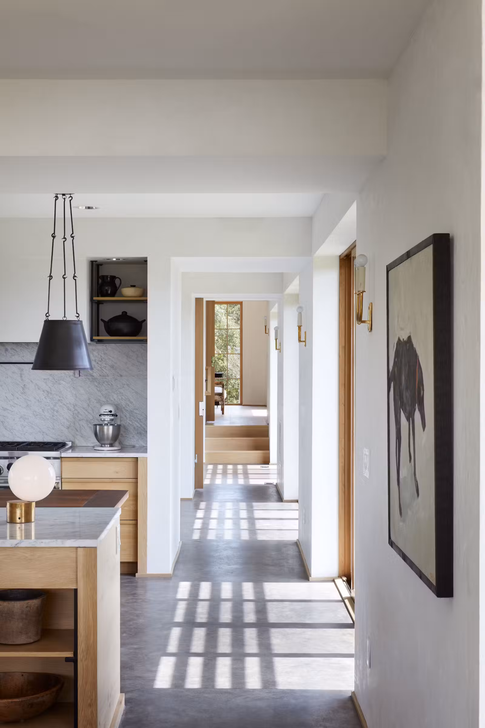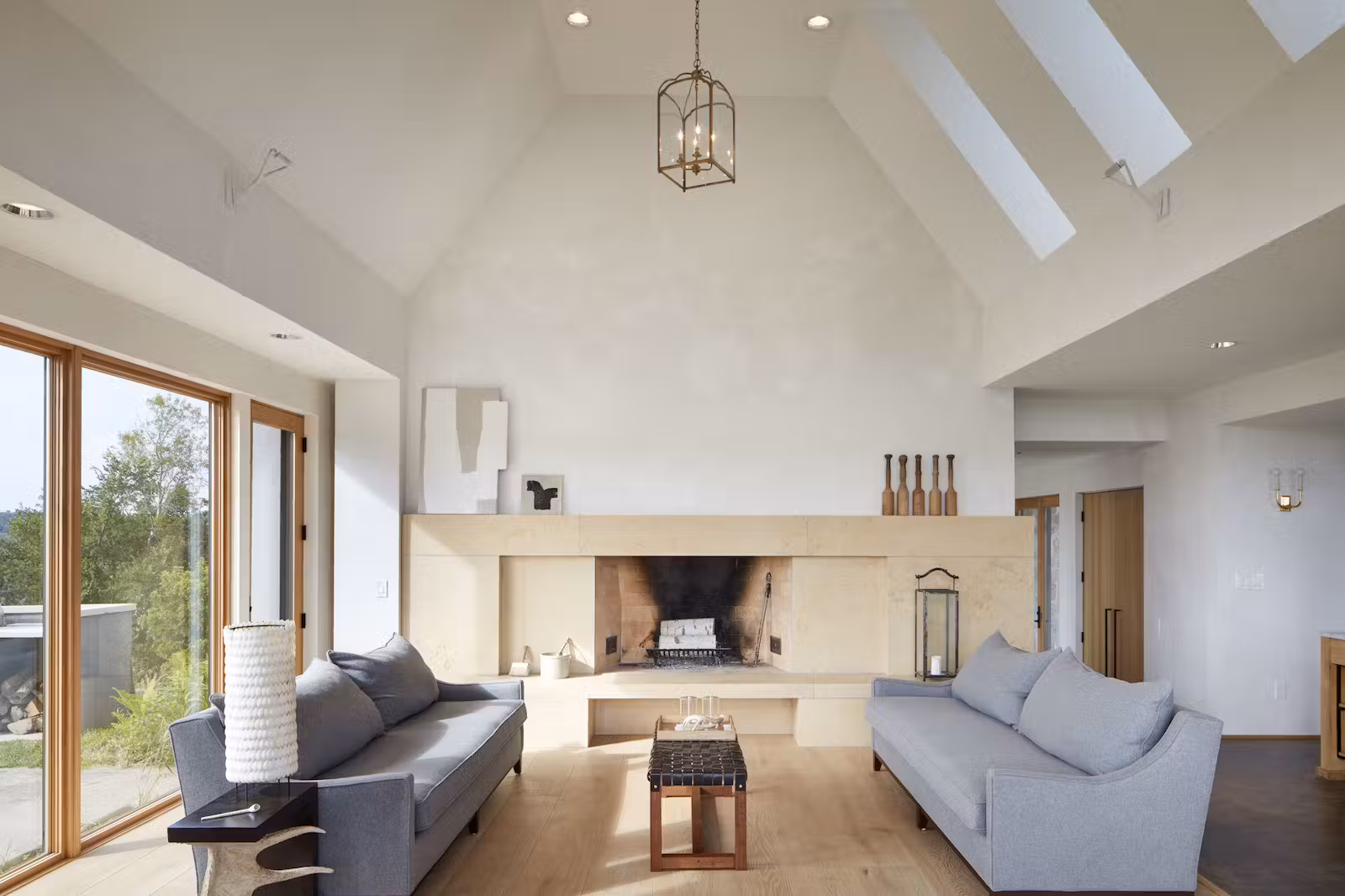 Główne pokoje są wyrównane wzdłuż grzbietu wzgórza i oferują widoki na południe na dolinę rzeki i na północ na linię drzew. Architekci wzmocnili związek domu z miejscem, dodając drzwi otwierające się na zewnątrz w każdym z głównych pokoi i szereg głęboko osadzonych świetlików w salonie, które pozwalają na zalanie wnętrza naturalnym światłem.