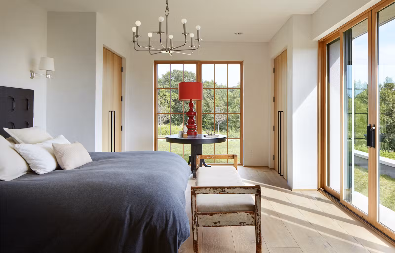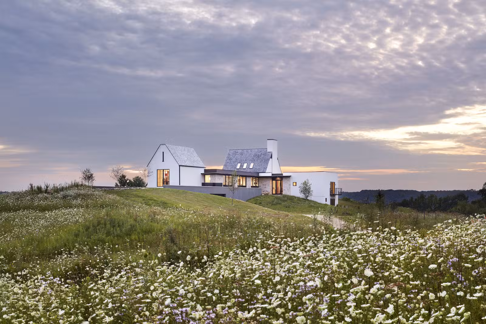 Kiedy para z Wisconsin zaczęła szukać domu, w którym ostatecznie przejdą na emeryturę, wyobraziła sobie współczesny dom wiejski wtopiony w krajobraz. „Chcieli zbadać koncepcję pierwotnych struktur — takich jak budynki gospodarcze, stare europejskie domy wiejskie i domki w Cotswolds w Anglii — które mają w sobie ikoniczną wrażliwość” — mówi architekt Matthew Erickson z TEA2 Architects. „Jednocześnie chcieli, aby dom był nowoczesny”.