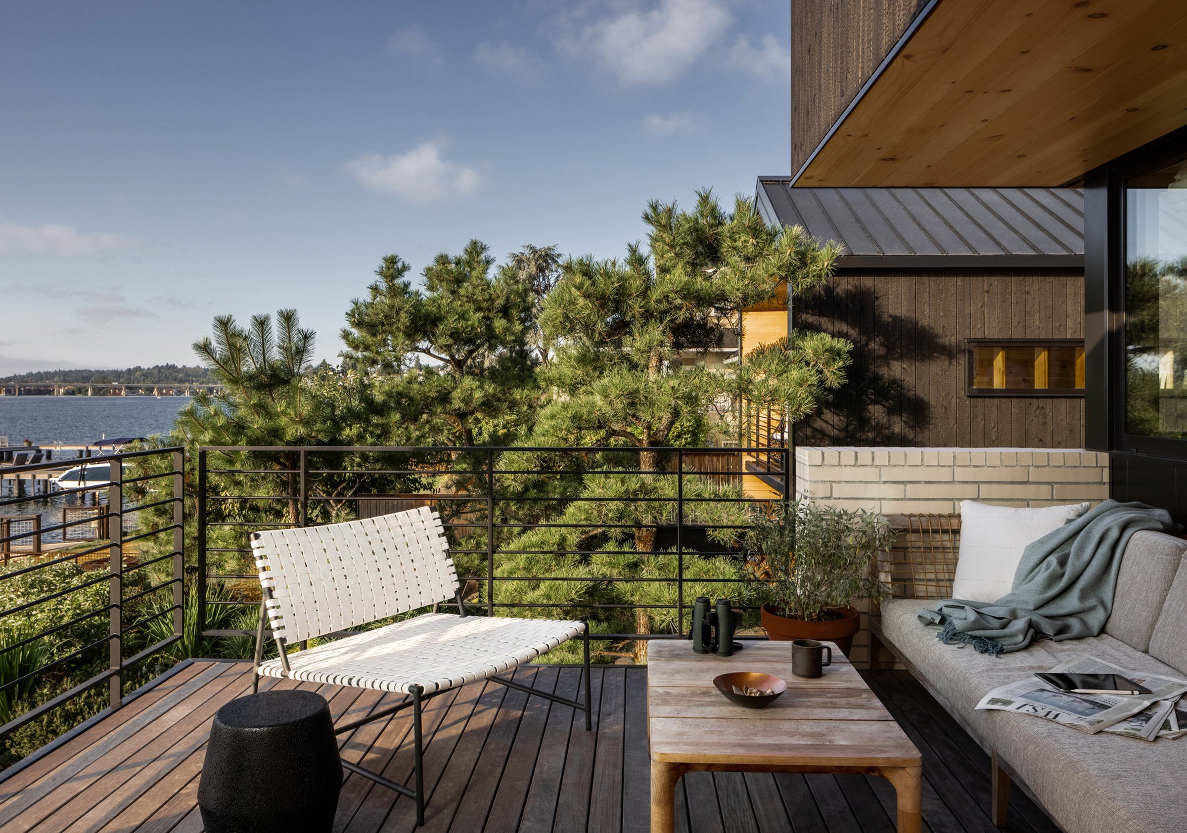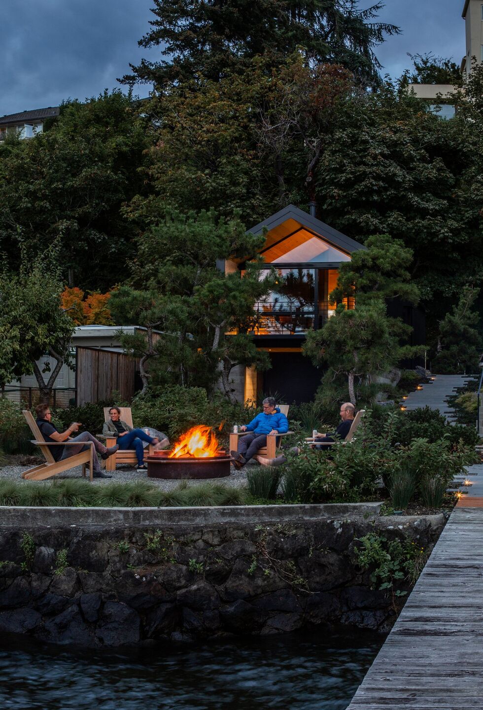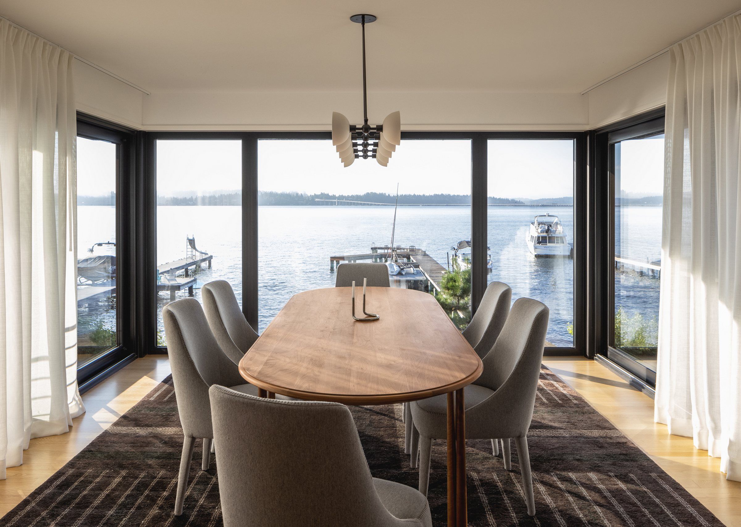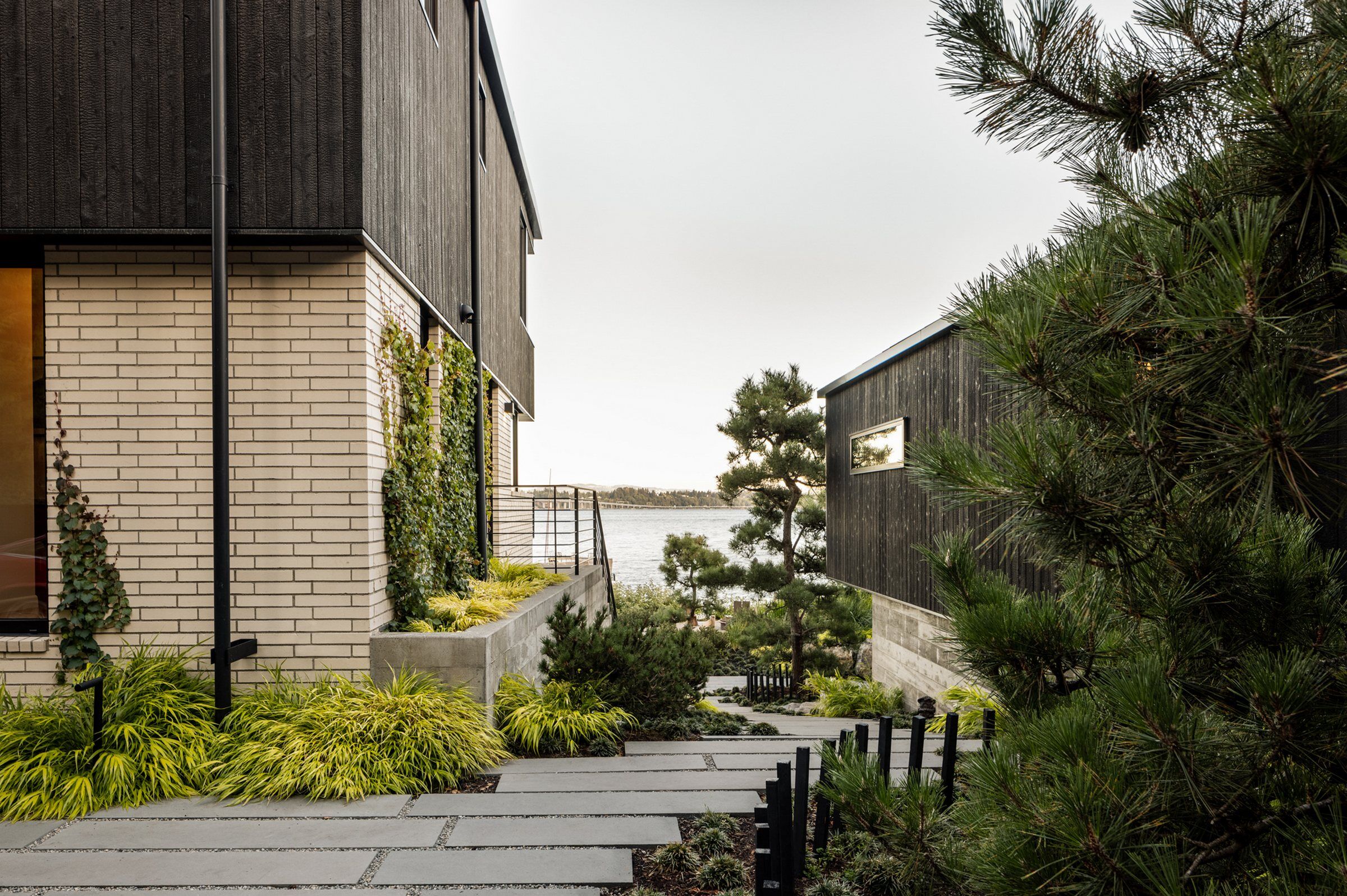W głównej rezydencji, SHED wyburzył ściany wewnętrzne, tworząc otwartą strefę dzienną z jadalnią i panoramicznym widokiem na Górę Rainier. Centralna wyspa kuchni zapewnia funkcjonalność i swobodny przepływ przestrzeni, a nowe tarasy poszerzają życie na zewnątrz. Górne piętra zostały przearanżowane, by pomieścić sypialnie z łazienkami dla rodziców i dzieci. Piwnica została wyposażona w salon, aneksy kuchenny, pokój multimedialny, saunę i prywatną strefę SPA z cedrową wanną z hydromasażem z widokiem na wodę. Materiały: biała cegła, shou sugi ban, beton i metalowe panele tworzą minimalistyczną paletę pełną kontrastów, która podkreśla trwałość i nowoczesny charakter projektu.