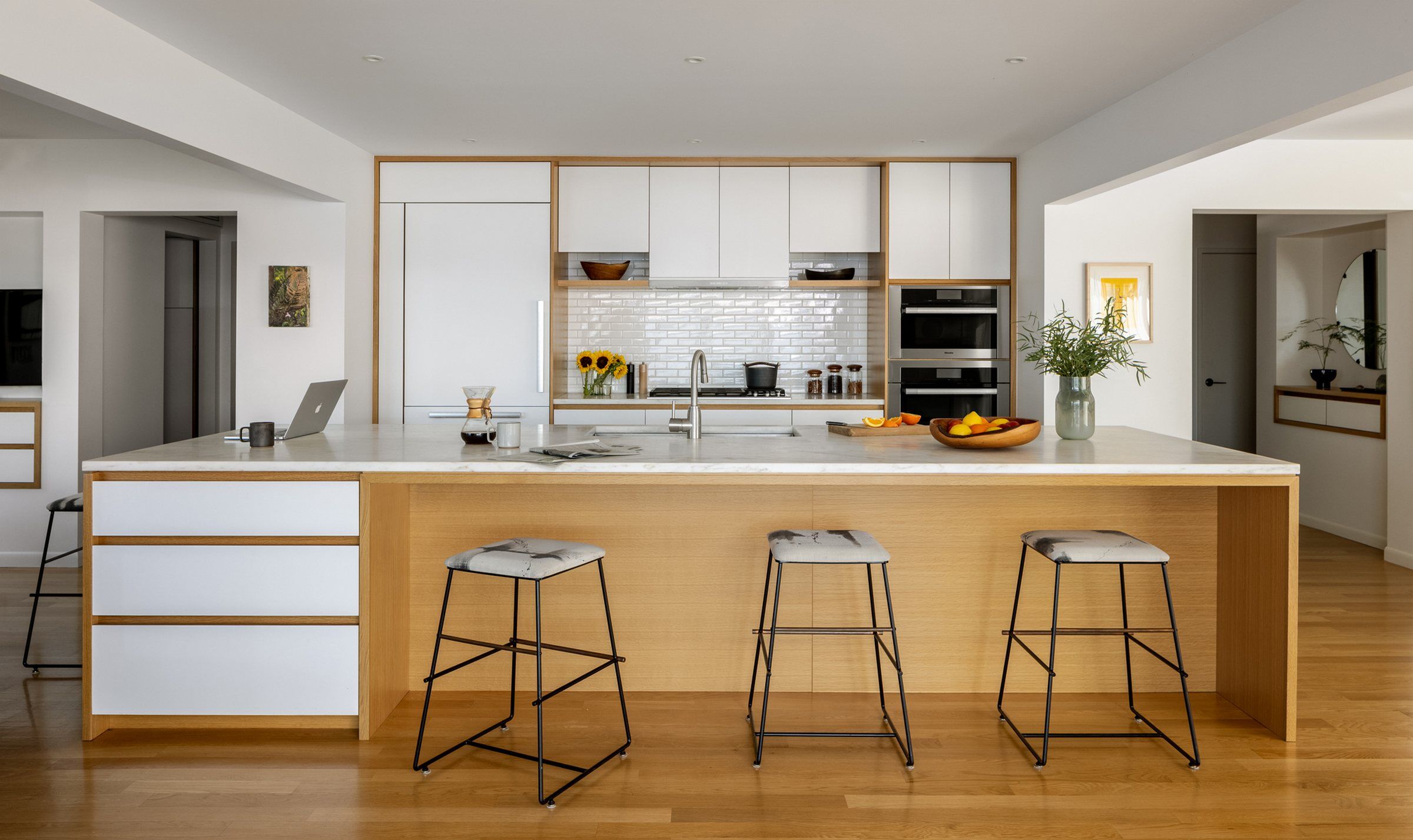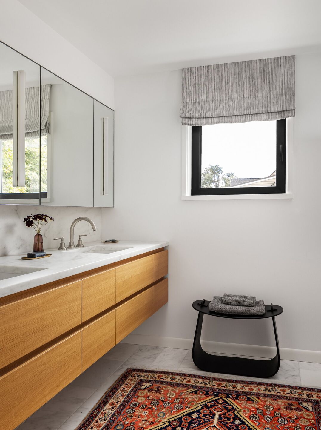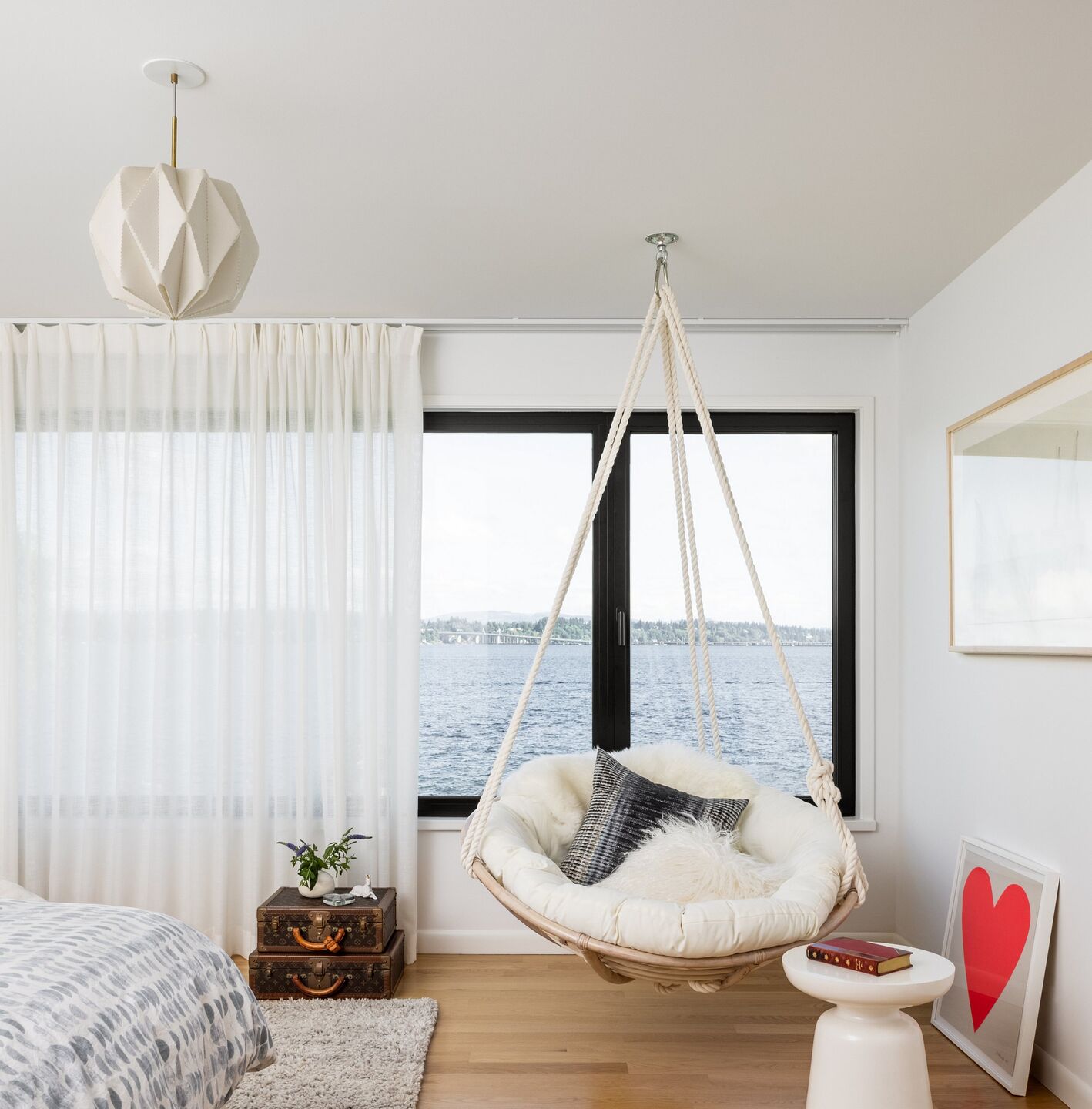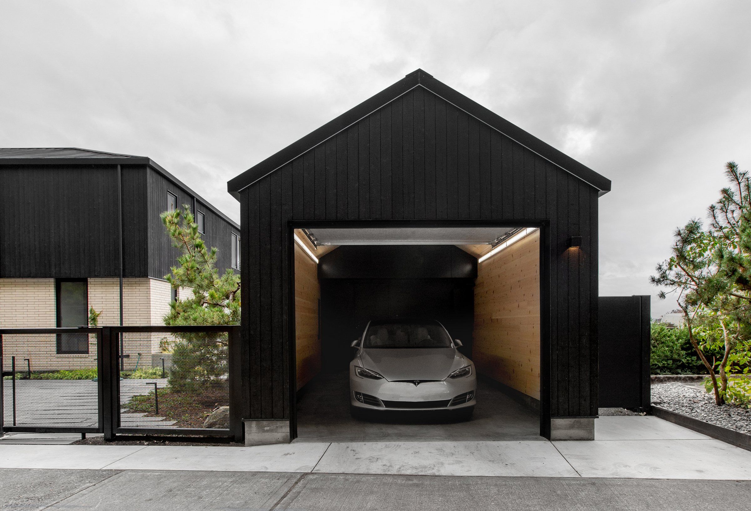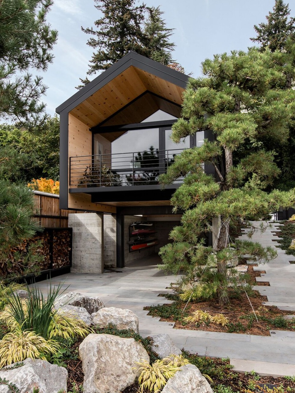 W głównej rezydencji, SHED wyburzył ściany wewnętrzne, tworząc otwartą strefę dzienną z jadalnią i panoramicznym widokiem na Górę Rainier. Centralna wyspa kuchni zapewnia funkcjonalność i swobodny przepływ przestrzeni, a nowe tarasy poszerzają życie na zewnątrz. Górne piętra zostały przearanżowane, by pomieścić sypialnie z łazienkami dla rodziców i dzieci. Piwnica została wyposażona w salon, aneksy kuchenny, pokój multimedialny, saunę i prywatną strefę SPA z cedrową wanną z hydromasażem z widokiem na wodę. Materiały: biała cegła, shou sugi ban, beton i metalowe panele tworzą minimalistyczną paletę pełną kontrastów, która podkreśla trwałość i nowoczesny charakter projektu.