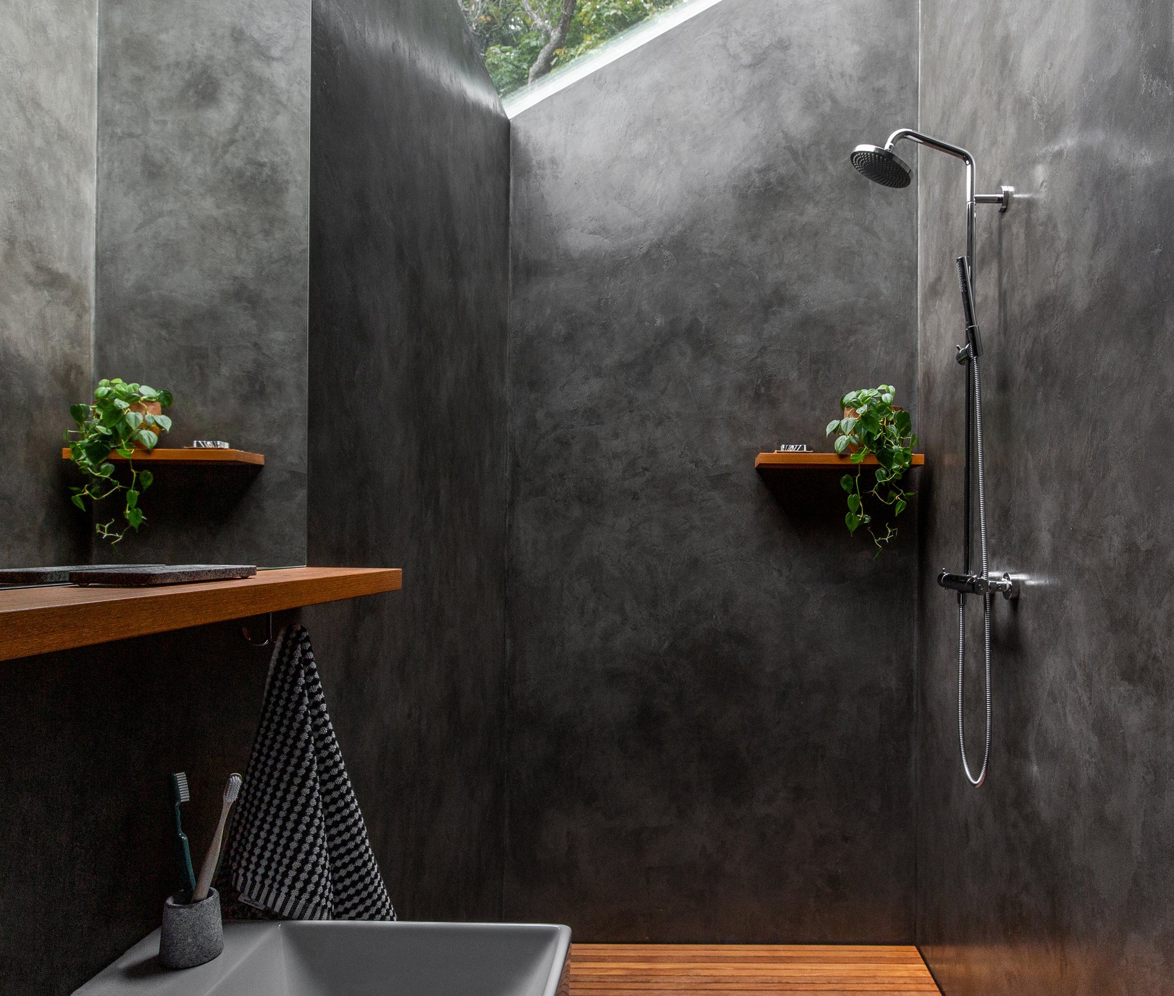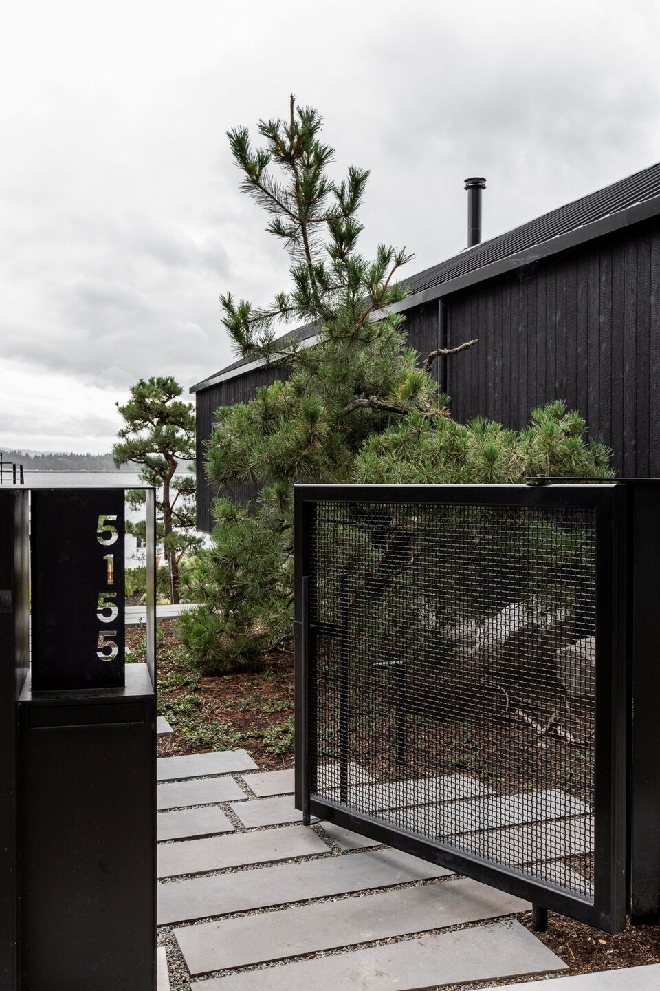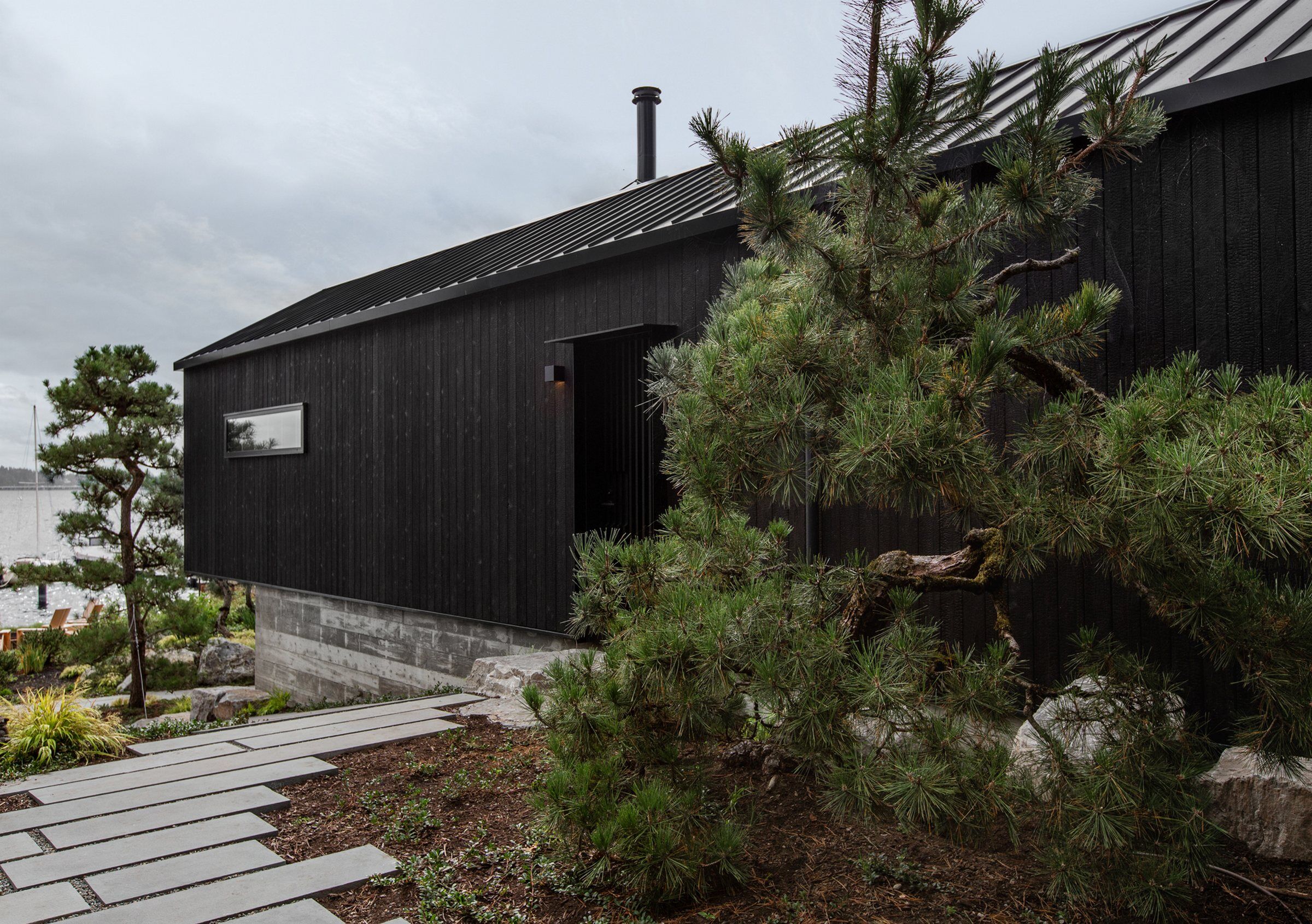 Black Pine Cabin, oddzielona od głównej rezydencji, pełni funkcję przystani, domku dla gości, gabinetu, garażu oraz magazynu na łodzie. Konstrukcja inspirowana jest odwróconą łodzią, a wnętrze wykończono białą sosną, z unikalnym szkieletowym drewnianym stelażem przypominającym szkutnictwo. Zastosowano shou sugi ban jako elewację, co łączy formę z głównym domem. Wnętrze to połączenie naturalnych materiałów, nowoczesnego rzemiosła i minimalistycznej elegancji. Centralne palenisko ze stali dzieli przestrzeń, za którą znajduje się wanna wykończona czarnym kamieniem i świetlik. Dopełnieniem są: zewnętrzny prysznic, przestrzeń magazynowa na kajaki, niestandardowa deska surfingowa oraz optymalizacja techniczna – wszystkie elementy wkomponowane w architekturę tak, aby nie zakłócać jej harmonii.