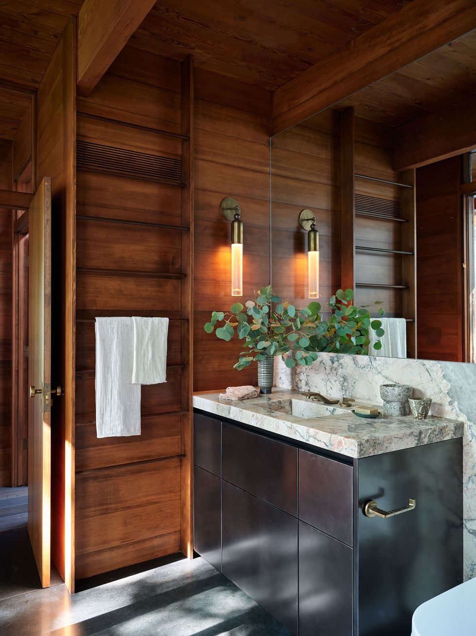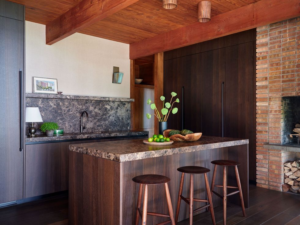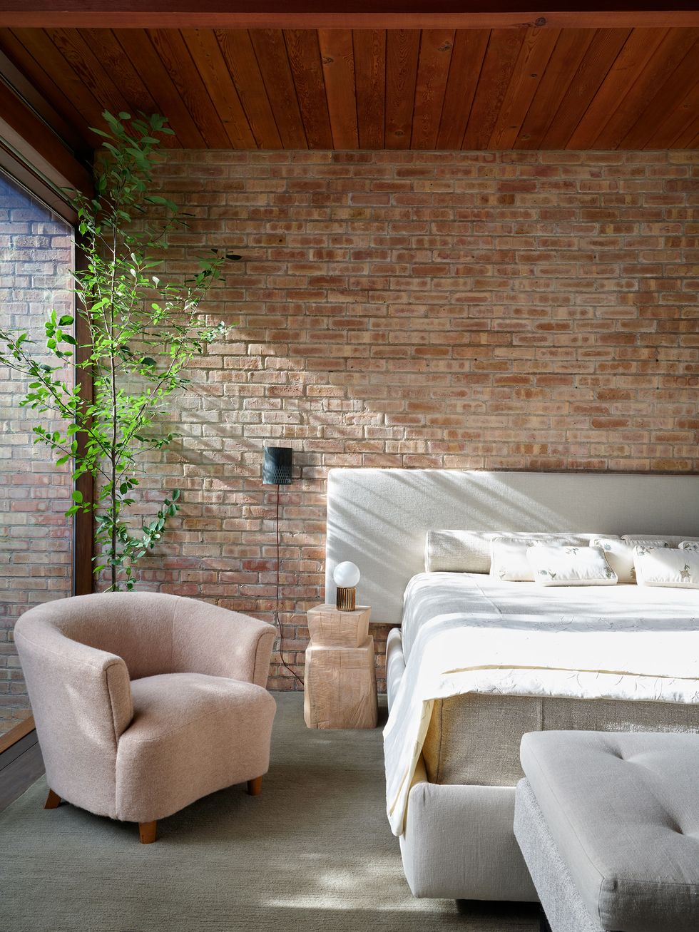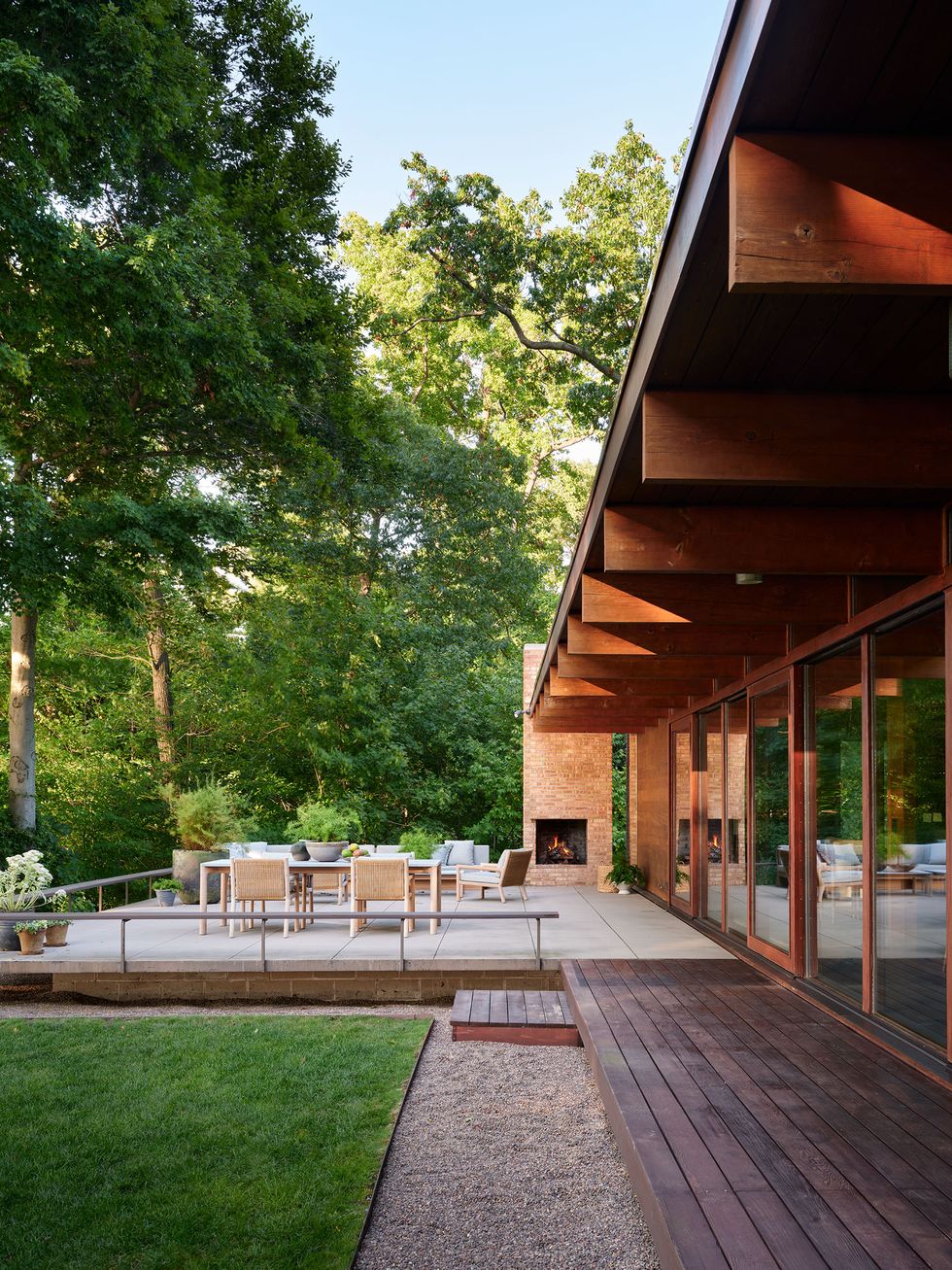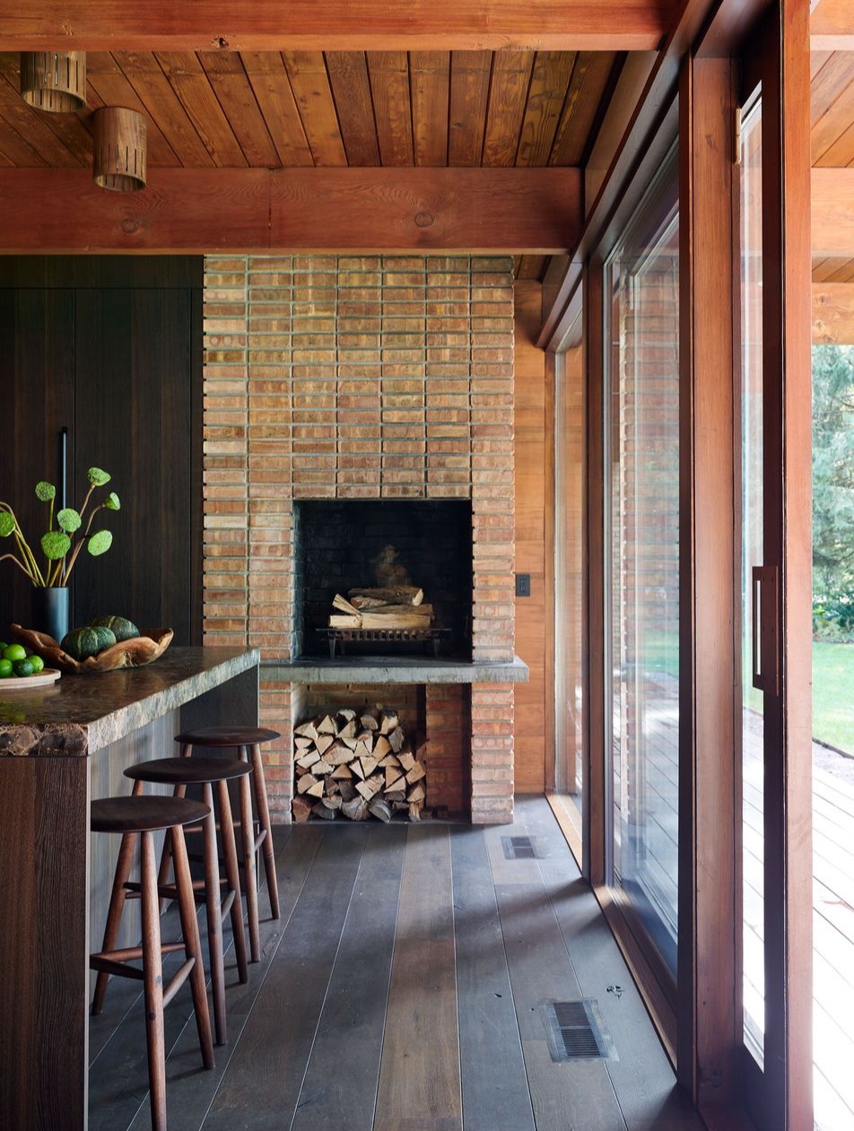 Front budynku cechuje kompozycja cegły i drewnianych żaluzji, podczas gdy elewacja nad jeziorem jest całkowicie przeszklona, otwierając się na wodę i otaczające buki. Wnętrze wypełniają dziedzińce, które podkreślają przestronność i naturalne światło. Akcentem jest asymetrycznie umieszczony kominek z cegły Chicago w różowym odcieniu, tworzący intymną przestrzeń wypoczynkową.
