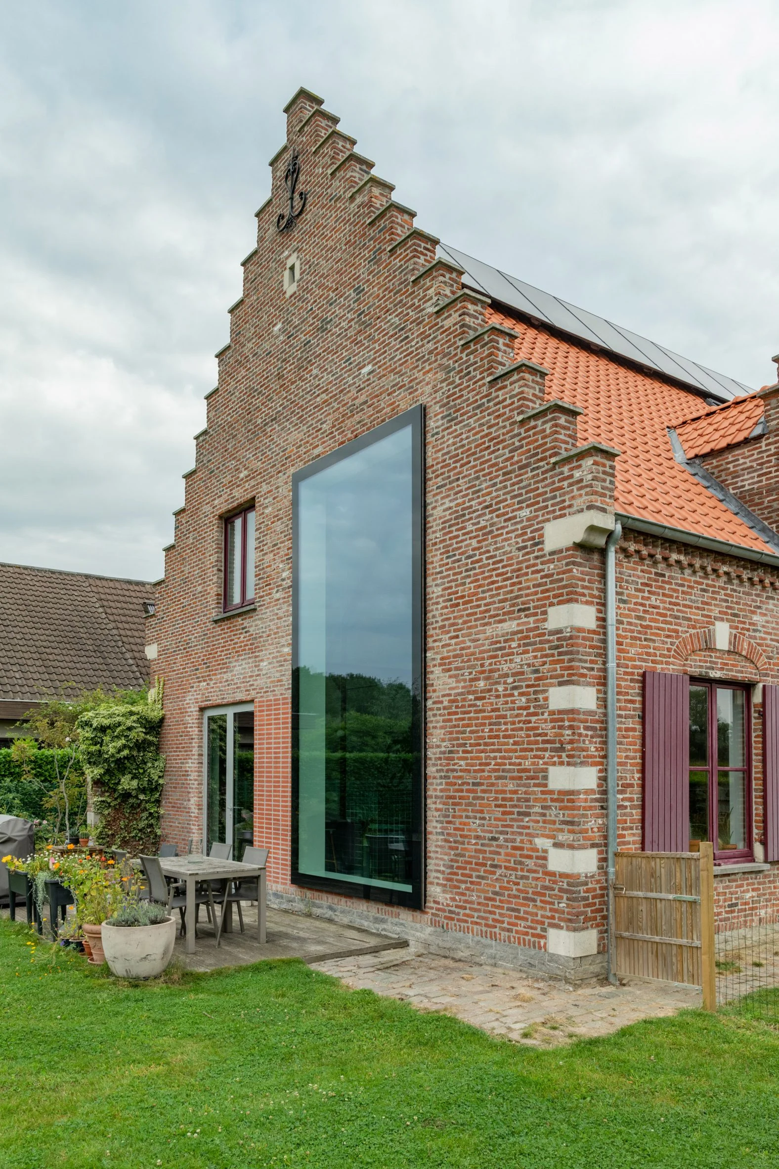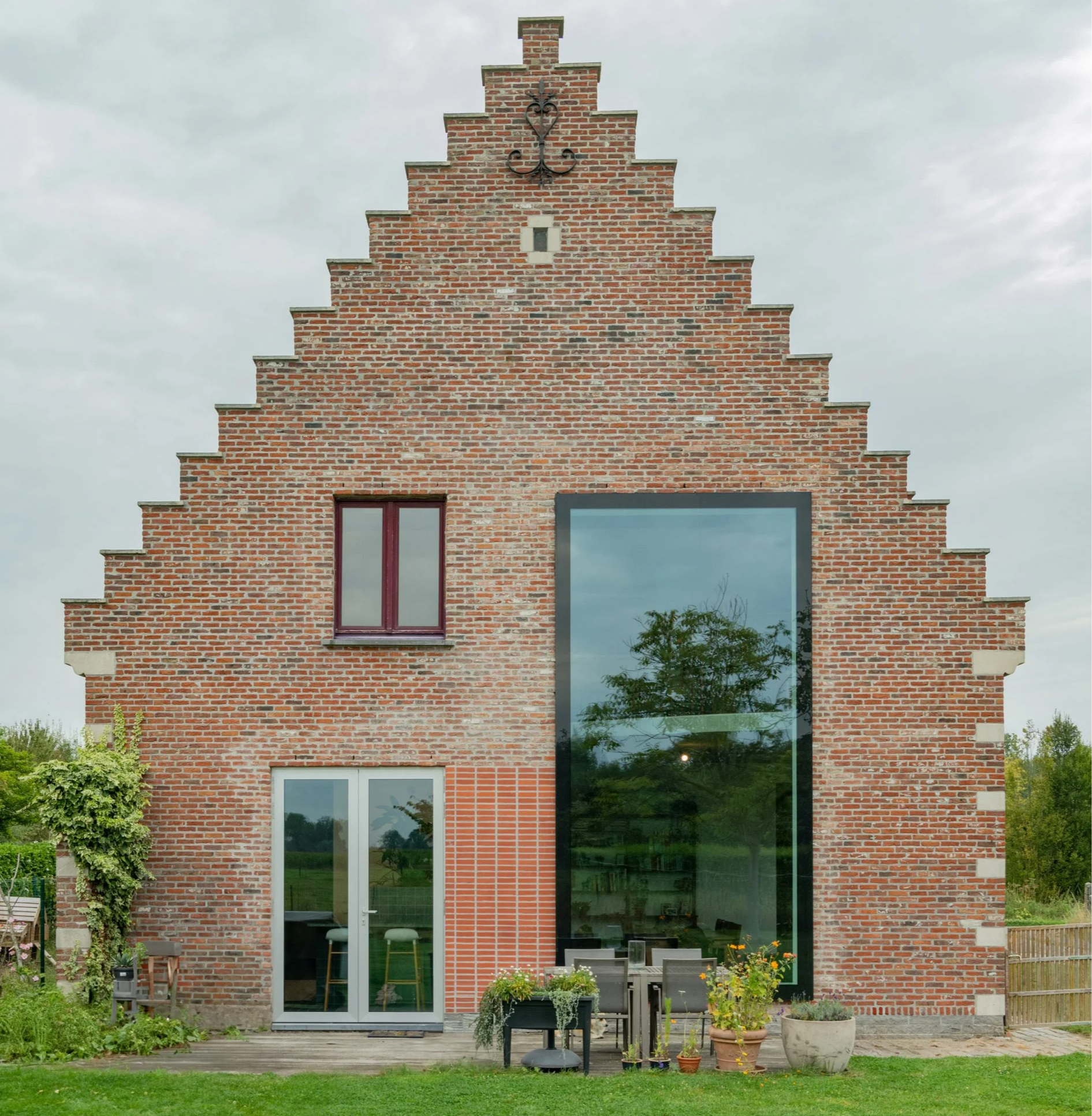 Belgijskie studio Objekt Architecten odnowiło wiejski dom w miejscowości Wichelen, nadając mu nowoczesne wnętrze z odsłoniętego betonu i czerwonych stalowych elementów, zachowując jednocześnie jego tradycyjną ceglaną fasadę. Projekt skoncentrowano na otwarciu wnętrza na otaczający krajobraz, co było szczególnie istotne po tym, jak wcześniejsze uszkodzenia wilgocią doprowadziły do zakrycia charakterystycznych schodkowych szczytów budynku.