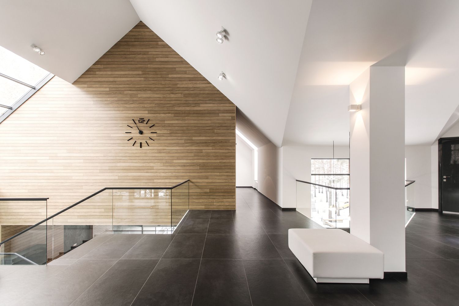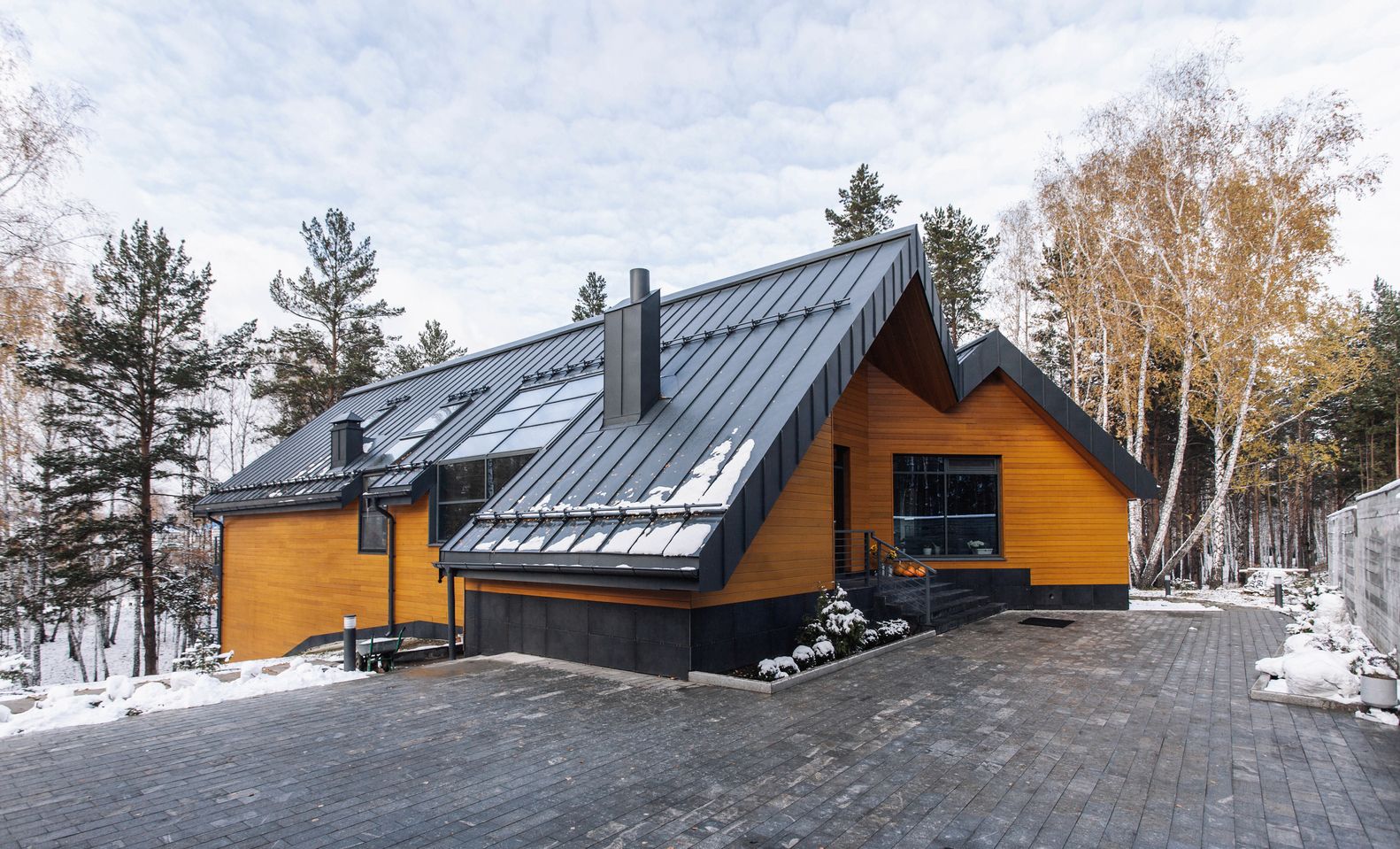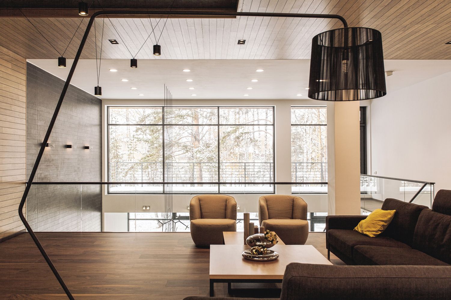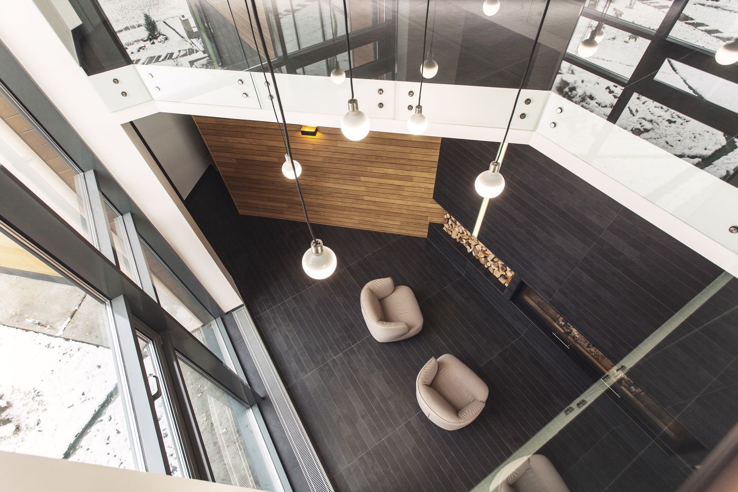 Las oraz bliskość przyrody miały wpływ na decyzję związaną z wykończeniem elewacji – budynek jest jakby „zawinięty” w drewno, które idealnie pasuje do swego otoczenia. Dach wykonano z wysokiej jakości metalu. Drewniana elewacja nadaje całości bardziej dynamiczny charakter. Panoramiczne okna dachowe, które ułożone są w sposób „płynny”, dają wnętrzu sporo naturalnego światła i wizualnie dzielą monolityczną, ogromną powierzchnię dachu.Głównym założeniem wykończenia wnętrza było podkreślenie opadającej kaskadą przestrzeni wewnątrz domu. Elementy wykończenia miały nie obciążać całości materiałami i kształtami, podkreślając jednocześnie bliskie relacje z przyrodą i łącząc się spójnie tworząc minimalistyczną estetykę domu. Z tego względu do wykończenia wnętrza zostały wybrane materiały nie tyko piękne, ale też ekologiczne. Pojawia się tu sporo drewna, granitu o naturalnej fakturze, metal i szkło.