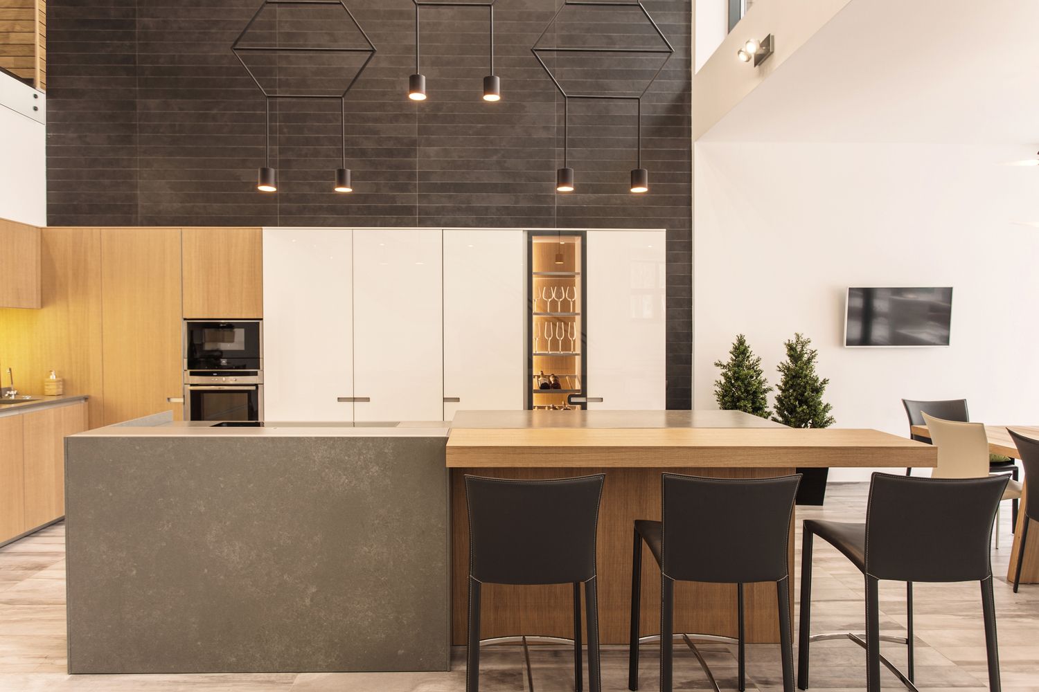 Jednym z ważnych akcentów tego domu jest minimalistyczny kącik z kominkiem, który odgrywa szczególną rolę w zimowe wieczory. Inne ważne miejsce to otwarta, nowoczesna kuchnia wykonana z naturalnych materiałów i połączona z rejonem dużej jadalni.