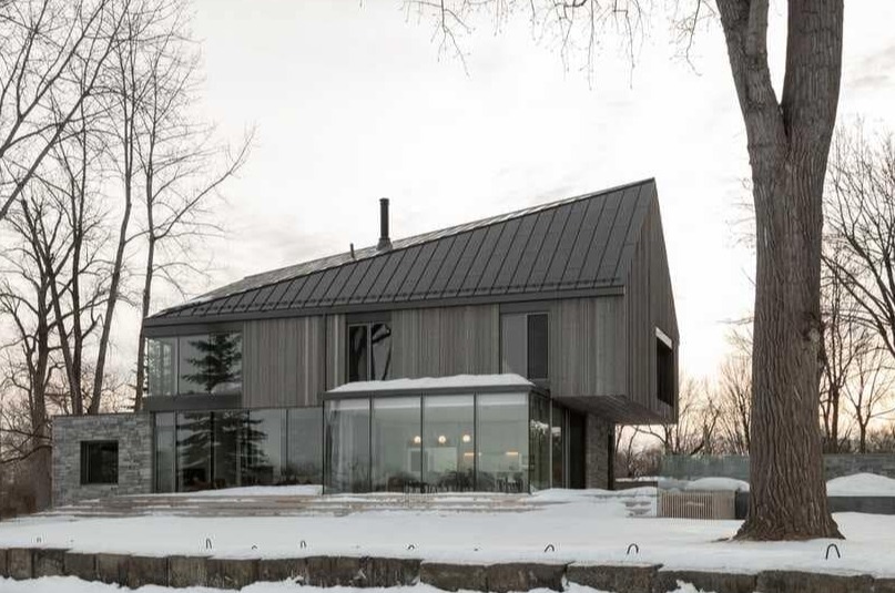 Architekci dopasowali wielkość i formę domu do warunków lokalnych – zapewnia on intymność mieszkańcom i odporność na silne wiatry zachodnie. Piętro zostało przesunięte w celu stworzenia osłoniętego tarasu nad basenem, a linia dachu harmonizuje z naturalnymi kątami otoczenia. Wnętrza dominują podłogi z polerowanego betonu i betonowy kominek, które zestawiono z meblami o neutralnej palecie, podkreślając naturalne walory krajobrazu i zmienność światła w zależności od pory roku. Nowoczesna stodoła Langlois-Lessard łączy elegancję, funkcjonalność i pełną integrację z otoczeniem.
