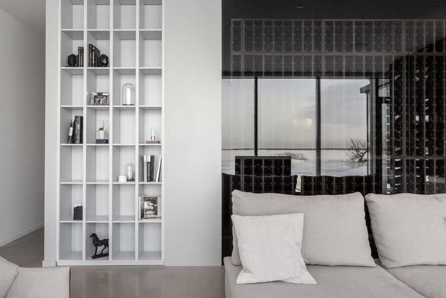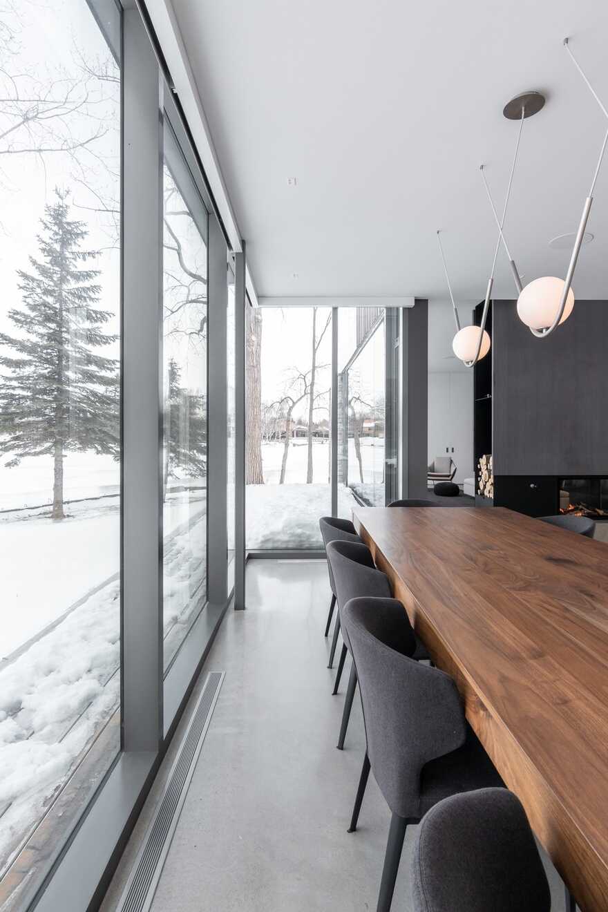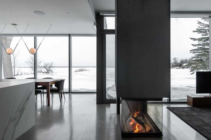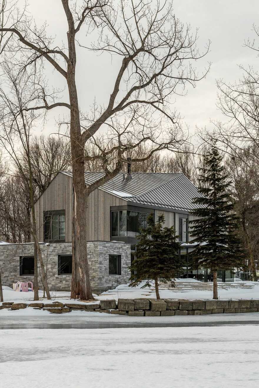 Rezydencja Langlois-Lessard, zaprojektowana przez Chevalier Morales Architectes w kanadyjskiej gminie Léry, została zlokalizowana na terenach zalewowych i zbudowana z myślą o harmonii z naturą. Nowoczesna stodoła zajmuje zaledwie siedem procent działki, dzięki czemu zachowano rosnące drzewa i dziewicze piękno otoczenia. Dom o powierzchni 418 m² otwiera się panoramicznymi przeszklonymi ścianami na jezioro i naturalny krajobraz, tworząc wyjątkowe połączenie wnętrza z zewnętrzem. Centralnym punktem domu jest otwarty kominek, a minimalistyczna, wąska klatka schodowa podkreśla poczucie przestronności. Parter z niskimi sufitami wzmaga efekt rozciągających się widoków, natomiast sypialnie na piętrze wyróżniają się zróżnicowanymi liniami sufitów, które tworzą zmienną grę światła i cienia.