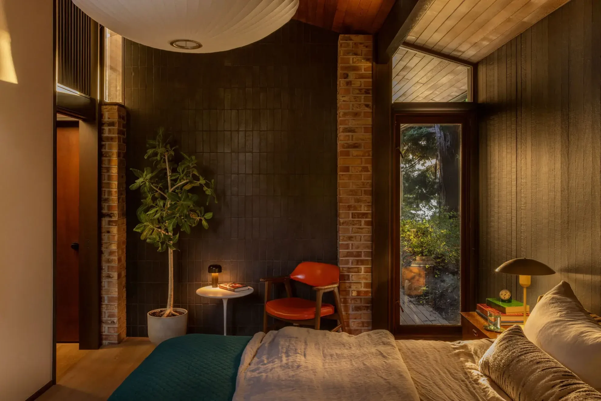 Problem zbyt otwartej sypialni głównej rozwiązano poprzez zmianę konfiguracji jej wejścia poprzez powiększoną garderobę. Dwustronny kominek łączący się z salonem odnowiono, wykończono płytką z glazurowanej cegły i wizualnie oddzielono od sypialni. Strategicznie rozmieszczone wewnętrzne oświetlenie i lustra zapewniają prywatność i ciągły nacisk na światło. Łazienkę starannie przerobiono i odświeżono za pomocą niestandardowych mebli i efektownych czarno-białych płytek. Na południowym krańcu domu dwie istniejące łazienki przekształcono w jedną z drzwiami oddzielającymi toaletę od łazienki z prysznicem. Łazienka łączy się z pokojem dziecięcym na jednym końcu i wspólnym korytarzem na drugim. Eliminuje to potrzebę łazienki dla gości, zapewniając jednocześnie prywatność przylegającej sypialni.