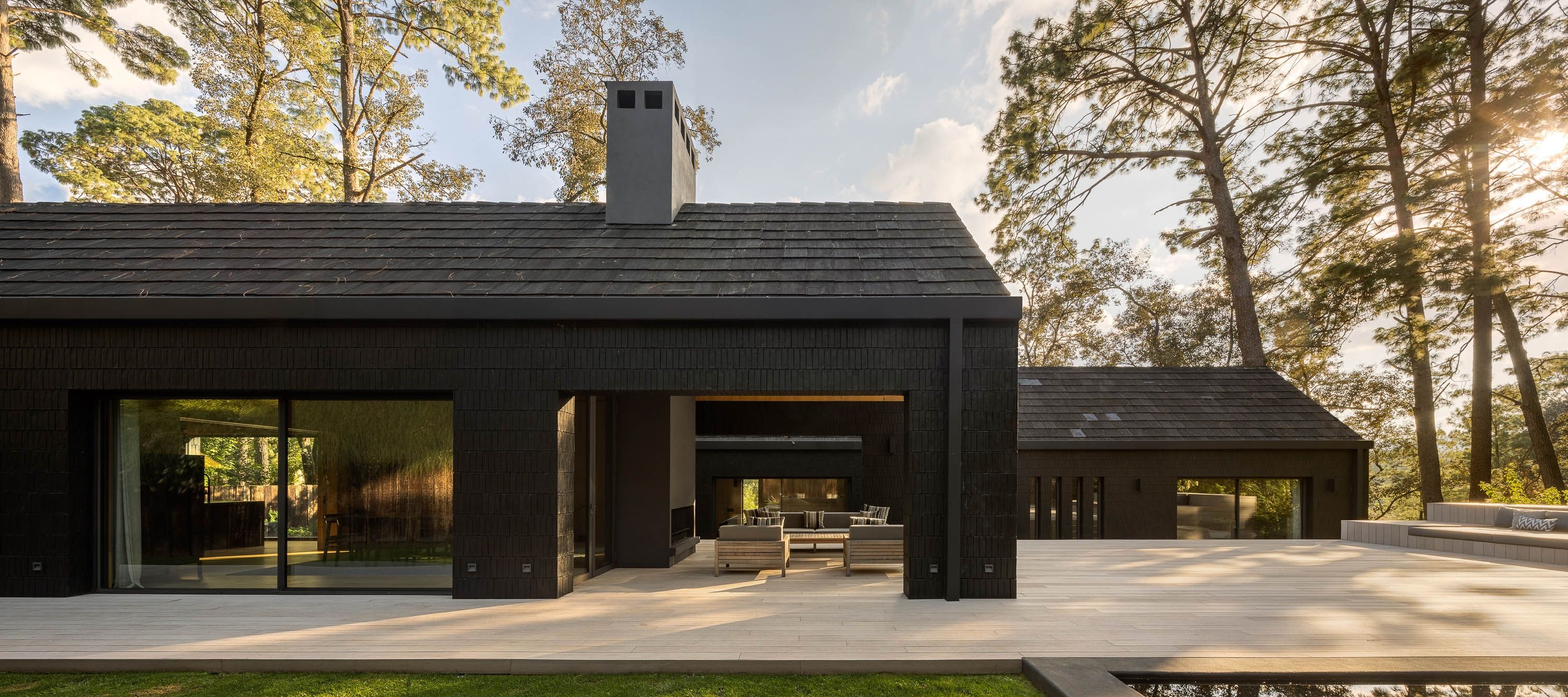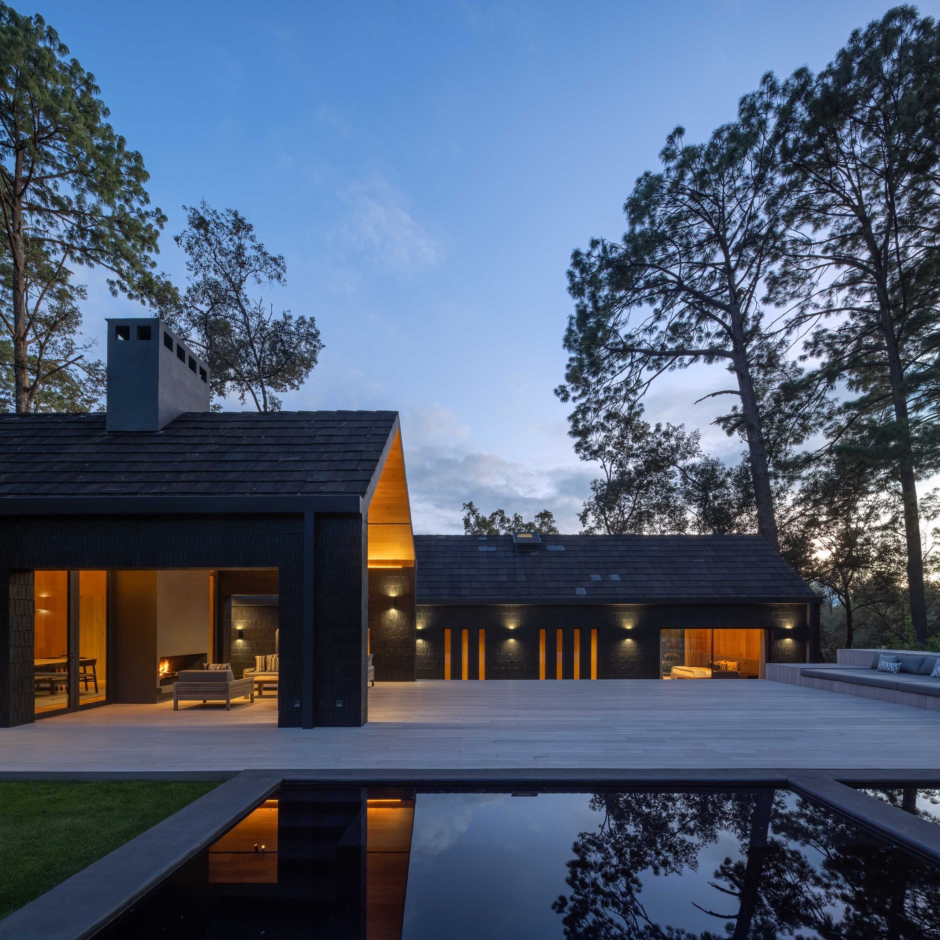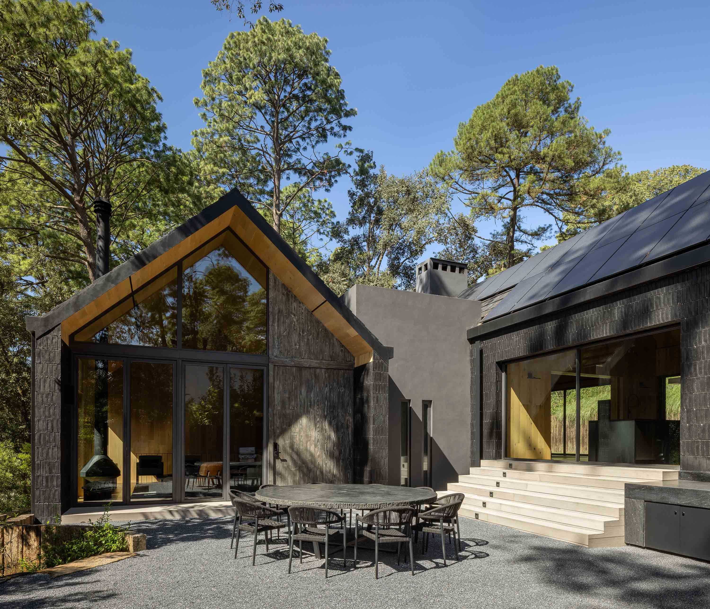 Z zewnątrz dom przyciąga uwagę czarną, drewnianą elewacją, która nadaje mu elegancki i wyciszony charakter. Dwuspadowe dachy, charakterystyczne dla lokalnej architektury Valle de Bravo, nadają bryle znajomą, archetypiczną formę, jednocześnie wpisując ją w kontekst regionu.