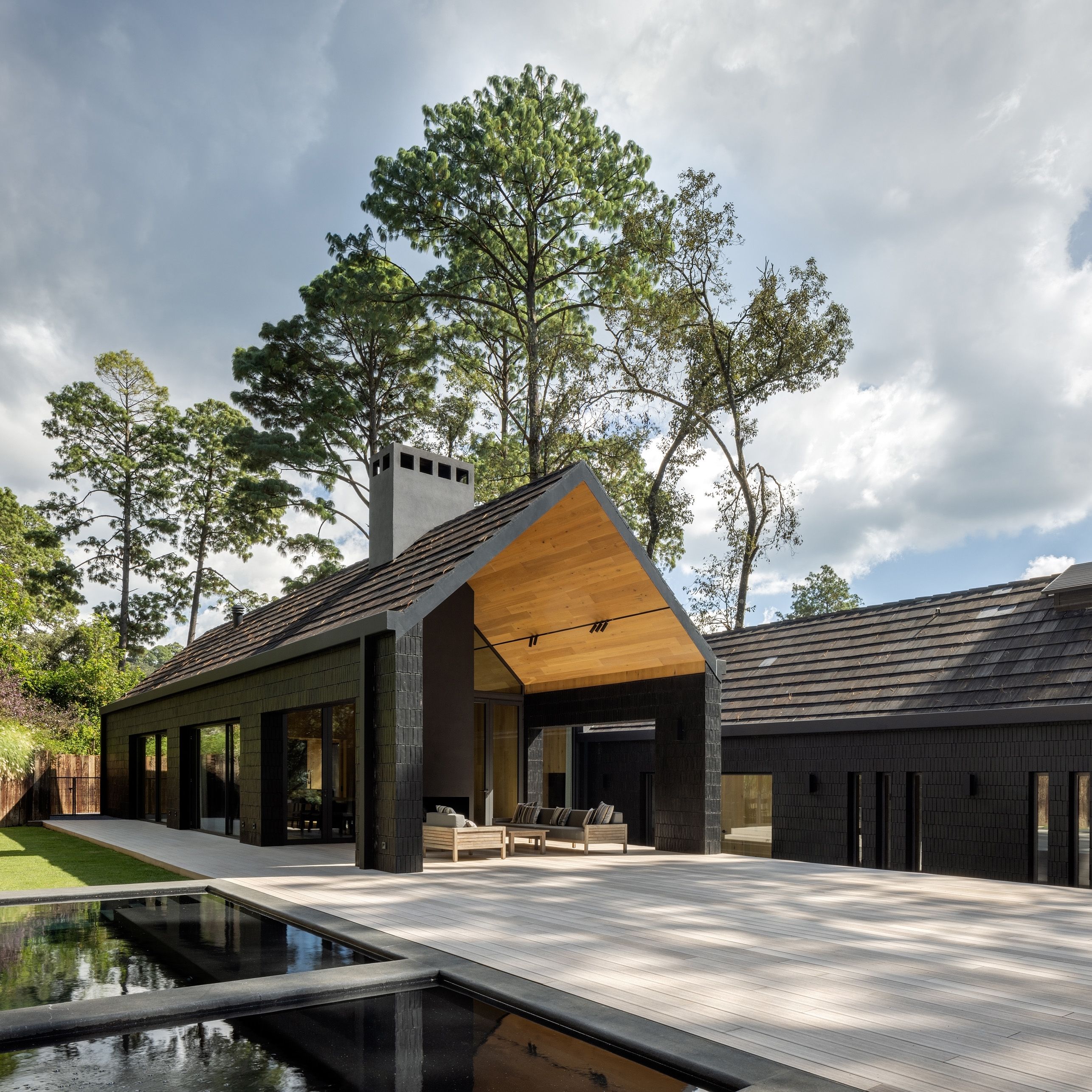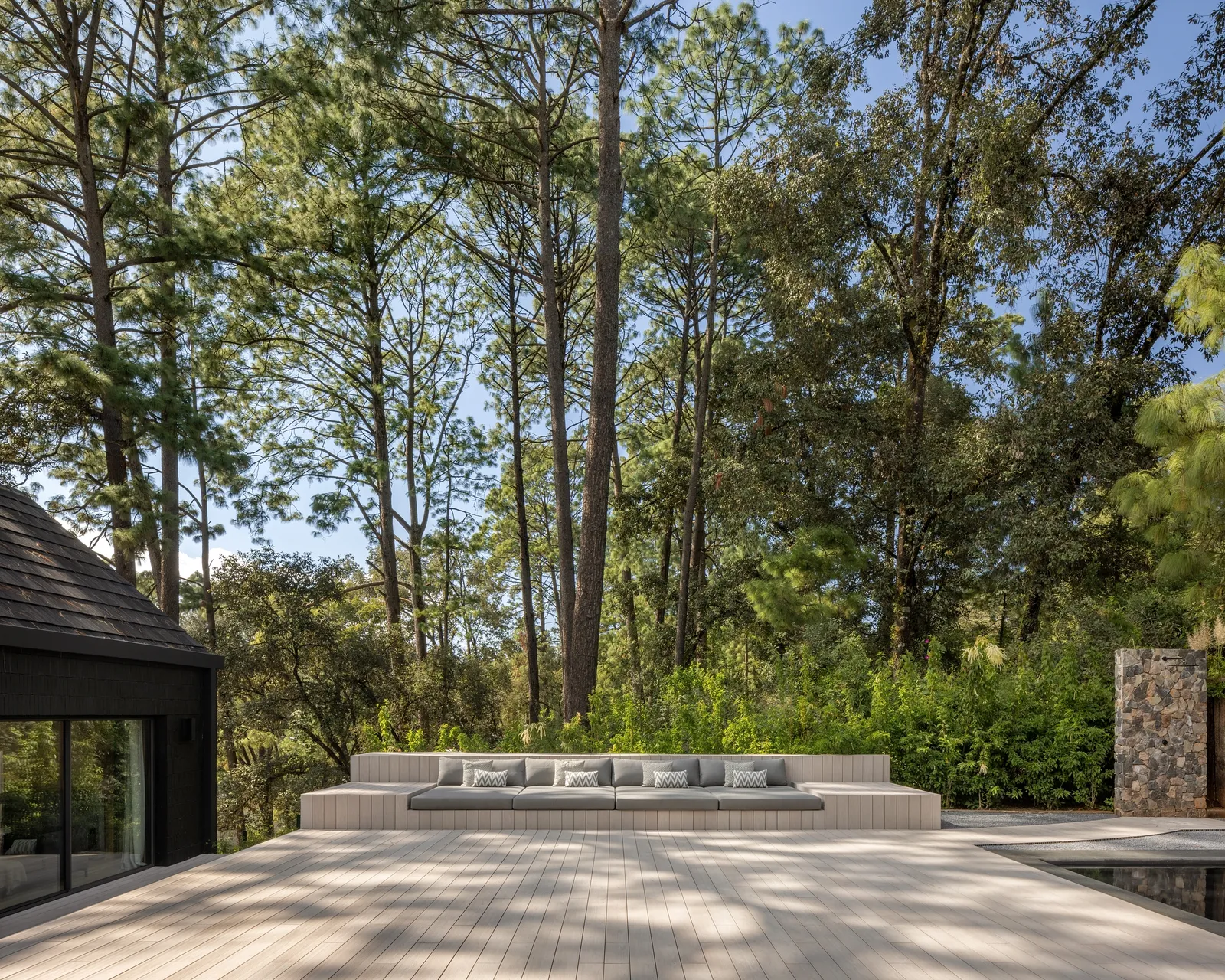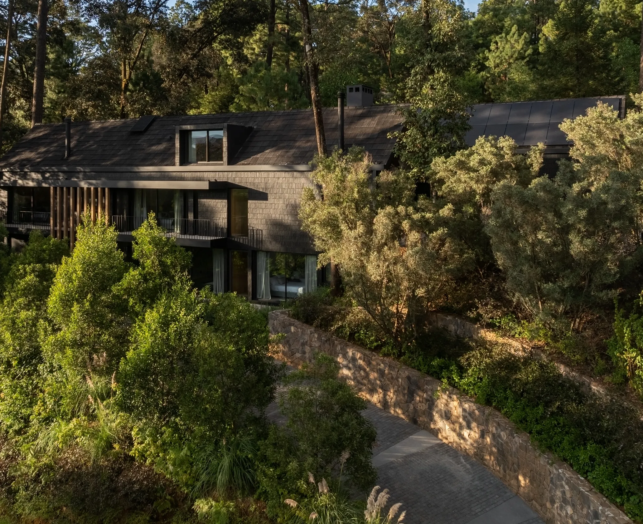Z zewnątrz dom przyciąga uwagę czarną, drewnianą elewacją, która nadaje mu elegancki i wyciszony charakter. Dwuspadowe dachy, charakterystyczne dla lokalnej architektury Valle de Bravo, nadają bryle znajomą, archetypiczną formę, jednocześnie wpisując ją w kontekst regionu.