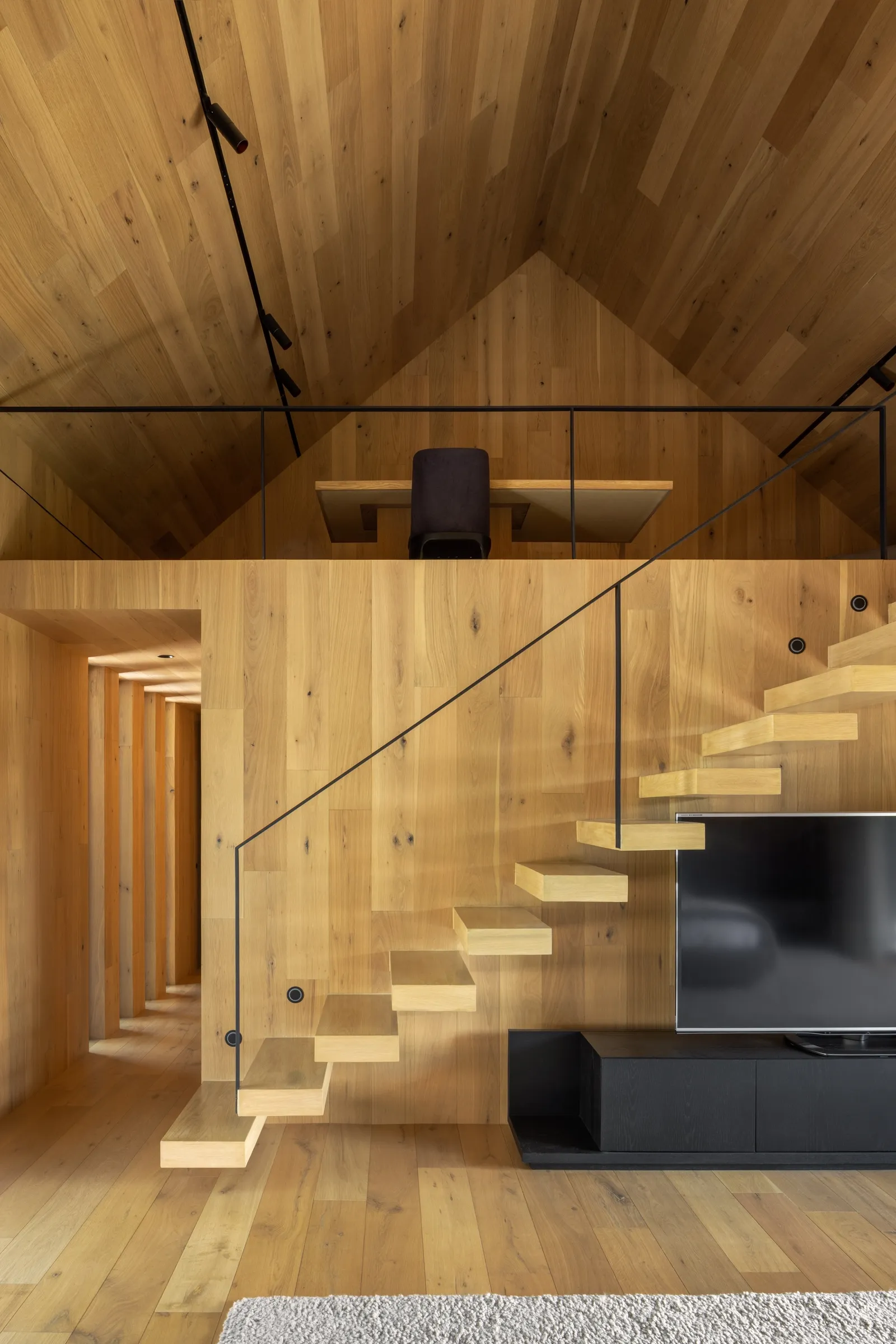 Oświetlenie łączy światło naturalne z dyskretnym, pośrednim oświetleniem sztucznym. W ciągu dnia słońce podkreśla strukturę drewna i przestrzeń pod dachami dwuspadowymi, nocą zaś ciepłe światło wydobywa z mroku czarną bryłę, tworząc wrażenie luksusowej chaty w sercu lasu.