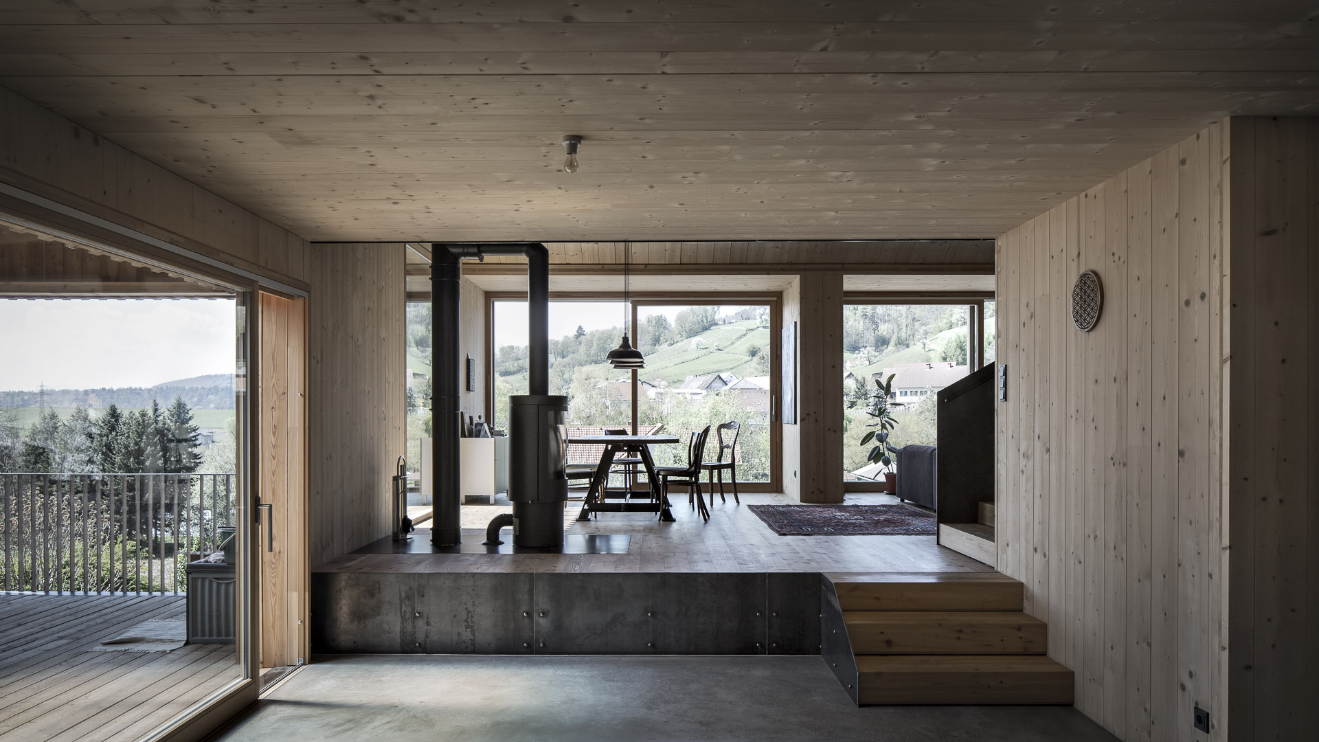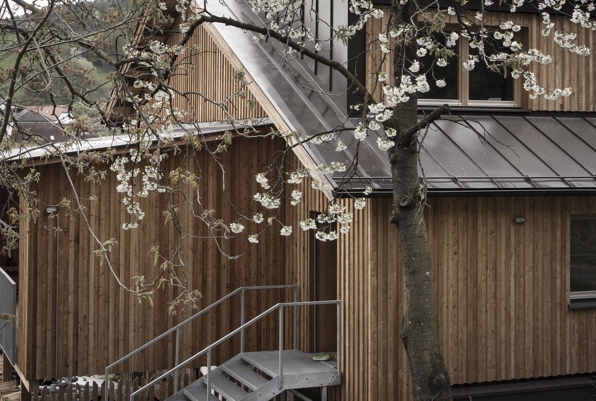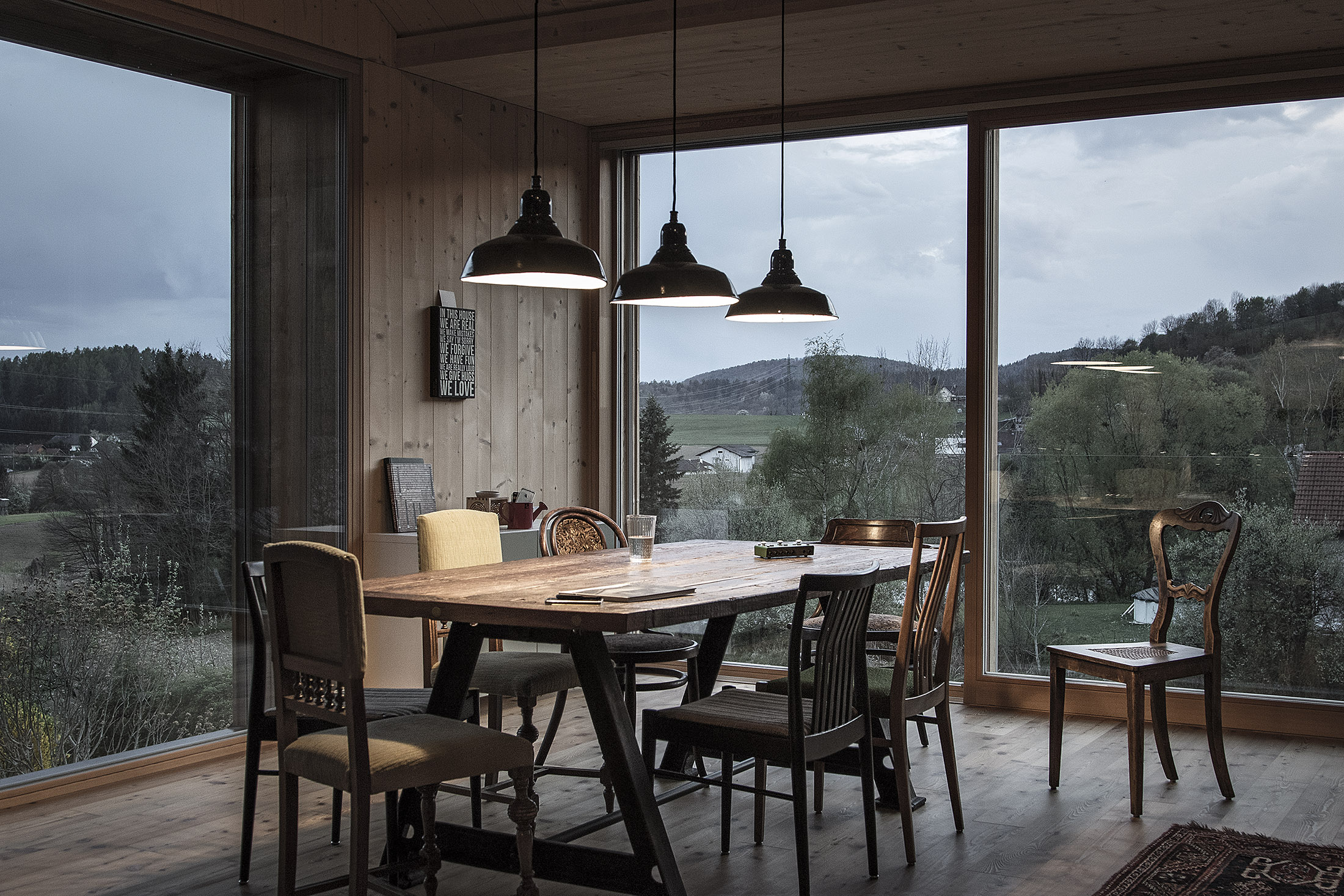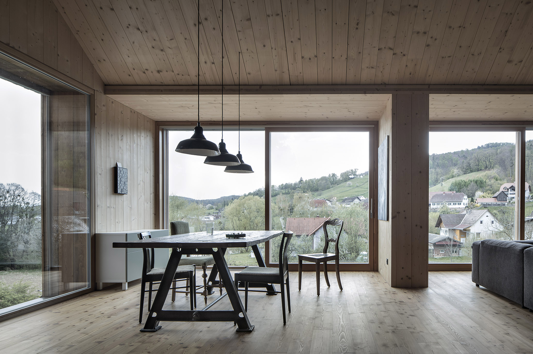 Architekci postawili na naturalne materiały, przede wszystkim drewno, które nawiązuje do lokalnej tradycji budownictwa wiejskiego. Precyzyjnie zaprojektowane otwory okienne kadrują widoki na pagórkowaty krajobraz Styrii i zapewniają wnętrzom dużą ilość naturalnego światła.