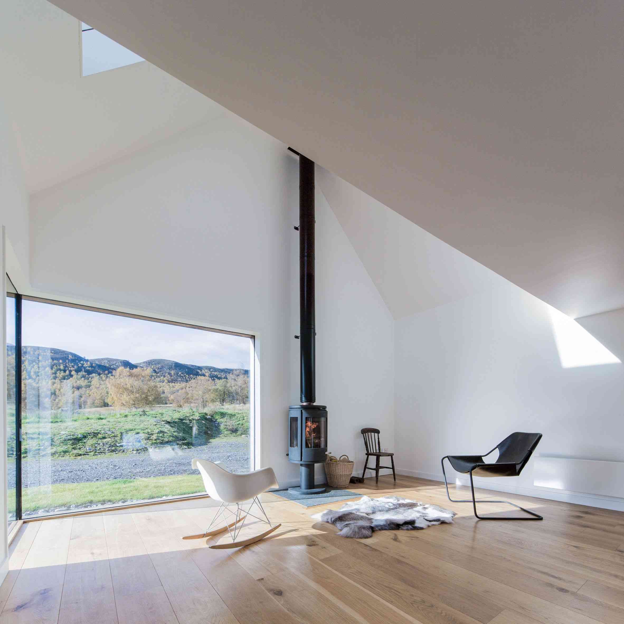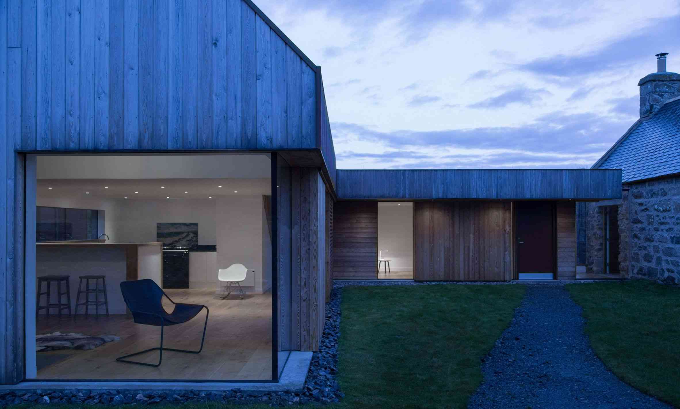Przybudówka w kształcie litery „U” została usytuowana z tyłu oryginalnego budynku i delikatnie obniżona względem poziomu terenu, co pozwoliło lepiej zintegrować ją z otoczeniem i stworzyć osłoniętą przestrzeń zewnętrzną o własnym mikroklimacie. Wnętrze o powierzchni 120 m² mieści kuchnię i salon z piecem na drewno oraz duże przeszklenia od strony południowo-zachodniej z widokiem na górę Lochnagar. Przesuwne drzwi otwierają przestrzeń dzienną na dziedziniec pomiędzy starą i nową częścią domu, a przeszklony łącznik subtelnie oddziela historyczną kamienną fasadę od współczesnej, modrzewiowo-metalowej architektury.