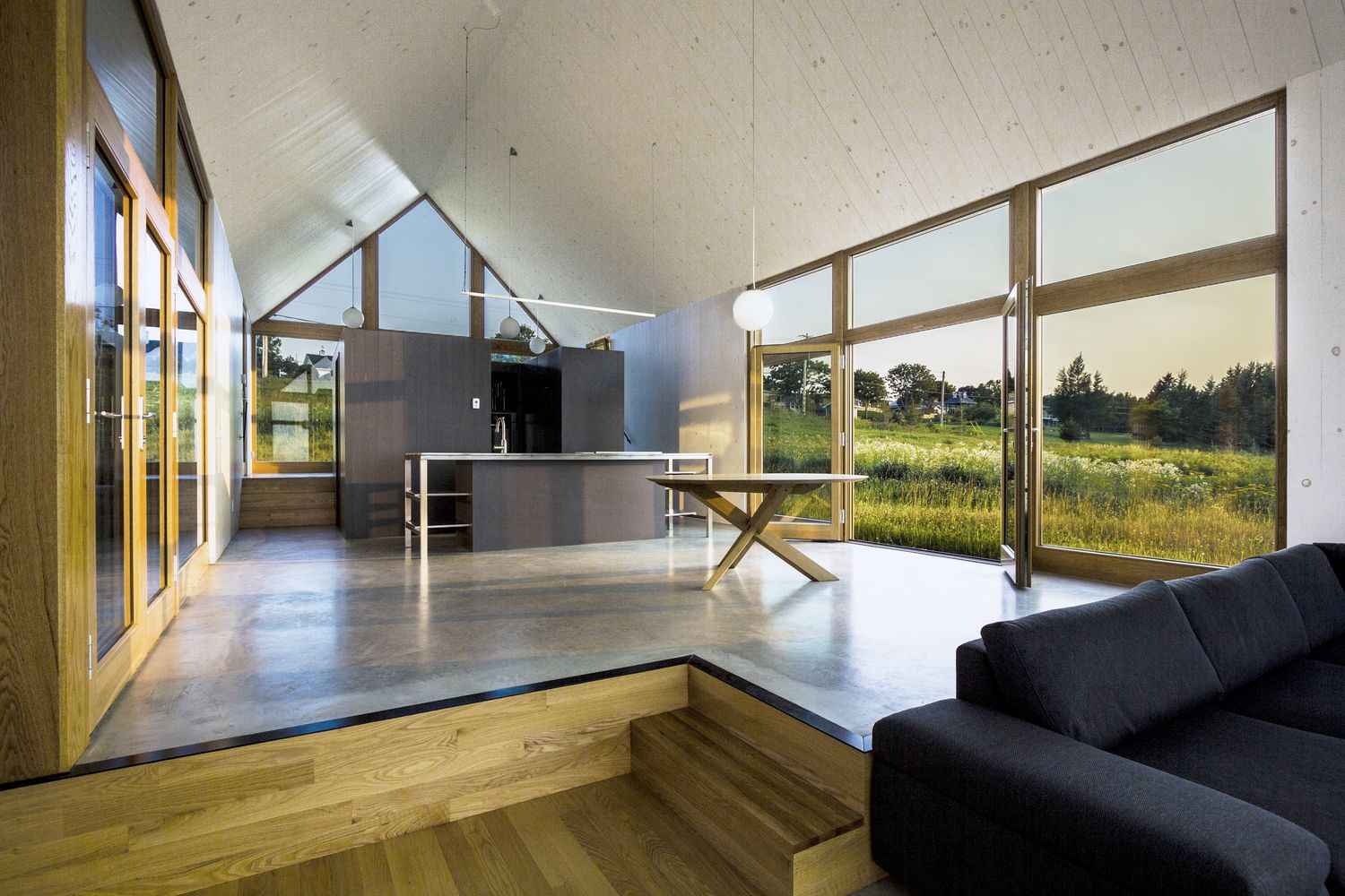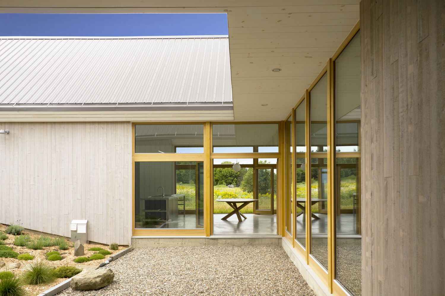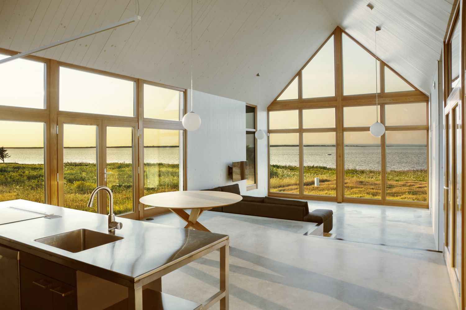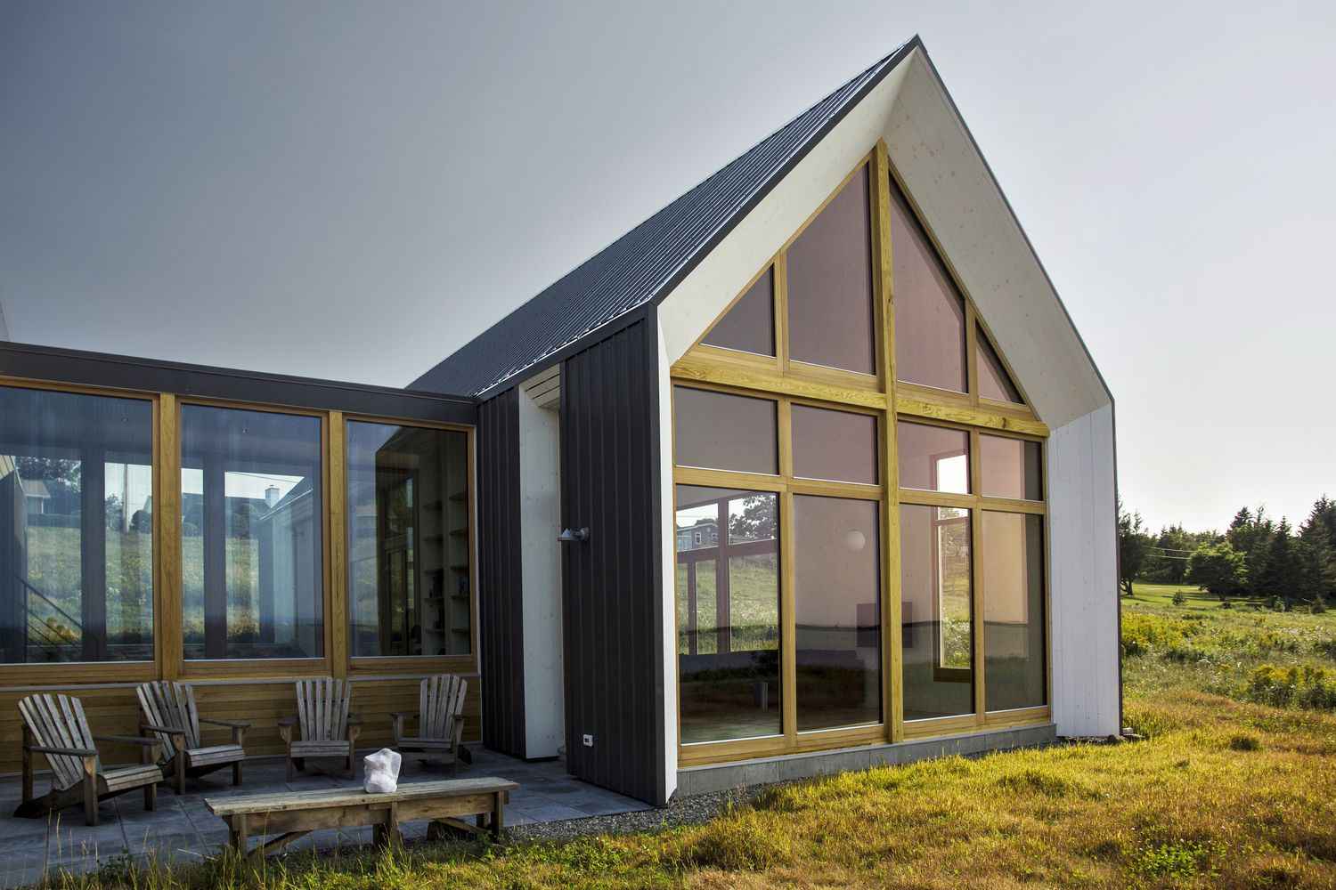 Bliźniacze budynki połączone są przeszklonym przejściem, które pełni funkcję przestrzeni do pracy oraz oferuje panoramiczne widoki na morze. Długość i ułożenie przejścia gwarantują prywatność między częścią dzienną a sypialną, a powstałe w ten sposób zagłębienie zewnętrzne zostało zagospodarowane na osłonięty od wiatru taras. Projekt Les Jumelles to przykład nowoczesnej stodoły w kanadyjskim wydaniu – prosty, funkcjonalny i doskonale wpisany w naturalne otoczenie nadmorskiego krajobrazu.