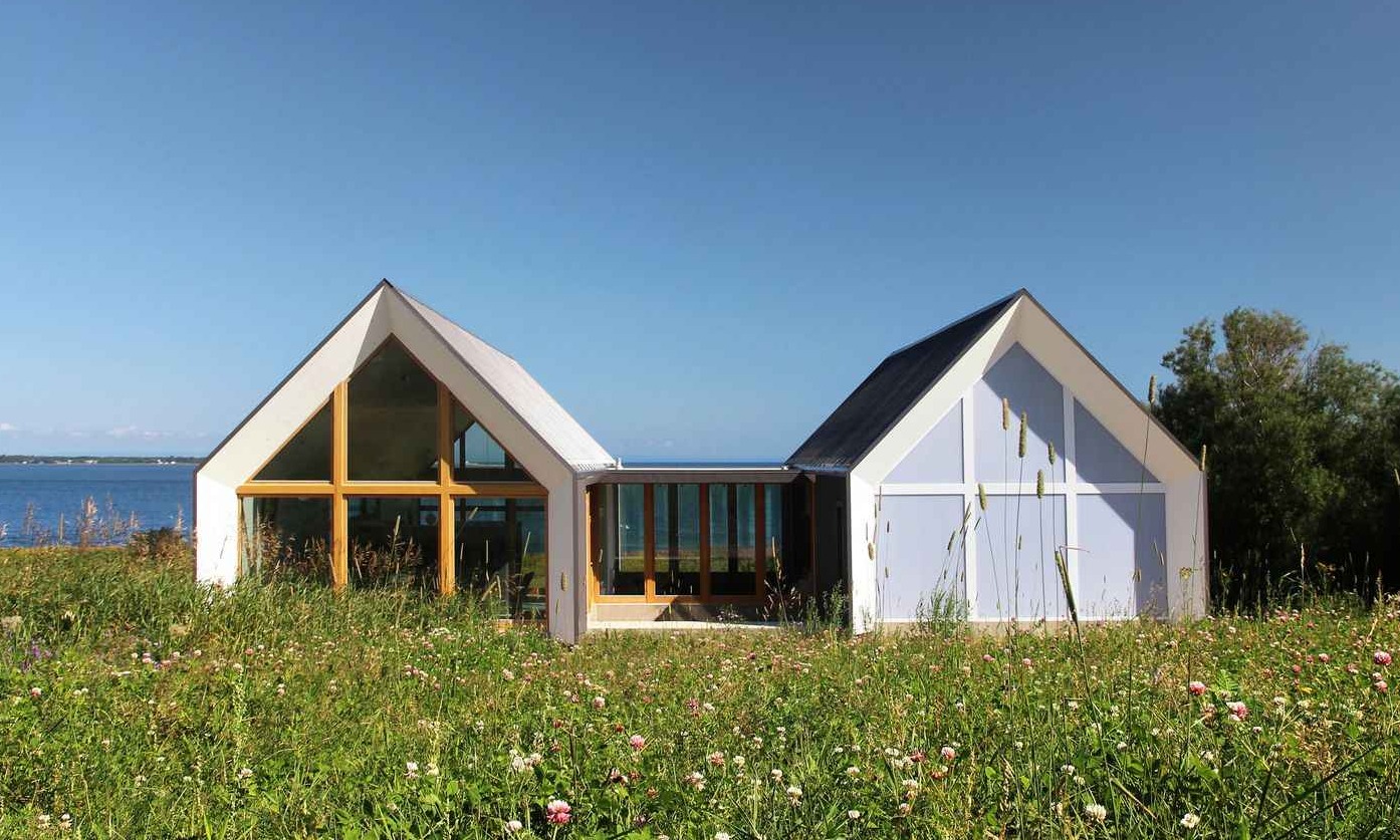 Dom o nazwie Les Jumelles powstał w malowniczej wiosce Caraquet w Kanadzie i składa się z dwóch bliźniaczych konstrukcji, które tworzą jednorodzinny, wakacyjny dom. Budynek został zaprojektowany tak, aby w pełni wykorzystać widoki na kanadyjską zatokę Baie-des-Chaleurs i harmonijnie wpisać się w nadmorski krajobraz. Działka, położona zaledwie kilkaset metrów od centrum wioski i około 60 metrów od piaszczystej plaży, zapewnia idealną lokalizację dla spokojnego wypoczynku w otoczeniu przyrody. Fraza nowoczesna stodoła odzwierciedla zarówno prostą formę architektury, jak i inspiracje tradycyjną, lokalną zabudową.