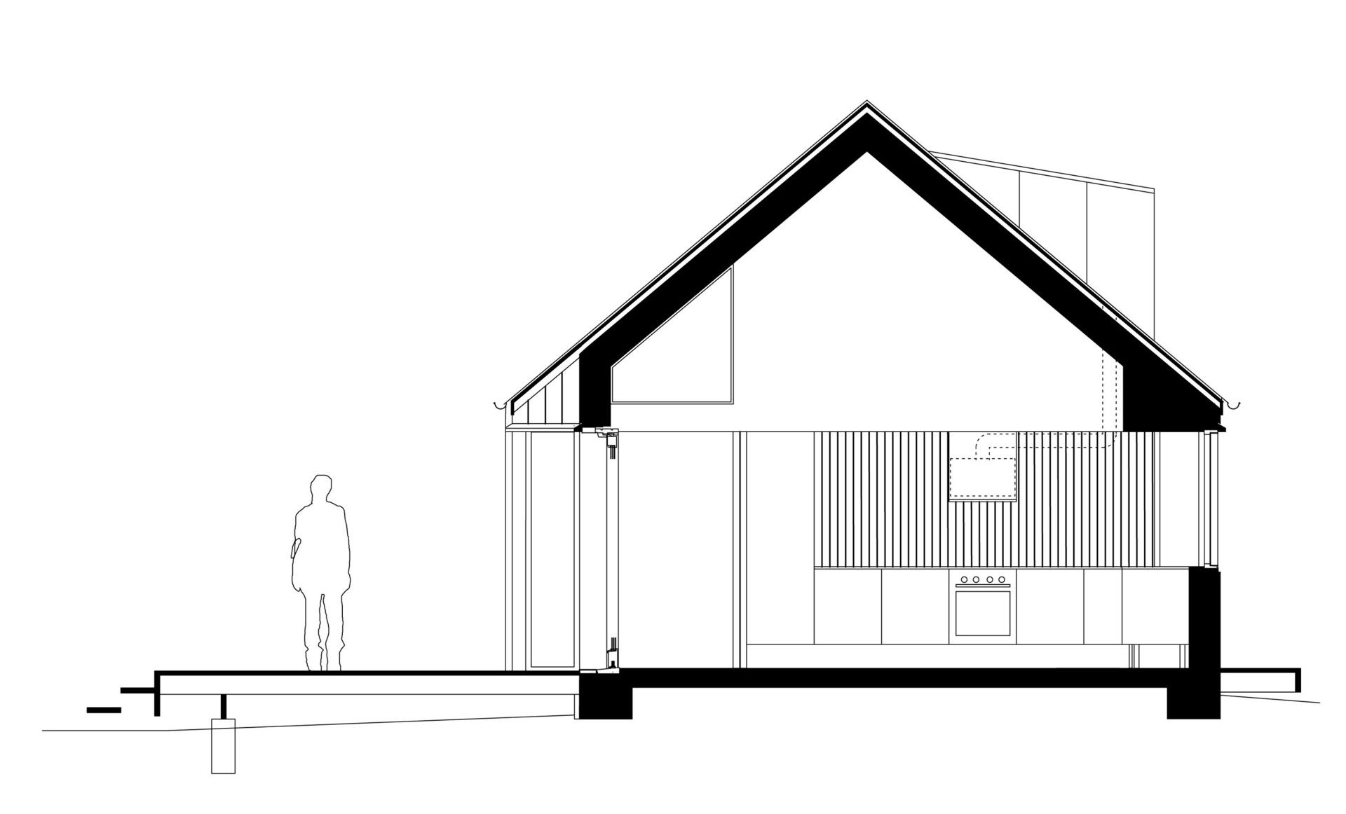 Elewacja budynku została wykonana z surowego, nielakierowanego drewna, które z biegiem lat będzie pięknie się starzeć, przybierając szlachetny, srebrzysty odcień. Dach pokryto trwałą blachą cynkową, która nie tylko zapewnia doskonałą ochronę przed warunkami atmosferycznymi, ale też nie wymaga konserwacji. Taras z drewna modrzewiowego stanowi naturalne przedłużenie przestrzeni mieszkalnej – idealne miejsce do wypoczynku w otoczeniu natury.