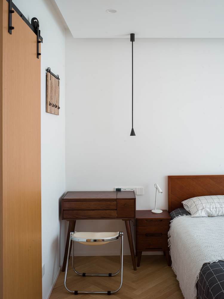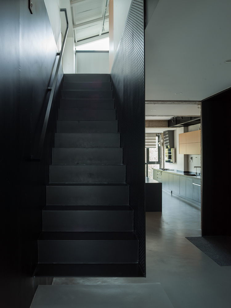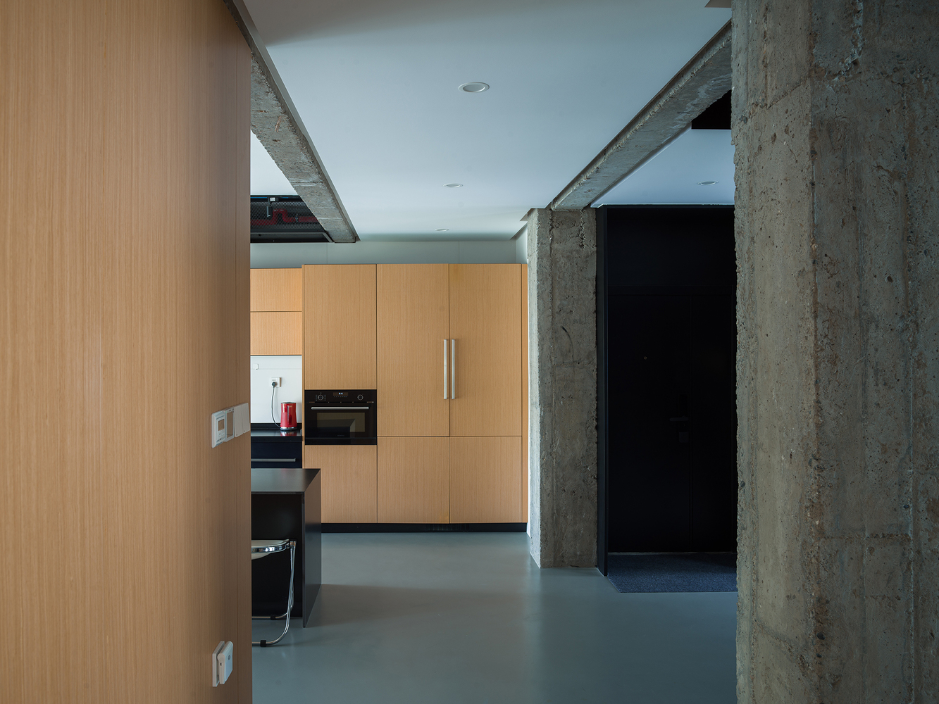 Paleta materiałów i kolorów została starannie dobrana, by stworzyć spokojne, zrównoważone wnętrze. Dominuje zestawienie czerni, bieli, szarości i koloru drewna. Betonowe podłogi i odsłonięte belki konstrukcyjne kontrastują z lekkimi ściankami działowymi i meblami w naturalnym fornirze. Czerń pojawia się w detalach: balustradach, obramowaniach drzwi czy komponentach schodów. Wszystko to tworzy logiczną, przejrzystą i relaksującą kompozycję wizualną.