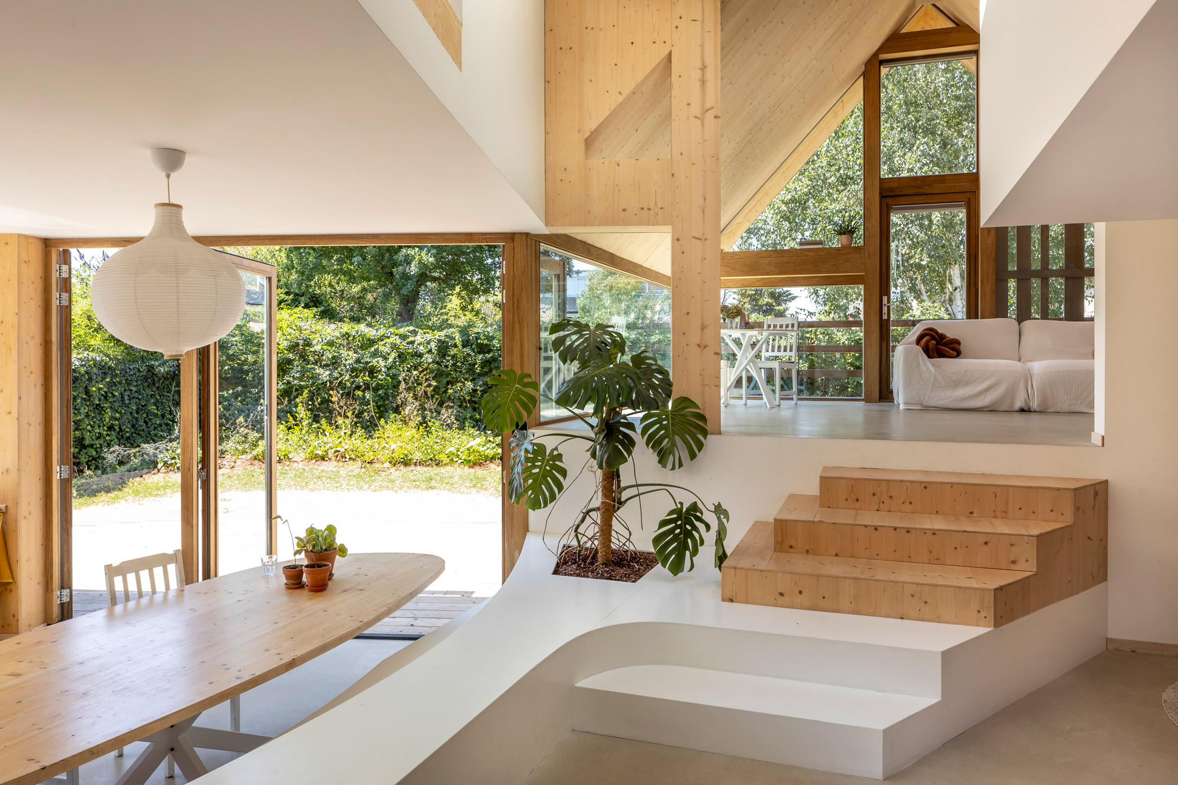 Dominującym materiałem jest drewno, które pokrywa wnętrze i nadaje mu ciepły, naturalny charakter. Jednocześnie przestrzeń jest minimalistyczna i uporządkowana – bez zbędnych detali, skupiona na świetle i proporcjach.