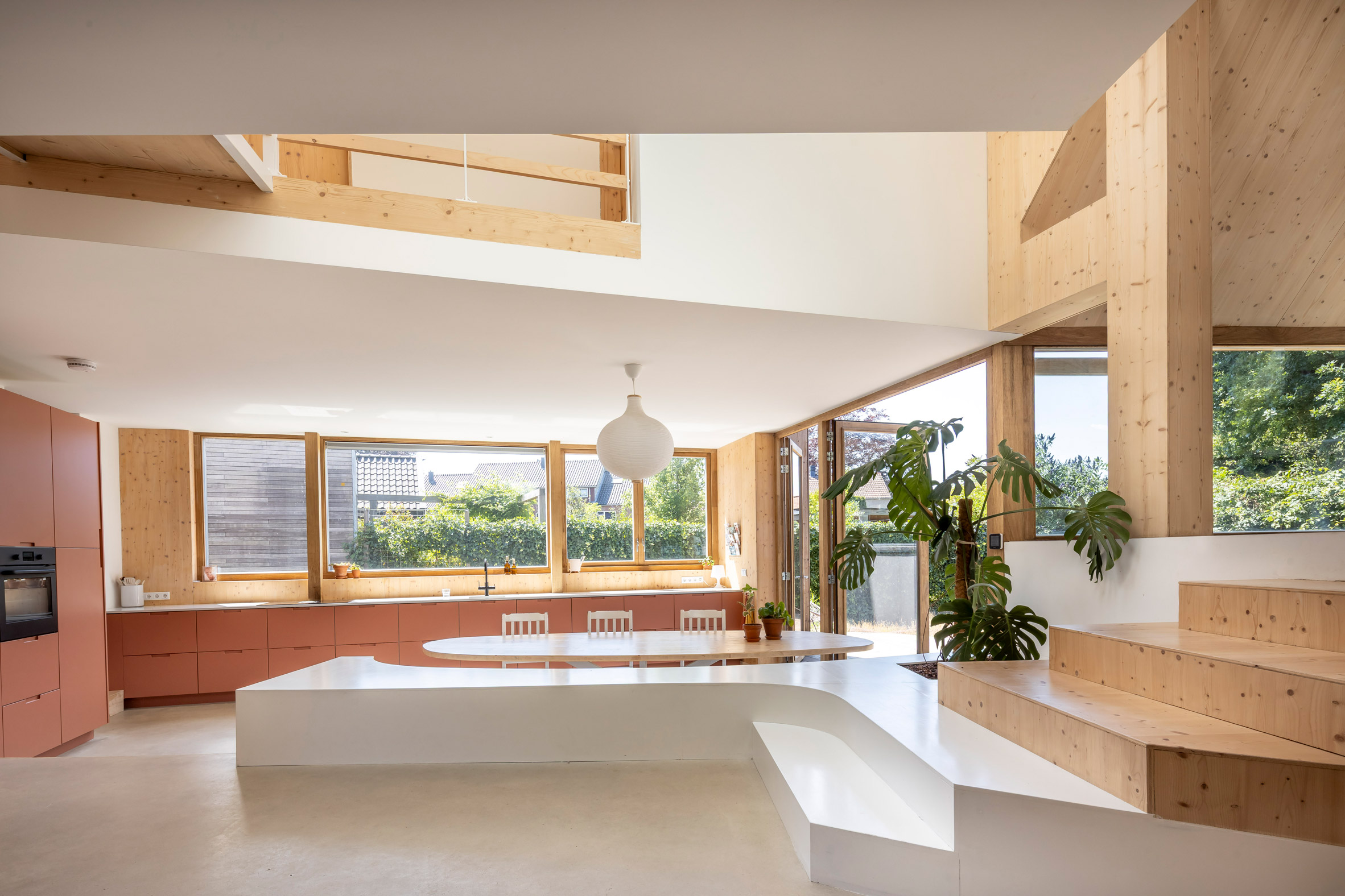 Najciekawsze w tym projekcie jest to, że jego prawdziwy charakter ujawnia się dopiero we wnętrzu. Architekci zdecydowali się na wyraźny kontrast między zewnętrzną, „tradycyjną” powłoką a nowoczesnym, jasnym i otwartym środkiem.