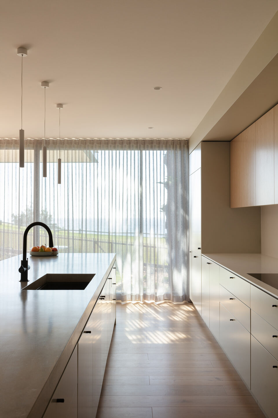 Skupiając się na grze światła oraz prostocie pięknych, neutralnych materiałów, wnętrze Lightwells House doskonale komponuje się z współczesną architekturą plażową. Ciemniejsza fasada z cegły oraz metalowa okładzina zapewniają ochronę przed agresywnymi warunkami słonecznymi i wiltami Oceanu Spokojnego, równocześnie wprowadzając nowoczesny charakter budynku.