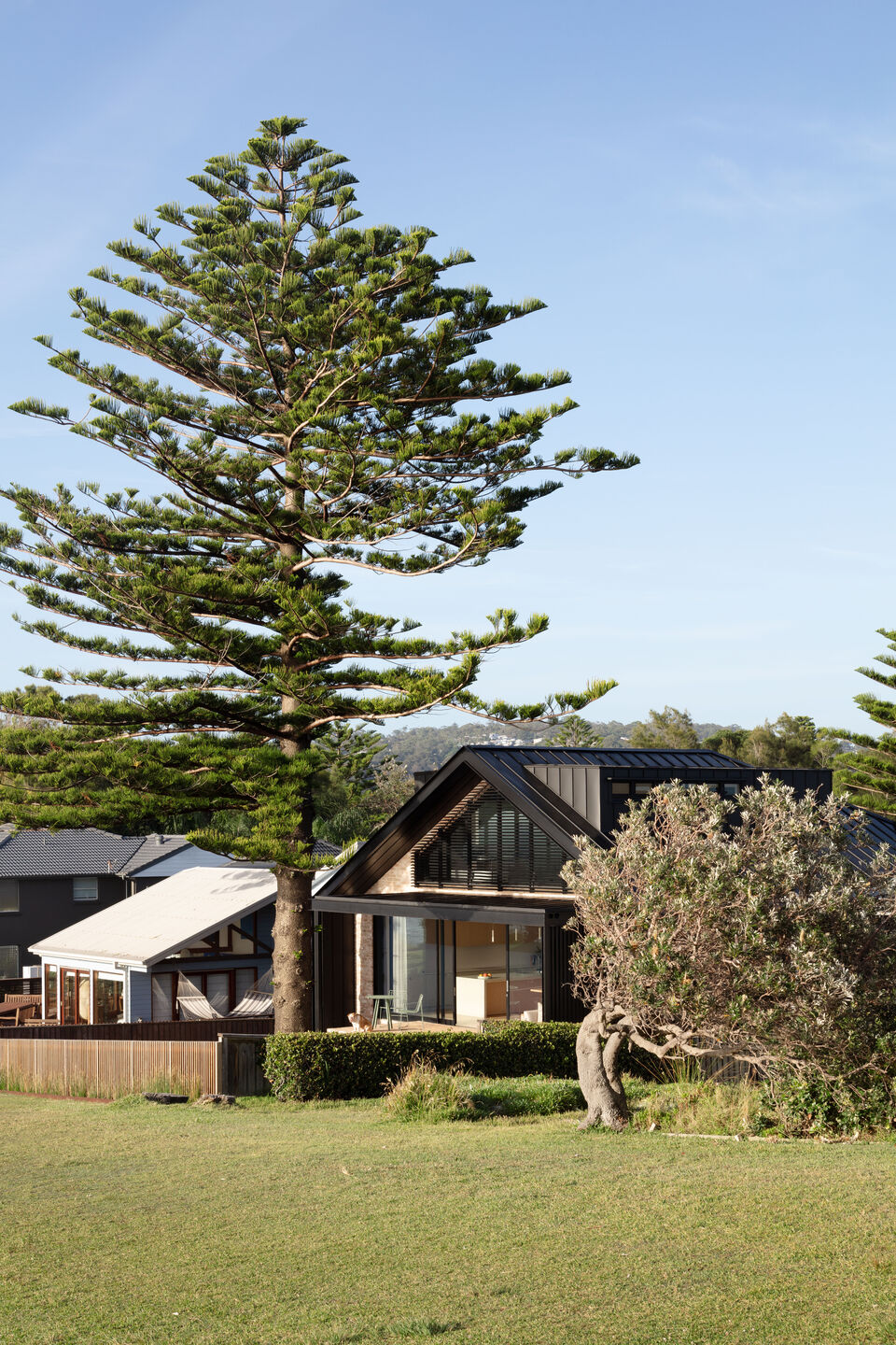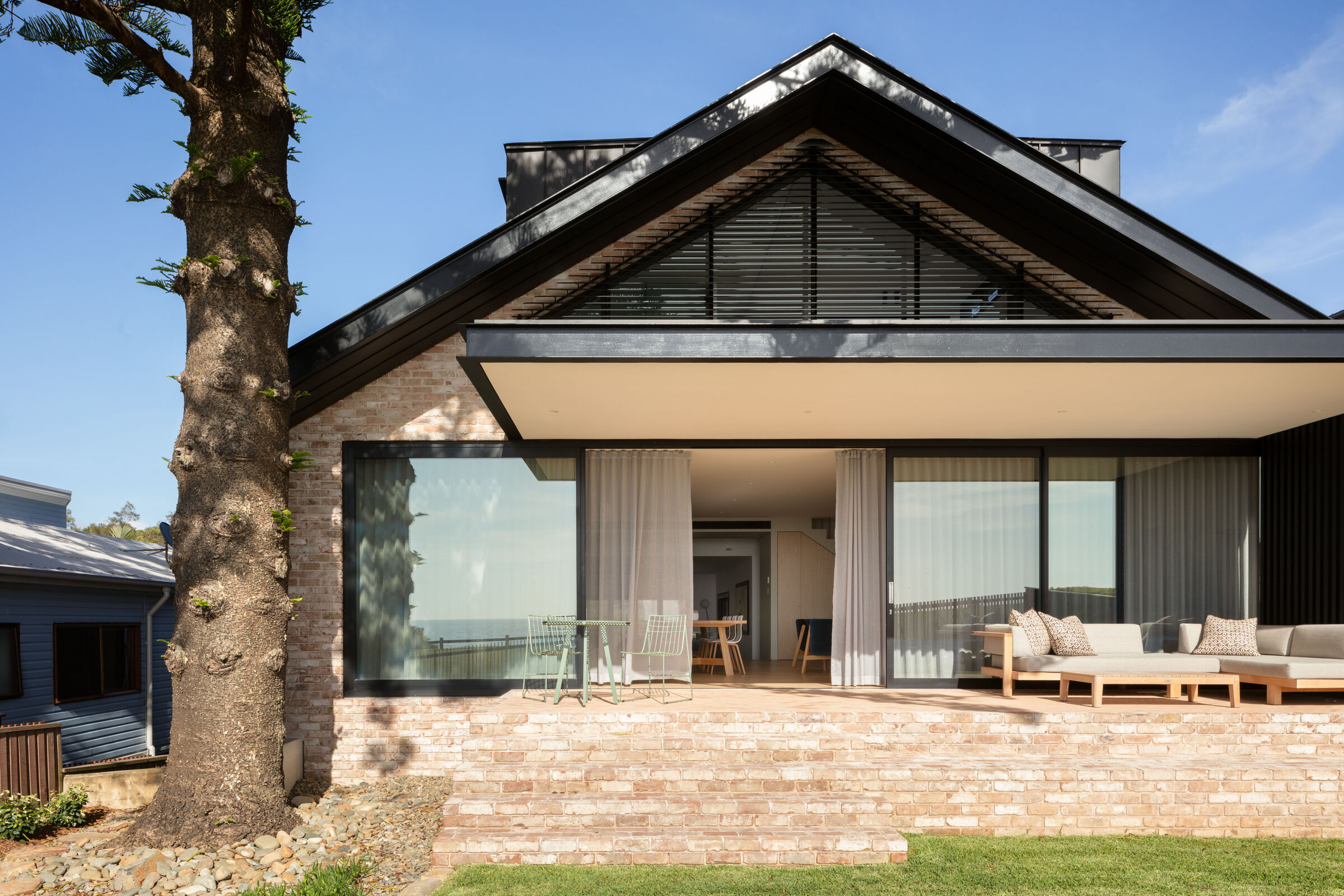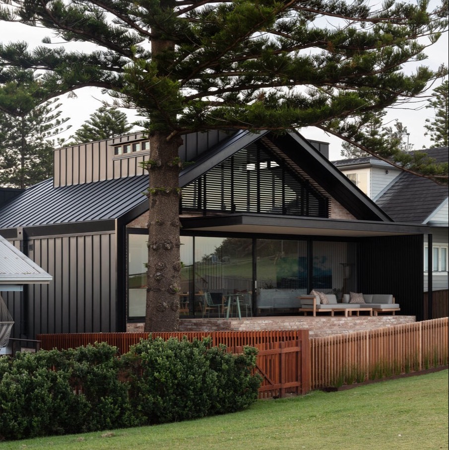 Lightwells House, położony na cyplu północnych plaż Sydney, to przykład doskonałego połączenia kontrastu i zgodności z otoczeniem. Cegła oraz czarny metal nadają nową materialność, podczas gdy skala i forma budynku doskonale wtapiają się w proporcje sąsiednich domów. Projekt ten nie tylko dostosowuje się do wymagań lokalnych, ale także wprowadza nowoczesny charakter w przestrzeń mieszkalną nad oceanem.