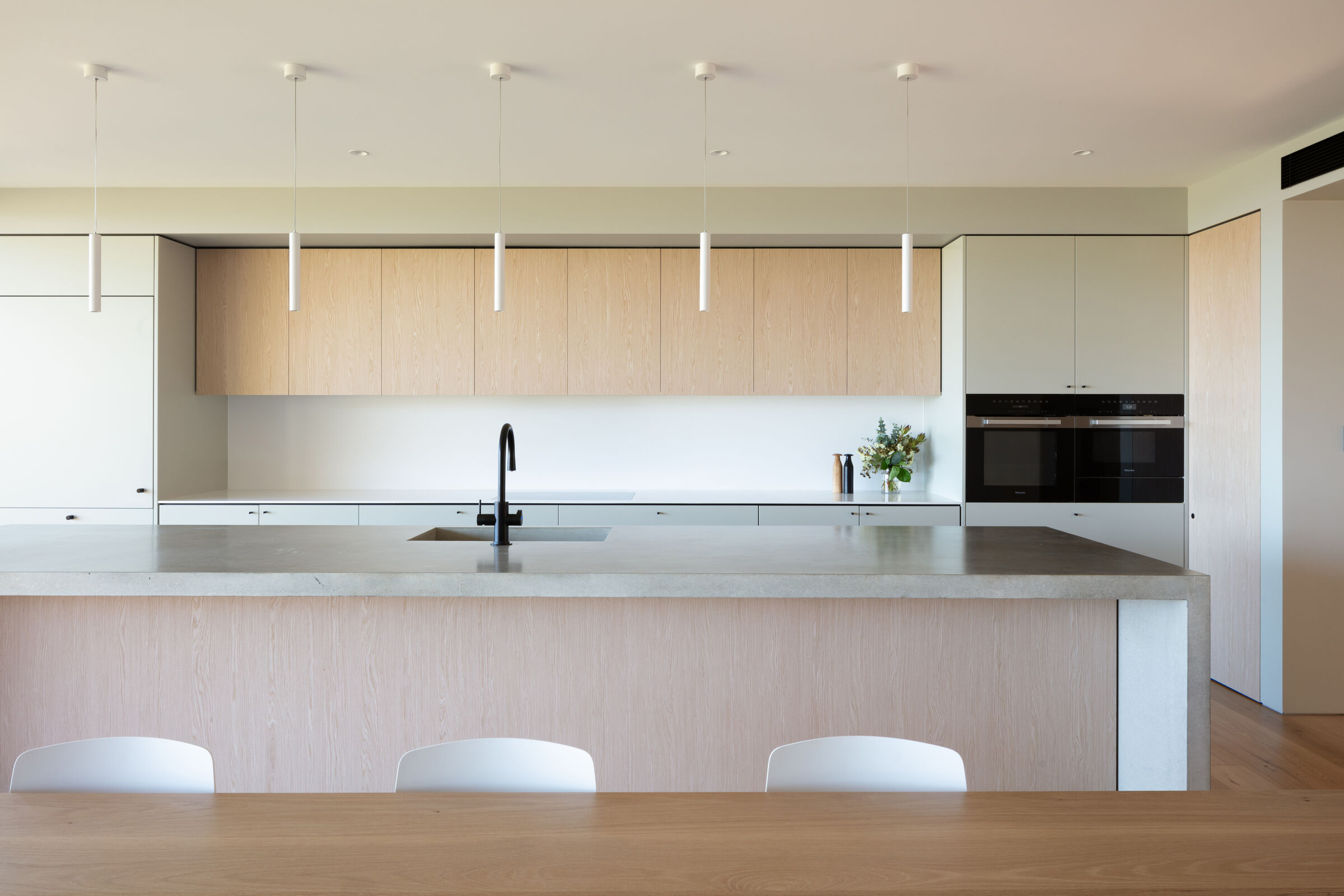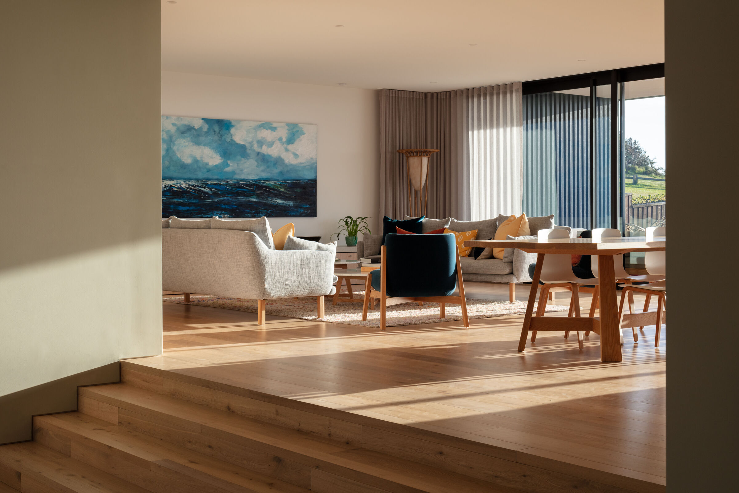 Pierwszym krokiem w transformacji domu było wyburzenie istniejącego salonu, jadalni i kuchni, które były wynikiem kilku renowacji prowadzonych przez różnych właścicieli przez ostatnie 20 lat. Mieszanka dziwnych kształtów i zderzających się estetyk została zastąpiona prostszą formą nowej dobudowy. W efekcie, powstała otwarta, spójna przestrzeń mieszkalna, z jadalnią i kuchnią, która łączy się z istniejącą przednią częścią domu oraz zapewnia wspaniały widok na podwórko i ocean w tle.