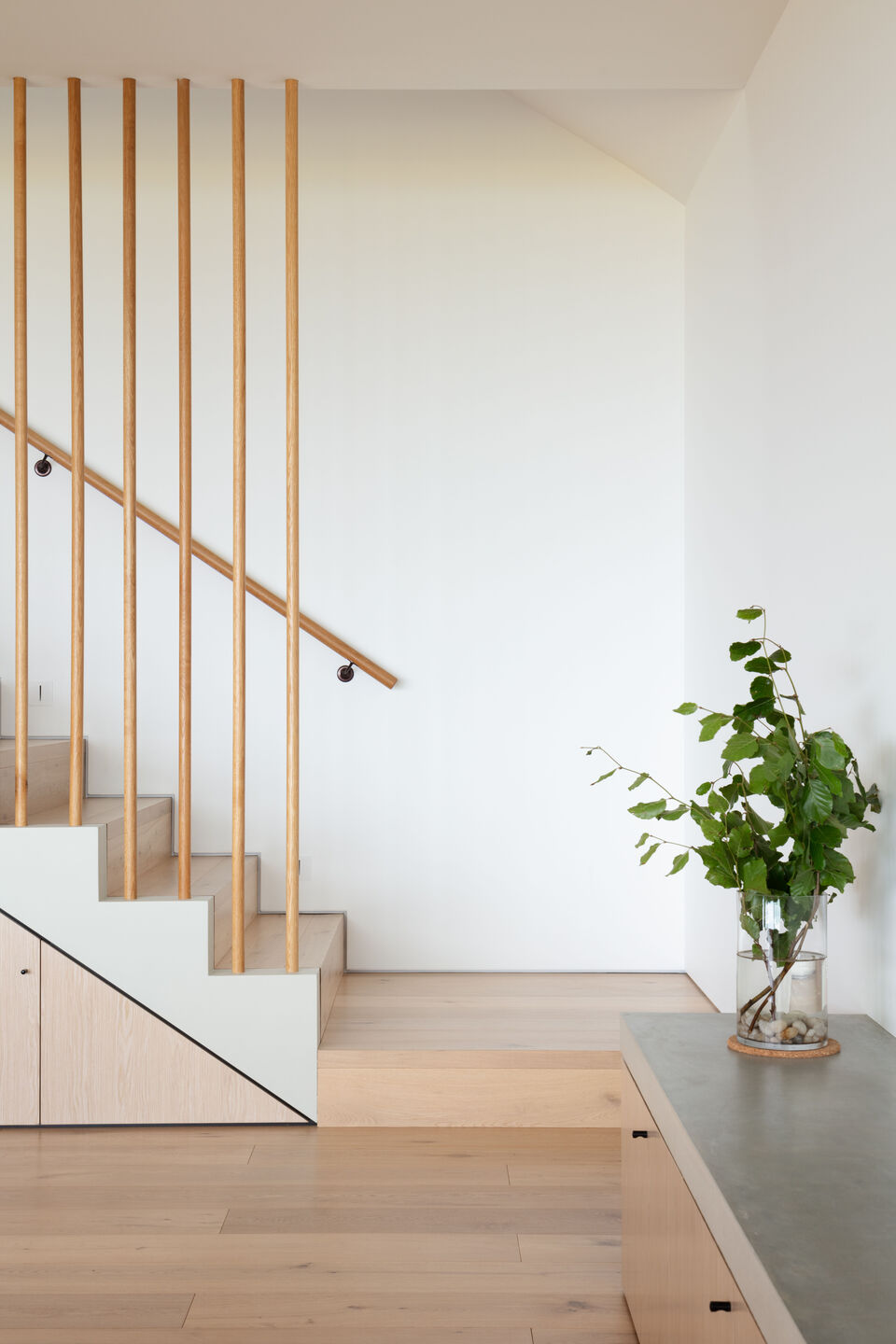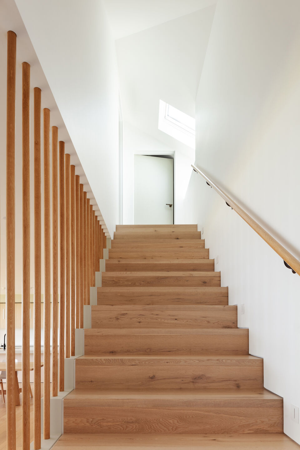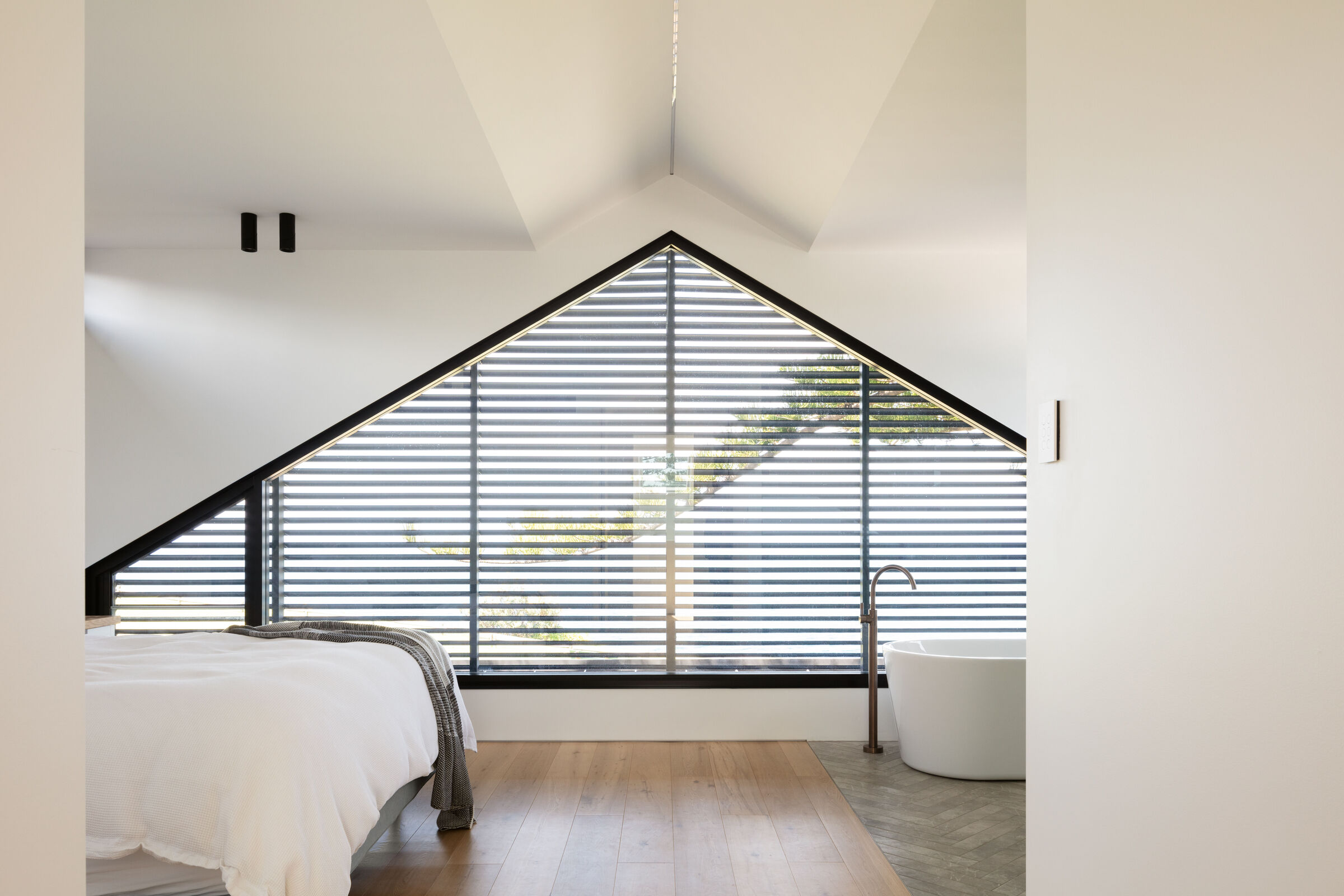 We wnętrzu, projektanci postawili na miękkie materiały, takie jak dębowa podłoga oraz stolarka dębowa. W kuchni zastosowano szafki w delikatnym odcieniu zieleni eukaliptusowej, co wprowadza subtelny naturalny akcent do przestrzeni. Główna przestrzeń mieszkalna została zaprojektowana z wyraźnym podziałem na strefy – stół jadalny oraz krzesła ustawione równolegle do wyspy kuchennej tworzą centralny punkt tej strefy. Na piętrze znajduje się nowa, przestronna łazienka, w której dominują proste materiały – biała wolnostojąca wanna, białe płytki na ścianach i neutralne płytki ułożone w jodełkę na podłodze. Pochyłe okna pozwalają na dostęp naturalnego światła, podążając za linią dachu, a żaluzje zewnętrzne zapewniają dodatkową prywatność.