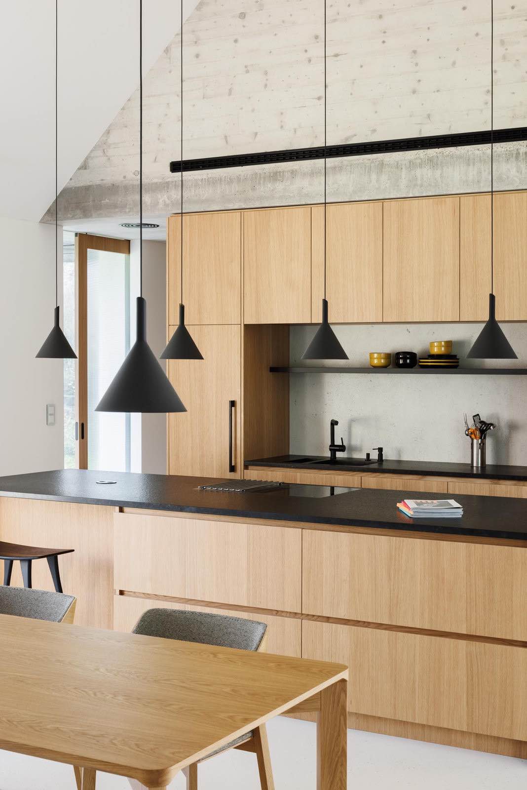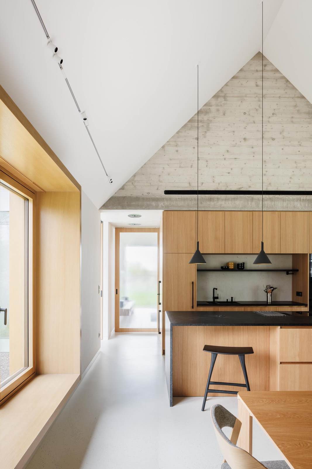 Projekt autorstwa ARCHITEKTI mikulaj & mikulajova opiera się na koncepcji rozczłonkowania programu na kilka mniejszych wolumenów. Zamiast jednego dużego domu powstał zespół trzech wzajemnie powiązanych części, które razem tworzą spójną całość. W pierwszej z nich zlokalizowano garaż na dwa samochody i warsztat, w drugiej – główną część dzienną z salonem, jadalnią oraz sypialnią rodziców, a w trzeciej – osobne skrzydło przeznaczone dla dorastających dzieci.