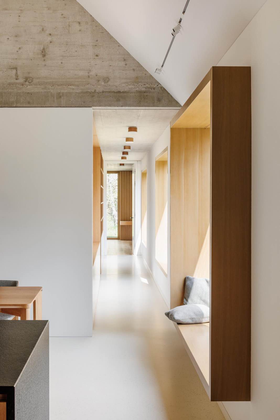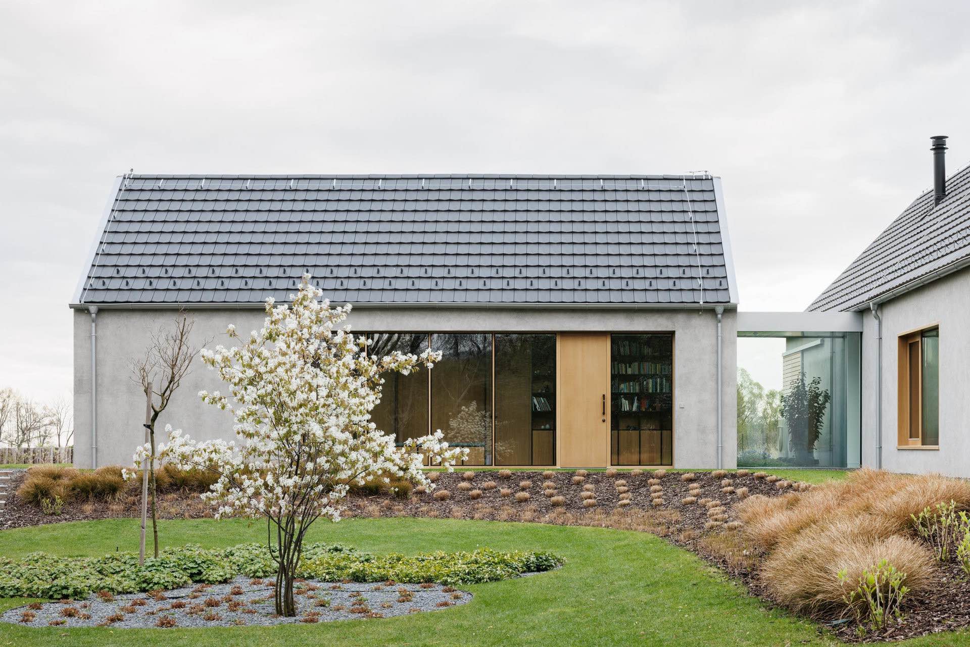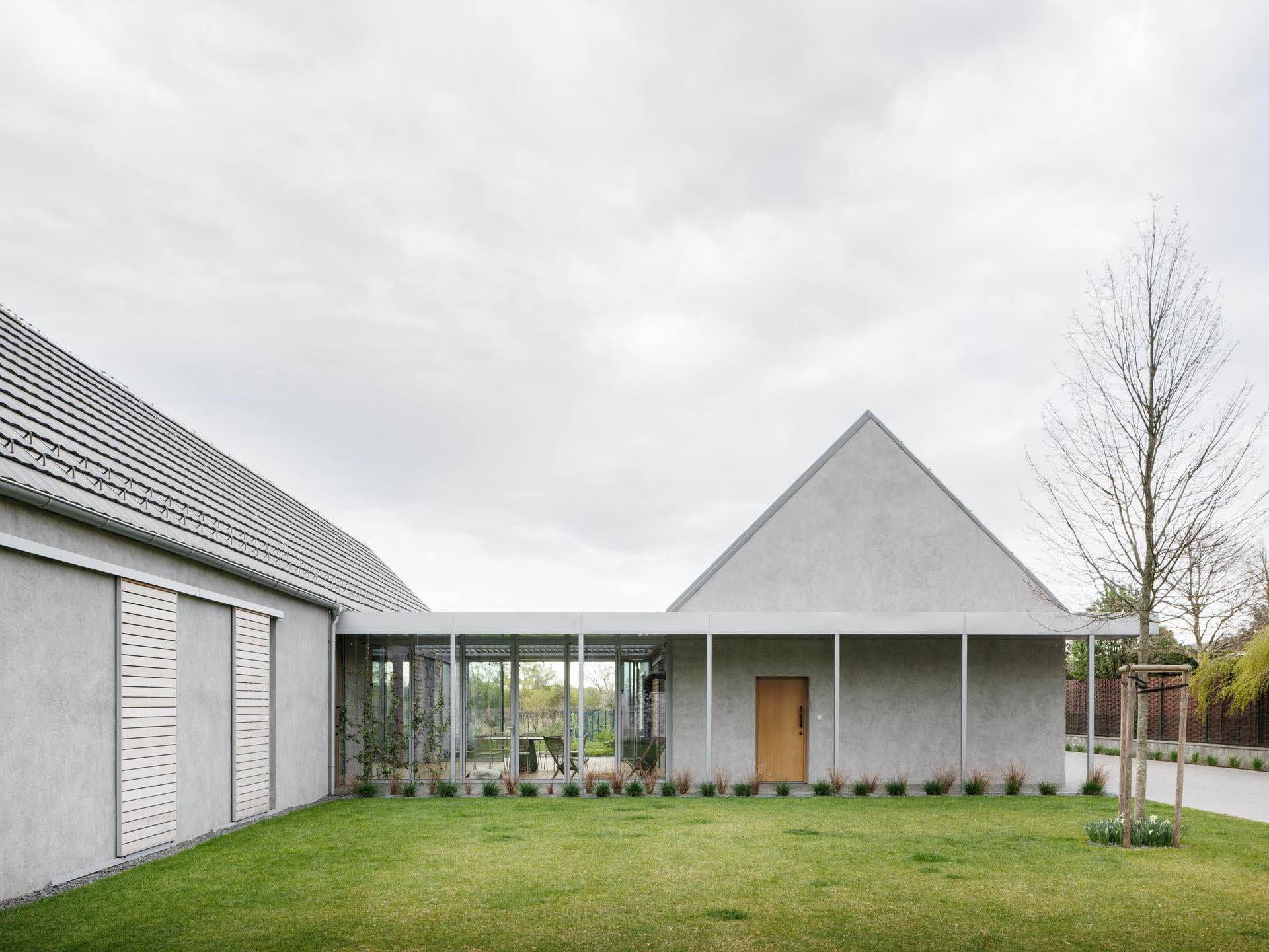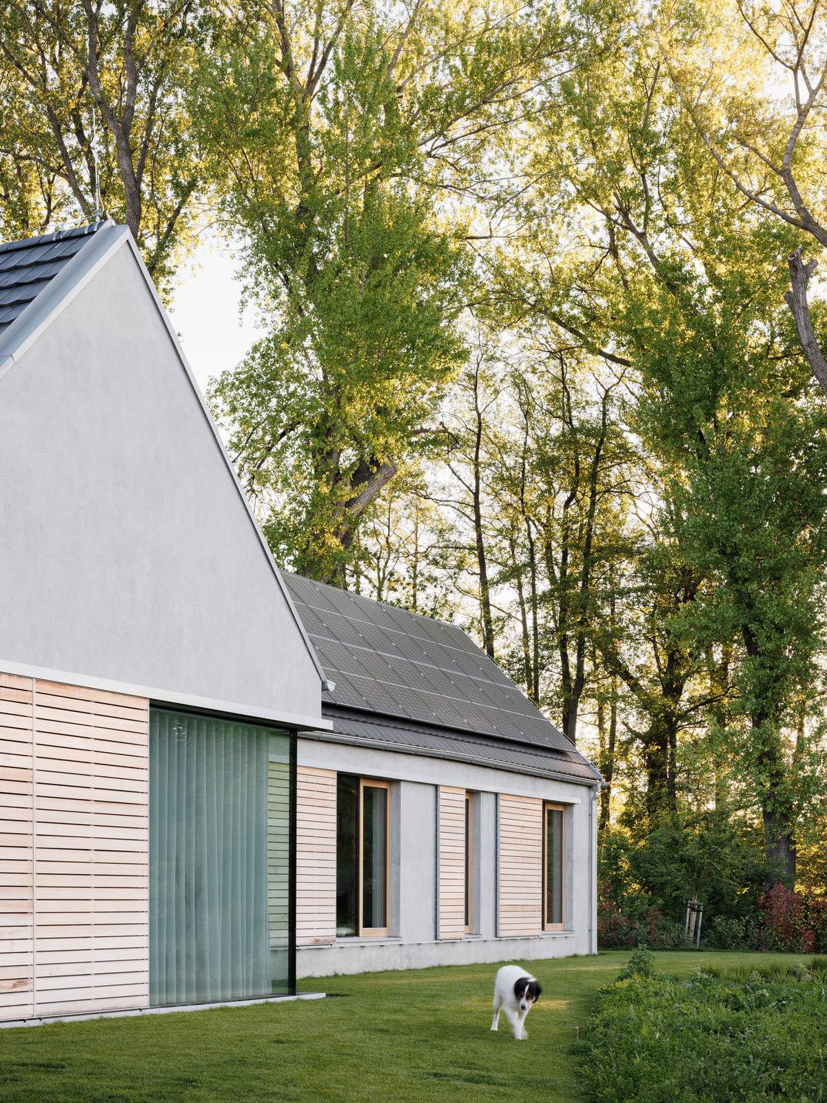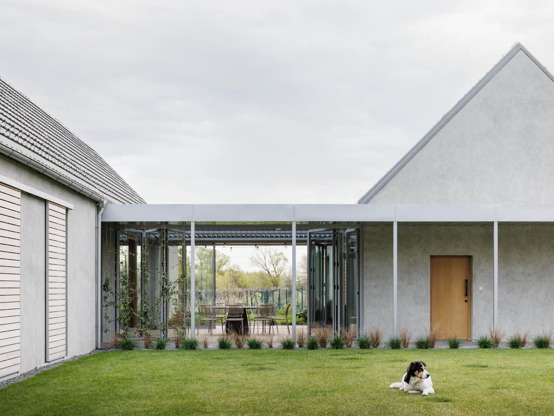 Takie ukształtowanie zabudowy pozwoliło stworzyć trzy różne przestrzenie zewnętrzne, każdą o odmiennym charakterze. Południowy ogród otwiera się na winnice, wschodni – na las i poranne słońce, natomiast zielony dziedziniec wejściowy pełni funkcję półprywatnej strefy przejściowej. Ten rodzaj „miniurbanizmu” nawiązuje do tradycyjnej struktury wsi, gdzie długie domy z dachami dwuspadowymi ustawiane były równolegle na wąskich parcelach.
