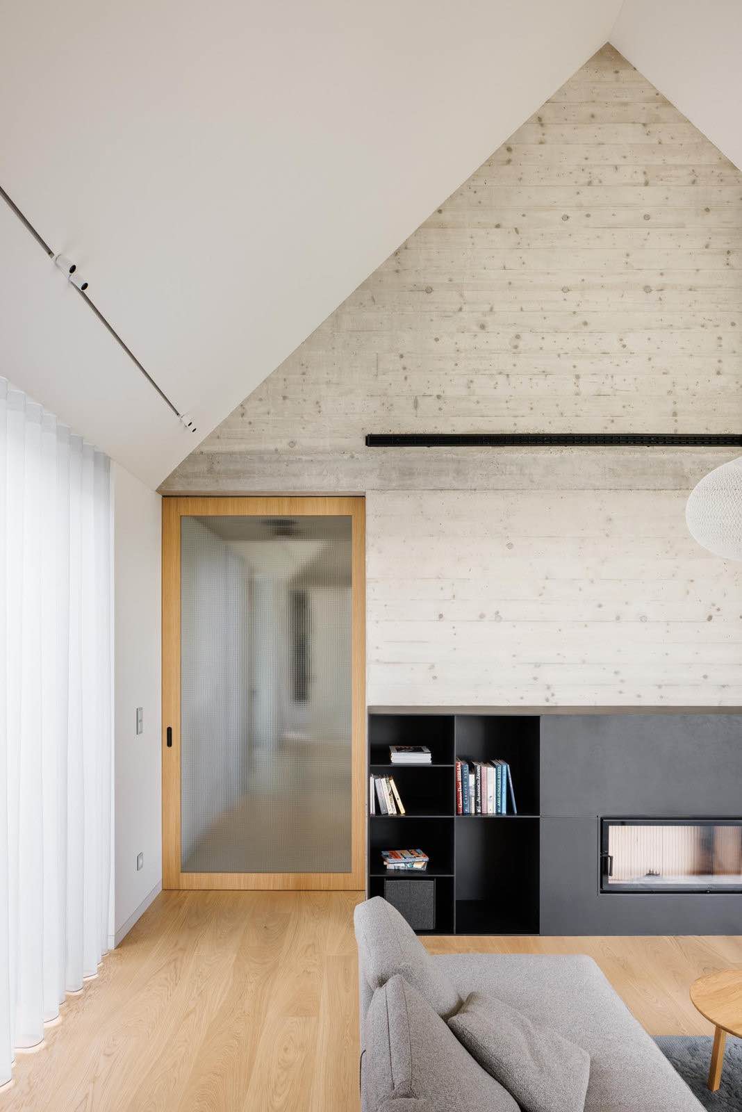Ważnym elementem domu jest zadaszona terasa, która może funkcjonować przez cały rok. Latem pełni rolę letniej kuchni i miejsca spotkań, zimą – po zamknięciu przesuwnymi ścianami szklanymi – zamienia się w ogród zimowy z piecem. Terasa płynnie przechodzi w zadaszone podloubí, przypominające tradycyjny słowacki „gánok” – werandę charakterystyczną dla wiejskich domów regionu.