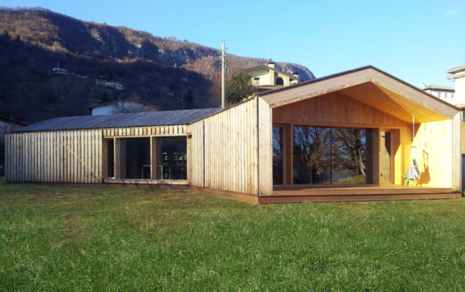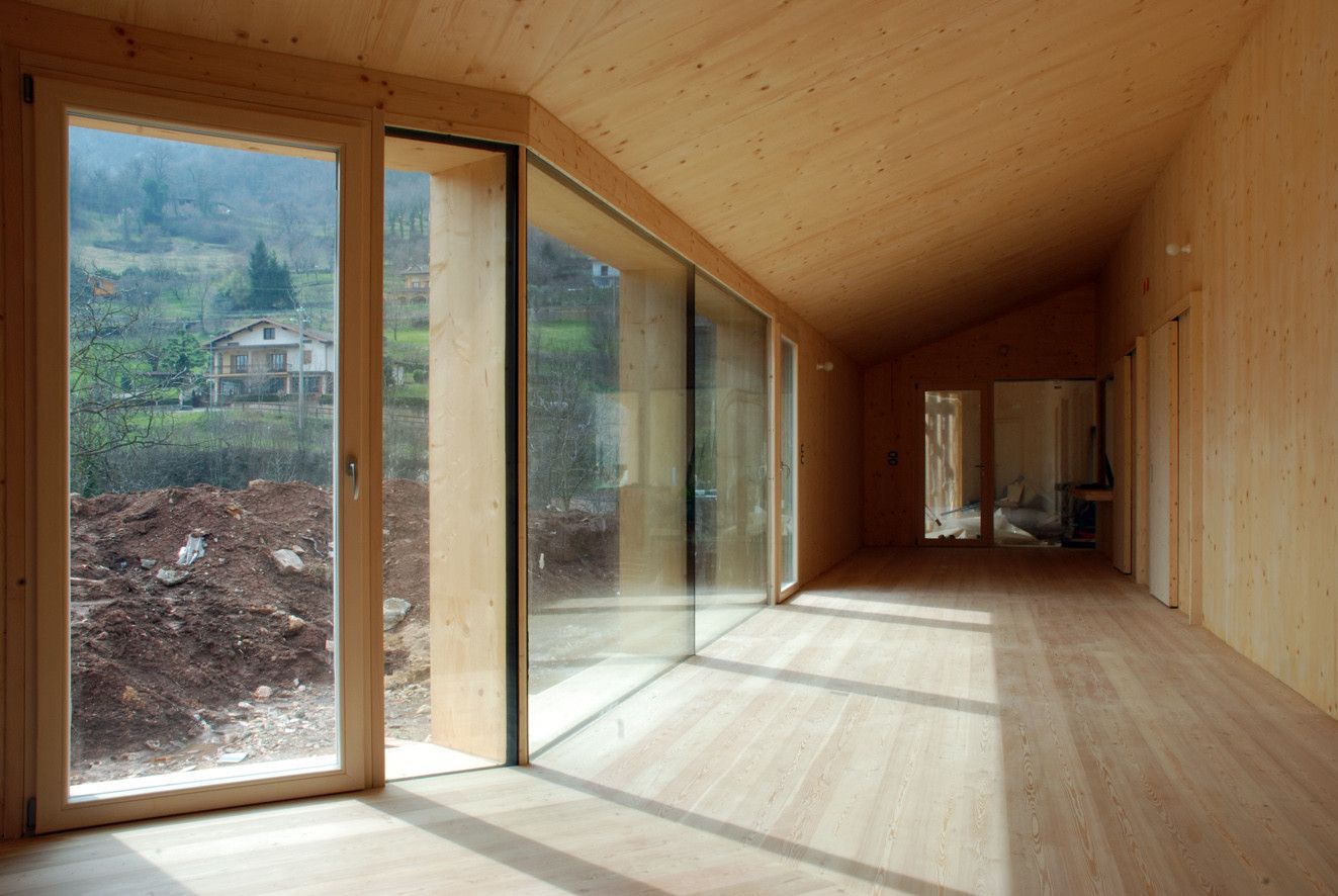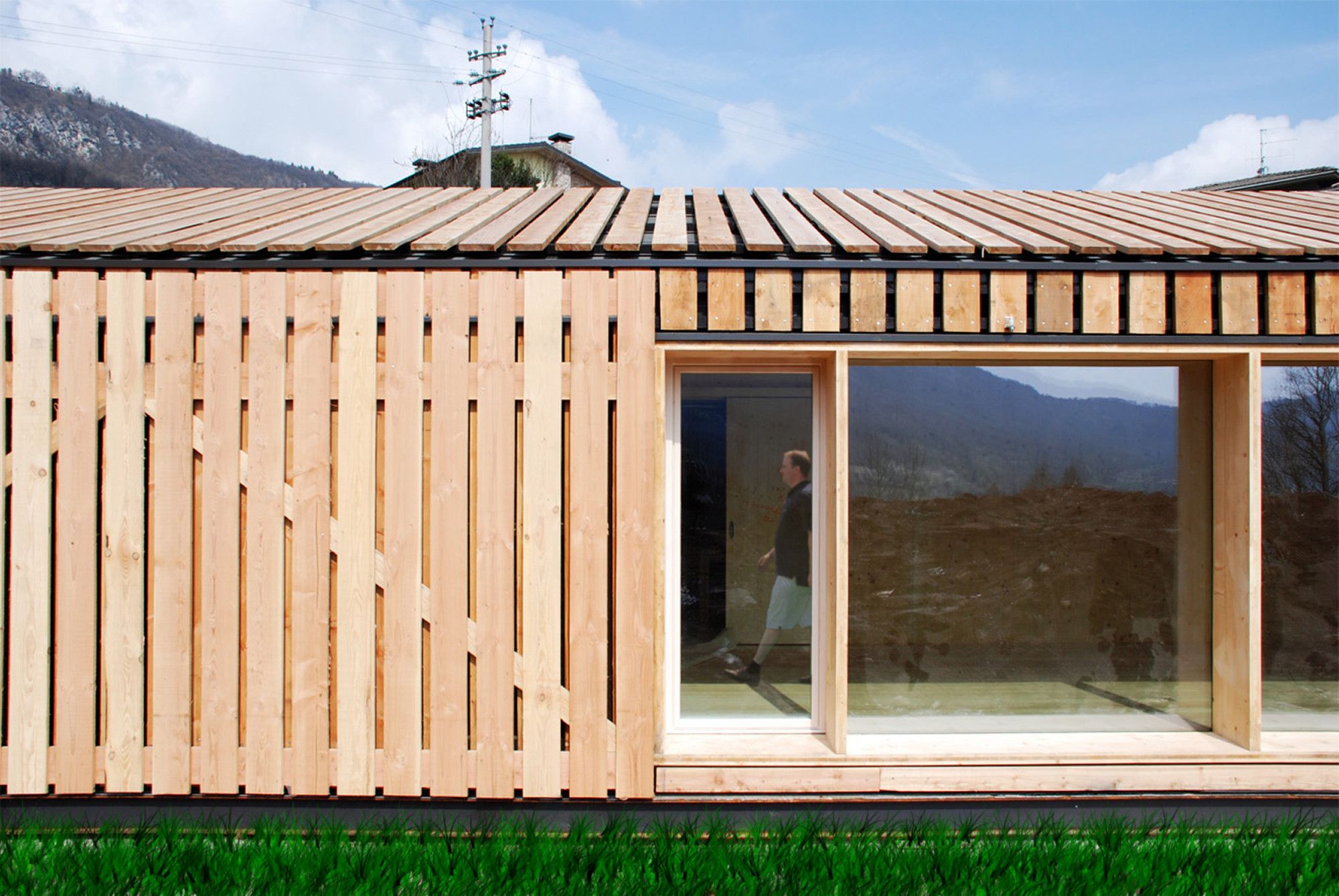 Projekt domu jednorodzinnego w Bione we Włoszech został precyzyjnie dopasowany do wymagającej topografii działki, która opada w kierunku doliny o niemal cztery metry. Klientowi zależało na liniowej, prostej formie budynku oraz minimalnej ingerencji w grunt, bez stosowania dużych ilości żelbetu. Architekci zaprojektowali więc długi, parterowy dom składający się z trzech segmentów, ułożonych zgodnie z naturalnym ukształtowaniem terenu. Częściowe uniesienie budynku nad gruntem pozwoliło na skuteczną izolację podłóg, ochronę przed wilgocią, ograniczenie strat ciepła oraz sprawny drenaż wody opadowej. Forma i układ przestrzenny nawiązują do idei, jaką reprezentuje nowoczesna stodoła – prosta, wydłużona bryła harmonijnie wpisana w krajobraz.