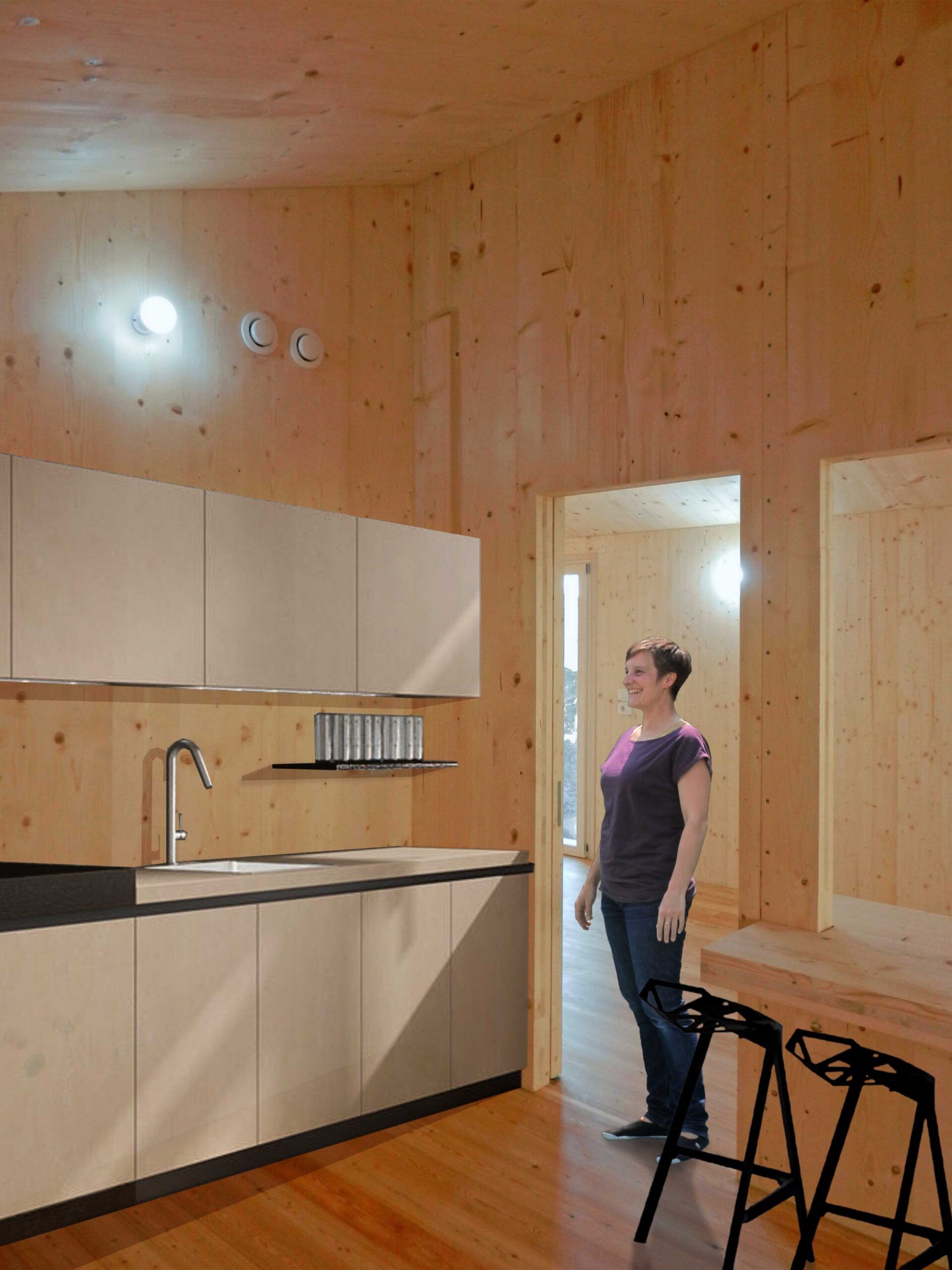 Cała konstrukcja domu została wykonana z pięciowarstwowych paneli X-LAM z drewna świerkowego, które zapewniają wysoką nośność, stabilność i trwałość. Prefabrykowane panele zastosowano w ścianach zewnętrznych, podłogach oraz jako wykończenie elewacji, co znacząco skróciło czas realizacji inwestycji. Projekt opiera się na zasadach domu pasywnego – zastosowano energooszczędne instalacje o szybkim czasie reakcji oraz odnawialne źródła energii tam, gdzie było to możliwe. Architekci świadomie podkreślili surowy charakter konstrukcji, eksponując drewno, naturalne kolory i geometryczne formy. Dom „zrodzony z ziemi i drewna” stanowi przykład współczesnej architektury ekologicznej, w której idea nowoczesnej stodoły łączy technologię, naturę i funkcjonalność.