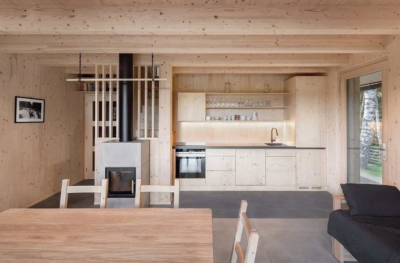 Wnętrze Lipno Lakeside Cabin zostało zaprojektowane tak, by maksymalnie wykorzystać otaczającą przestrzeń i wprowadzić do środka jak najwięcej światła dziennego. Centralnym punktem salonu jest imponujące, kwadratowe okno z widokiem na jezioro oraz odległe szczyty górskie. Naturalne materiały – drewno, kamień i subtelne tekstury – tworzą ciepłą, przytulną atmosferę, wpisującą się w ducha otaczającego lasu.